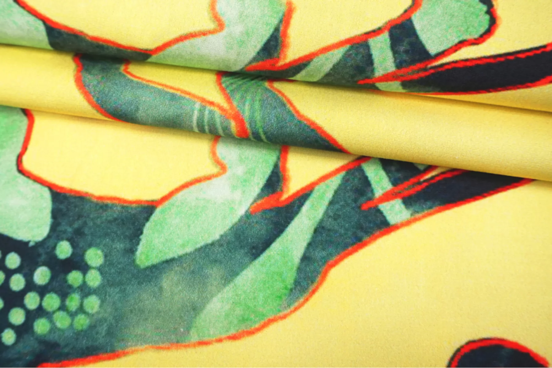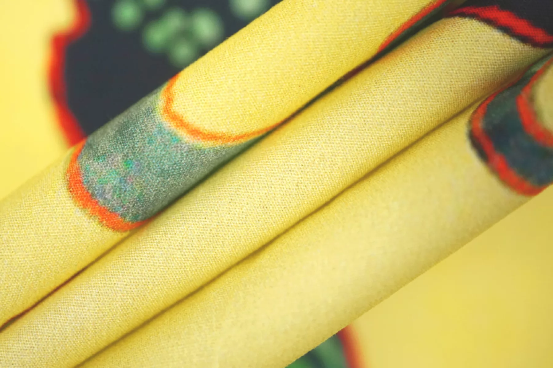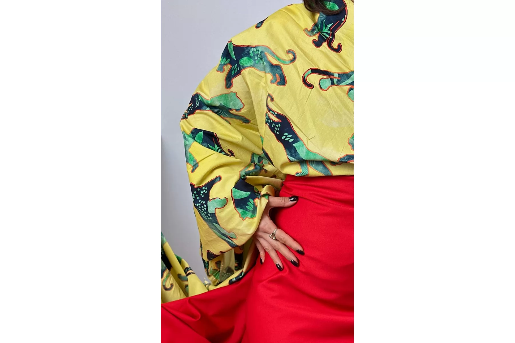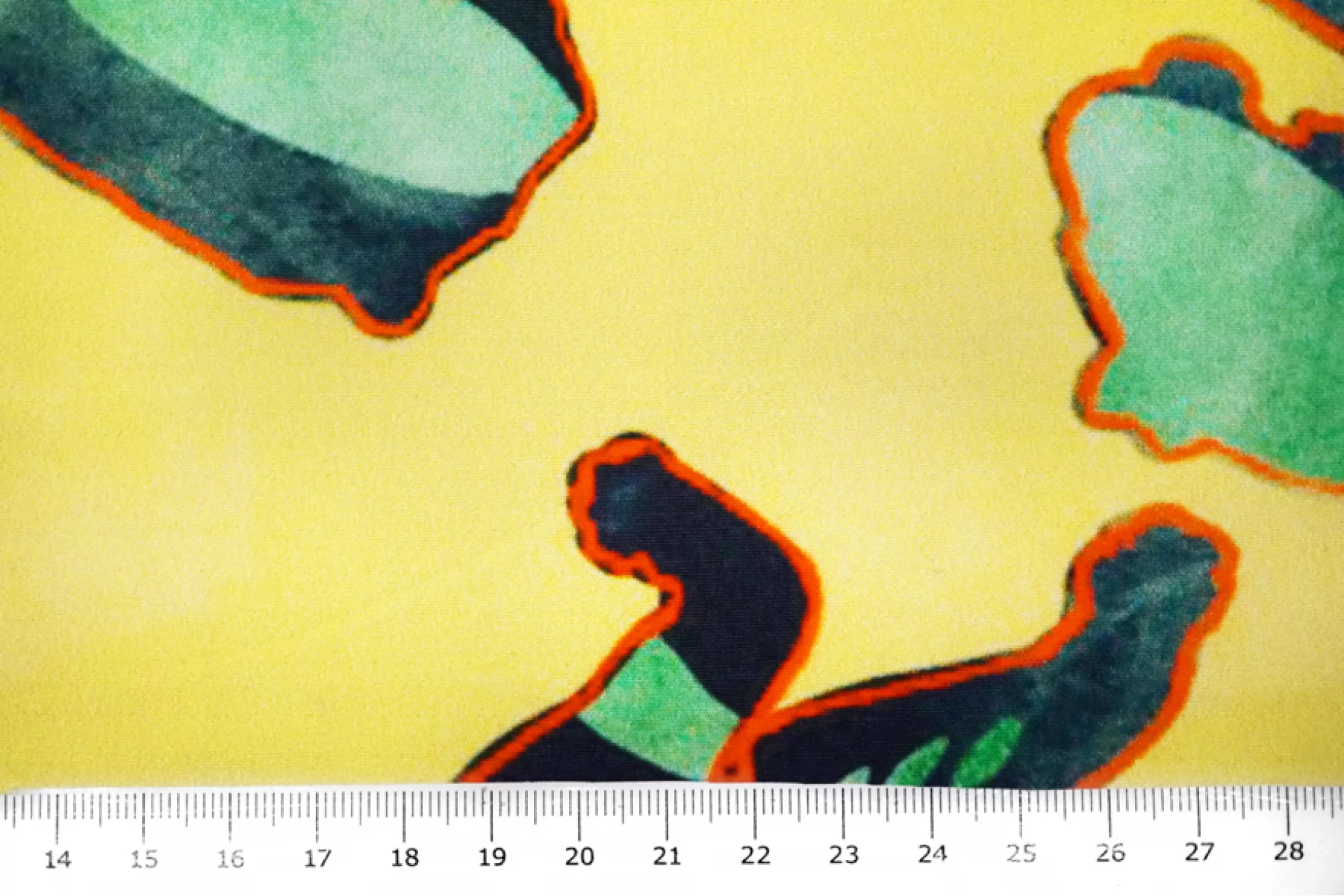 Необычная позиция - рубашечный хлопок с интересным и достаточно крупным принтом на желтом фоне в виде силуэтов хищников с ярким красным контуром, заполненных абстрактным тропическим фоном. Материал похрустывающий, не тянется, немного мнется. Тонкий, но плотный. Очень хорошо держит форму. Слегка заметен контур силуэта, если смотреть прямо на просвет. Отличный вариант на платья и рубашки.