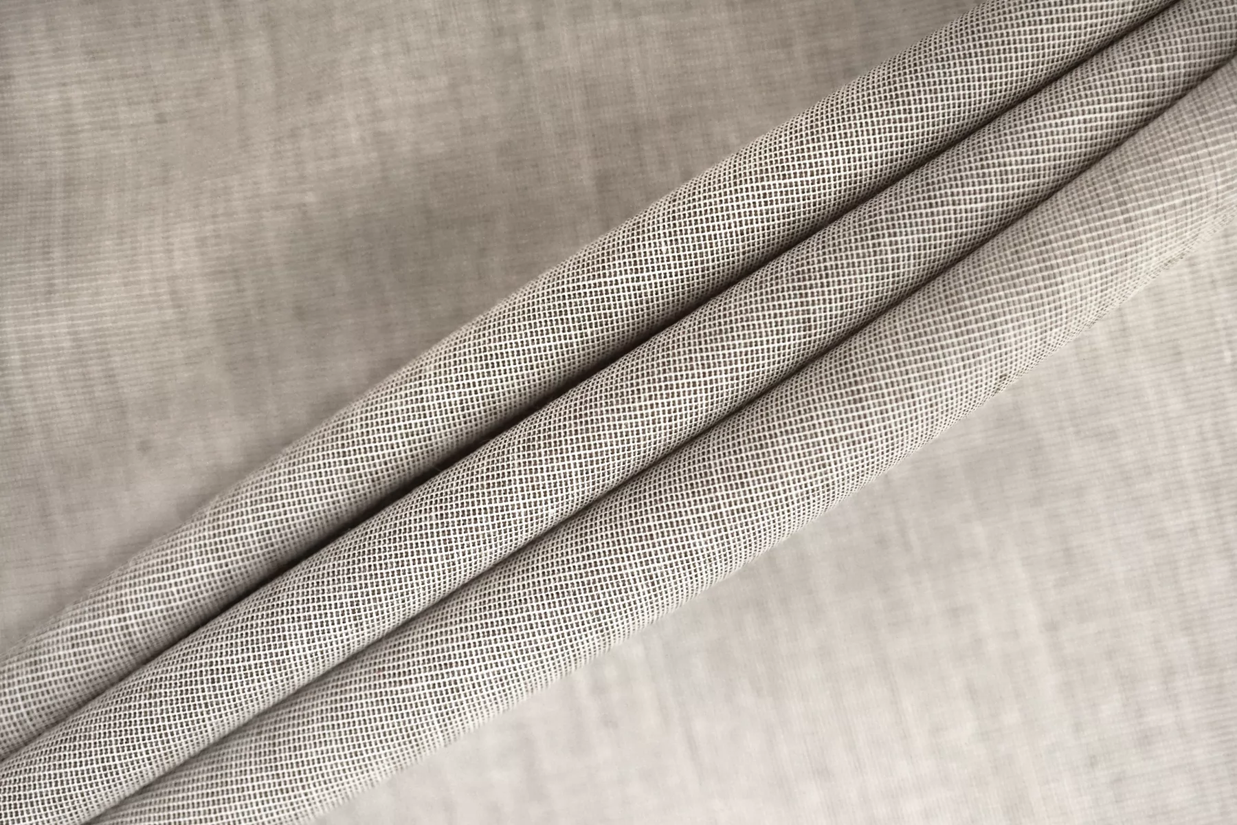 Рубашечный хлопок с лиоцеллом полотняного плетения, из нитей молочно-белого и бежево-коричневого цвета. Довольно мягкий, пластичный, не очень плотный. Умеренно сминается. Не тянется, немного просвечивает. Подойдет на рубашки, платья, юбки.