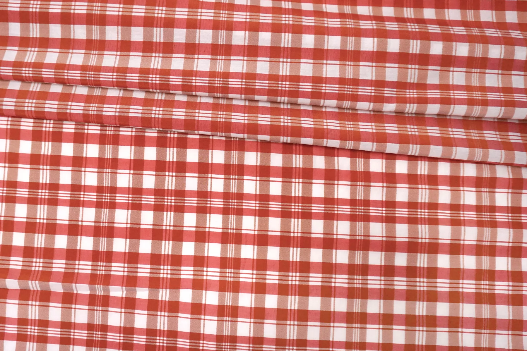 Рубашечный хлопок с шелком в среднюю клетку, нити белого, ягодного и красного цвета. Очень приятный, мягкий, гладкий, тонкий. Обладает красивым легким шелковым блеском. Просвечивает. Отлично драпируется и слегка держит форму. Не тянется. Сминается. Вариант на блузки, платья, юбки и не только. При необходимости используем подкладочный материал. Уход за материалом деликатный.