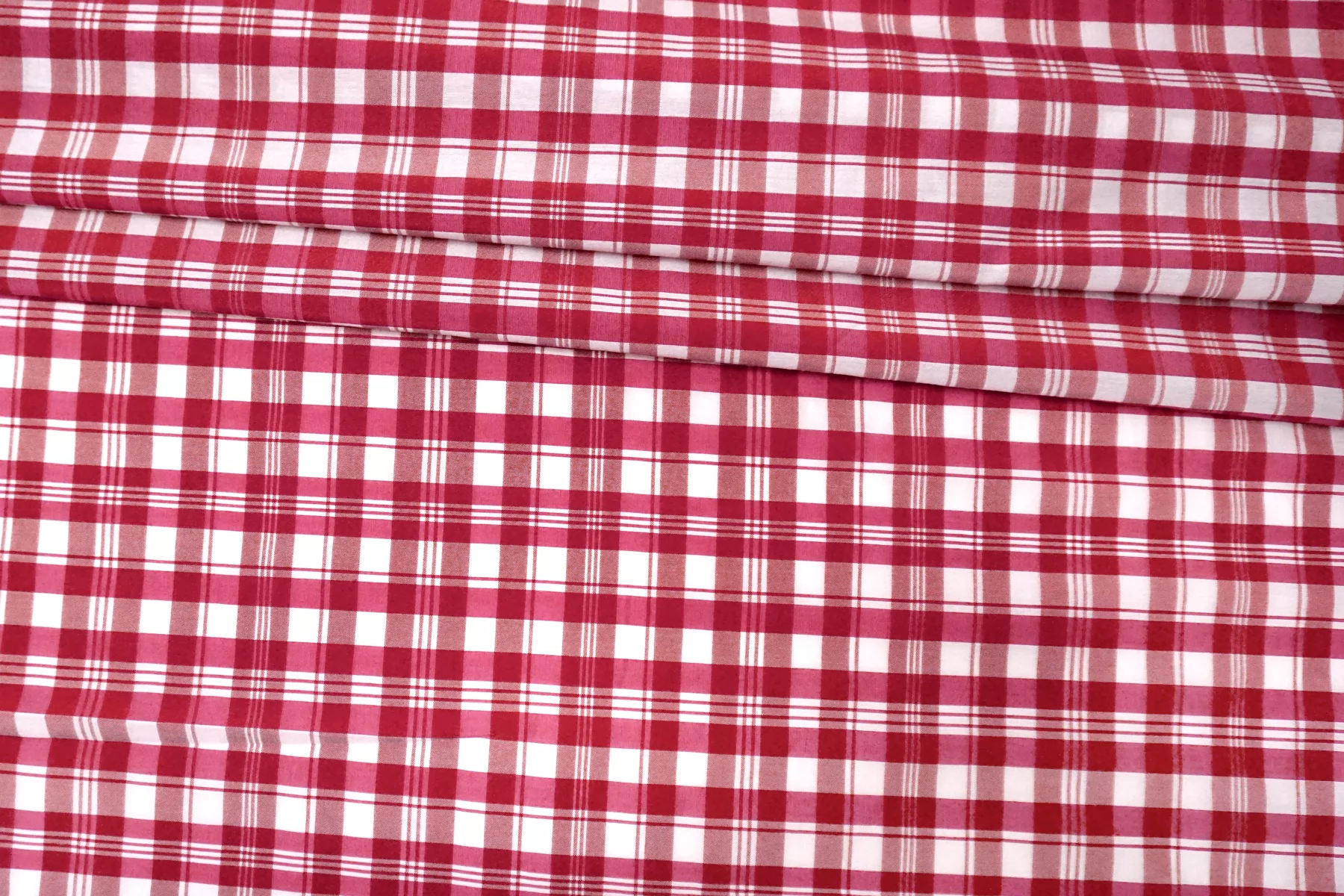 Рубашечный хлопок с шелком в среднюю клетку, нити белого, ягодно-красного и малинового цвета. Очень приятный, мягкий, гладкий, тонкий. Обладает красивым легким шелковым блеском. Просвечивает. Отлично драпируется и слегка держит форму. Не тянется. Сминается. Вариант на блузки, платья, юбки и не только. При необходимости используем подкладочный материал. Уход за материалом деликатный.