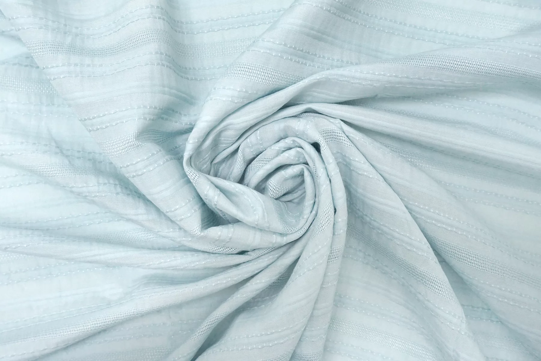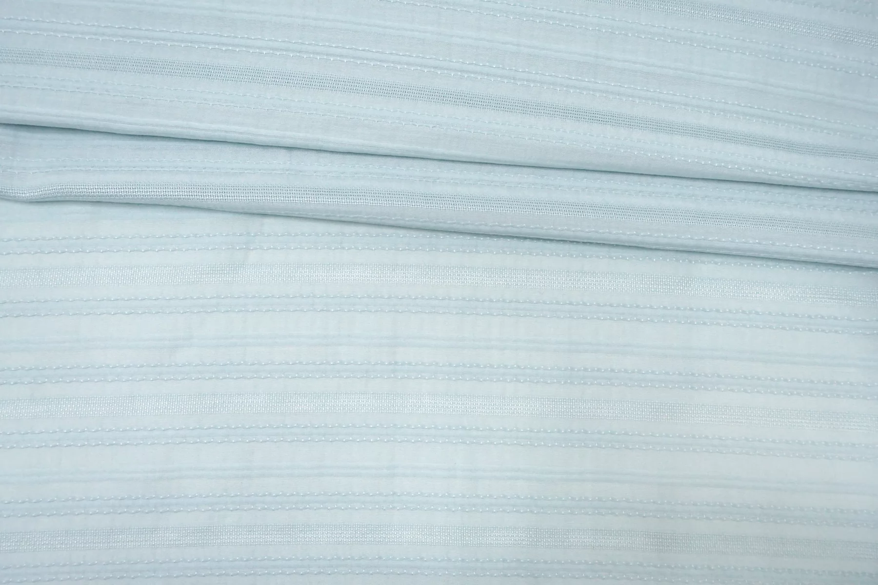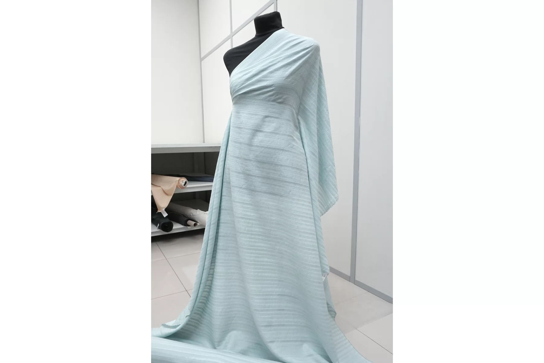 Рубашечный хлопок с шёлком, плотность близка к батистовой, в нежном голубом цвете (с жаккардовой полоской). Мягкий, тонкий, приятный, легкий, летящий. Сминается. Не тянется. Просвечивает. Хорошо драпируется, форму держит слабо. Пластичный. На рубашки, платья, юбки, сарафаны и не только. При необходимости используйте подкладочный материал.