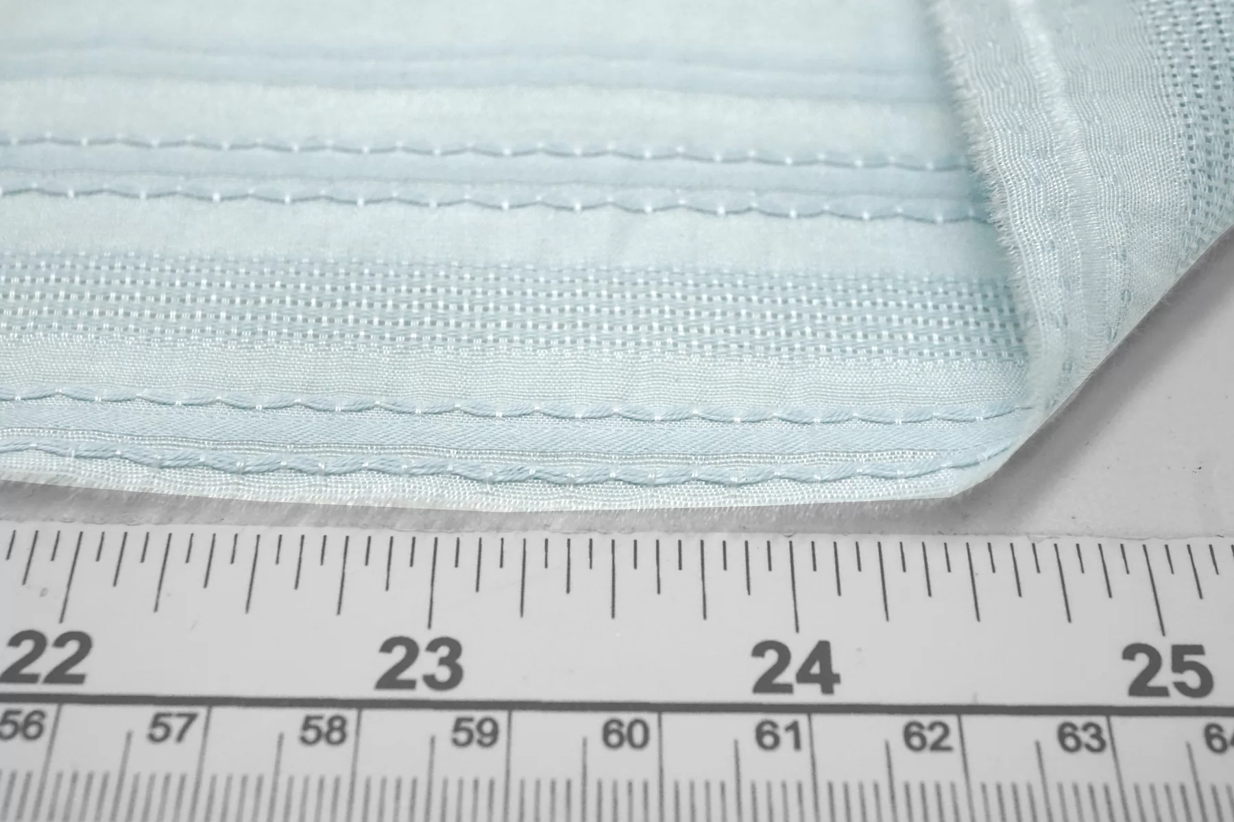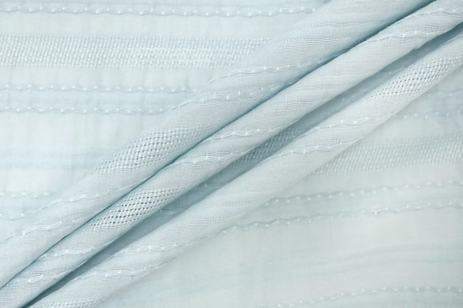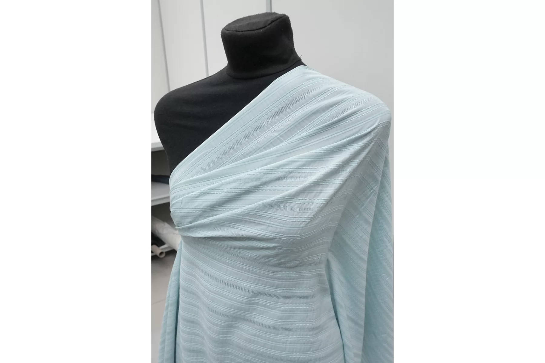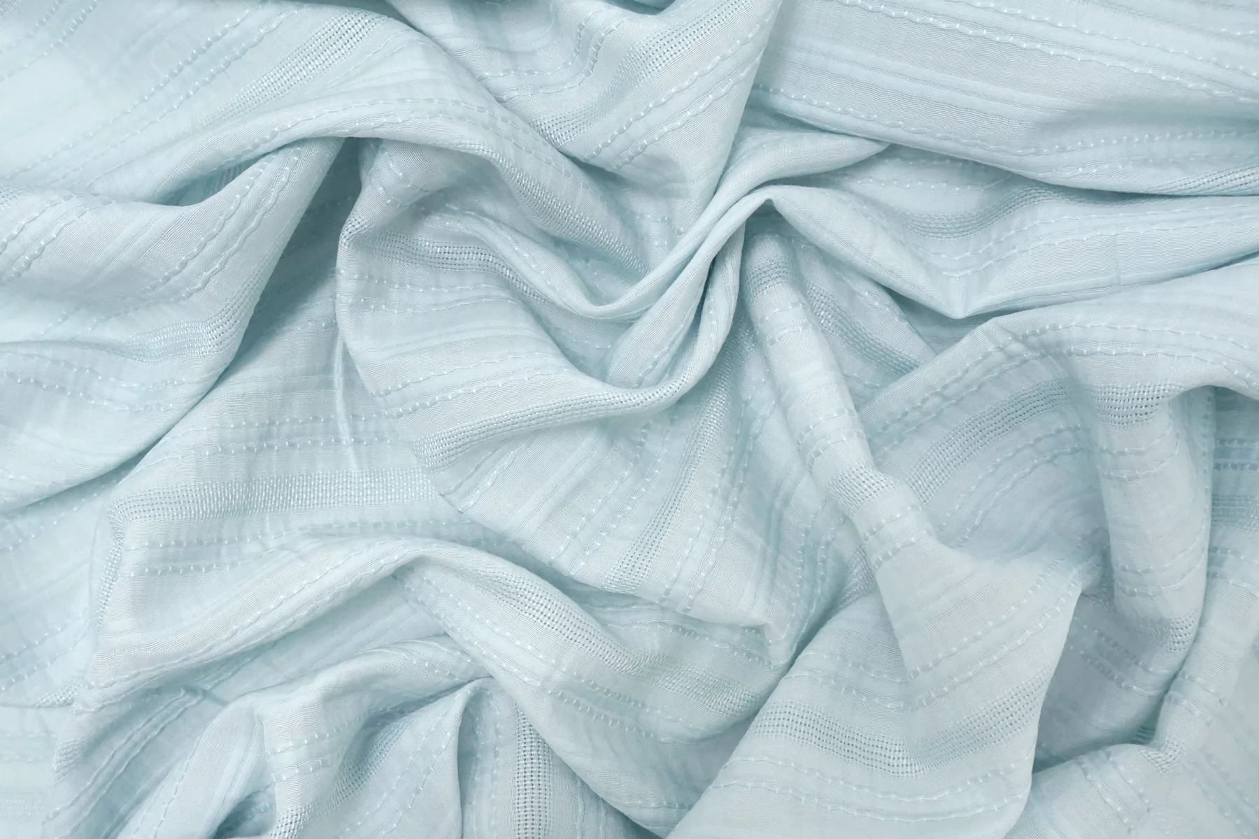 Рубашечный хлопок с шёлком, плотность близка к батистовой, в нежном голубом цвете (с жаккардовой полоской). Мягкий, тонкий, приятный, легкий, летящий. Сминается. Не тянется. Просвечивает. Хорошо драпируется, форму держит слабо. Пластичный. На рубашки, платья, юбки, сарафаны и не только. При необходимости используйте подкладочный материал.