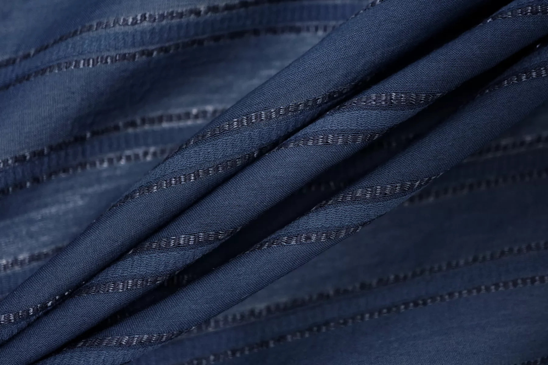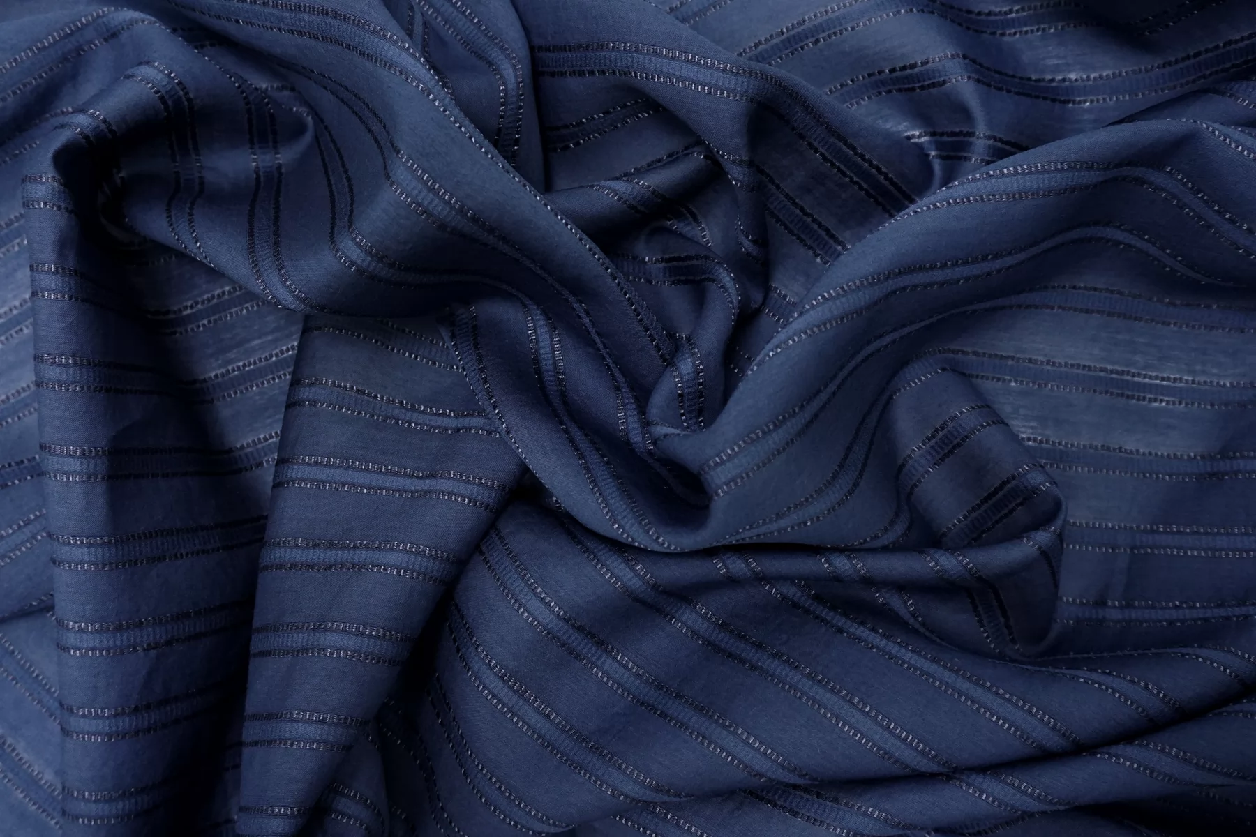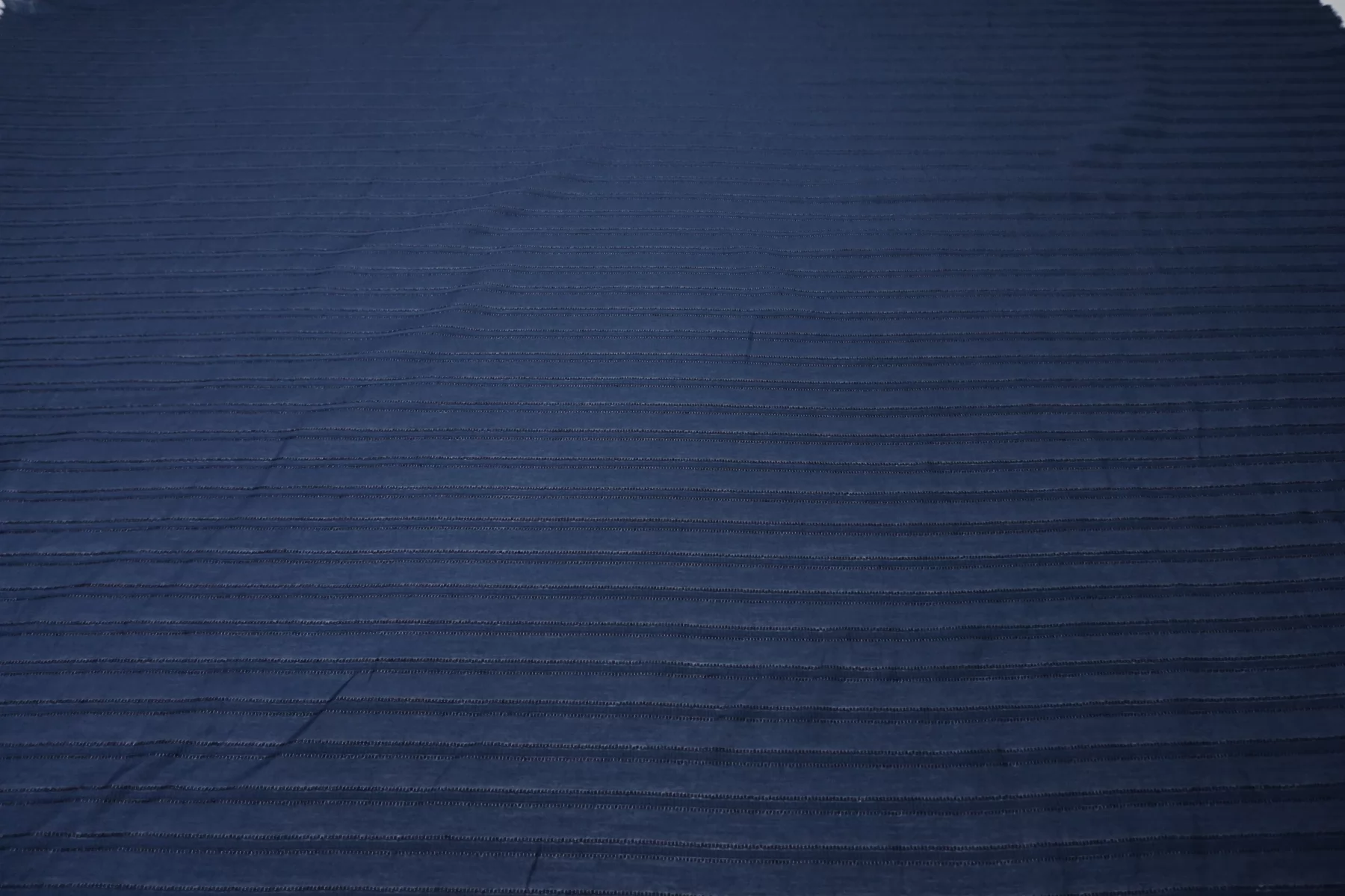 ВНИМАНИЕ!! На местах где полосы жаккарда по всему полотну в хаотичном порядке встречаются еле заметные уплотнения, нитки и зацепки см. фото. Рубашечный хлопок с шёлком, плотность ближе к рубашечной, в приглушённом синем цвете (с жаккардовой полоской поперек кромки). Мягкий, тонкий, приятный, легкий, летящий. Сминается. Не тянется. Просвечивает . Хорошо драпируется, форму держит слабо. Пластичный. На рубашки, платья, юбки, сарафаны и не только. При необходимости используйте подкладочный материал.