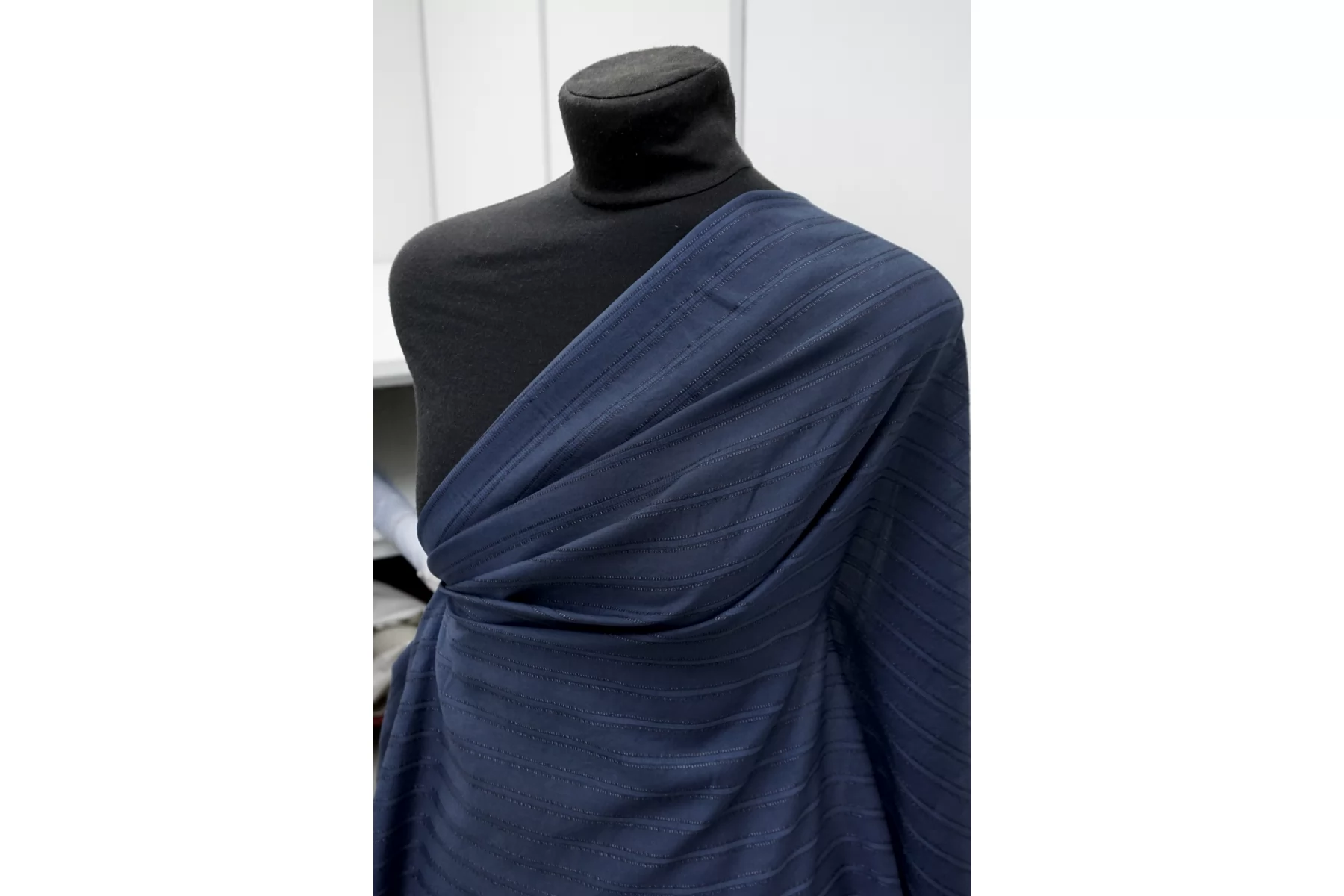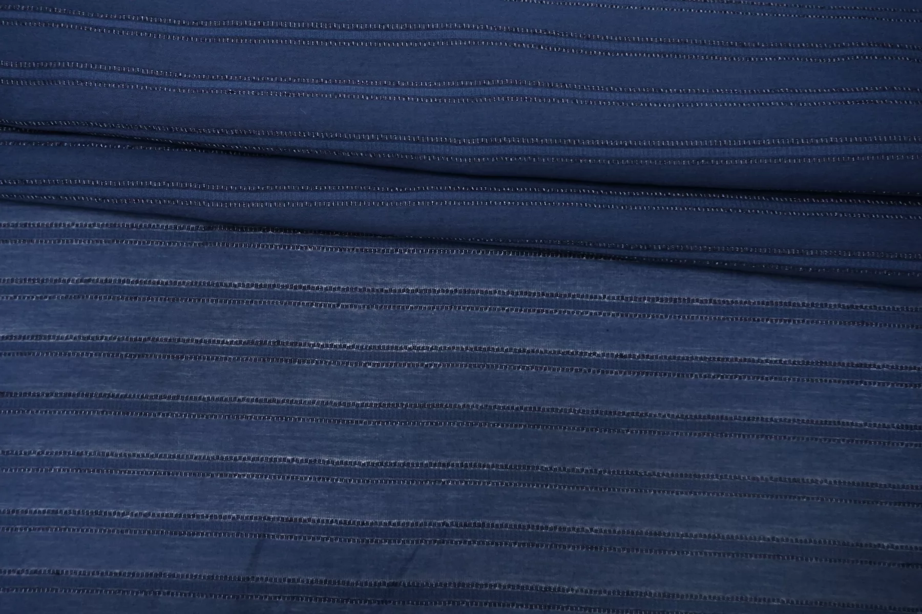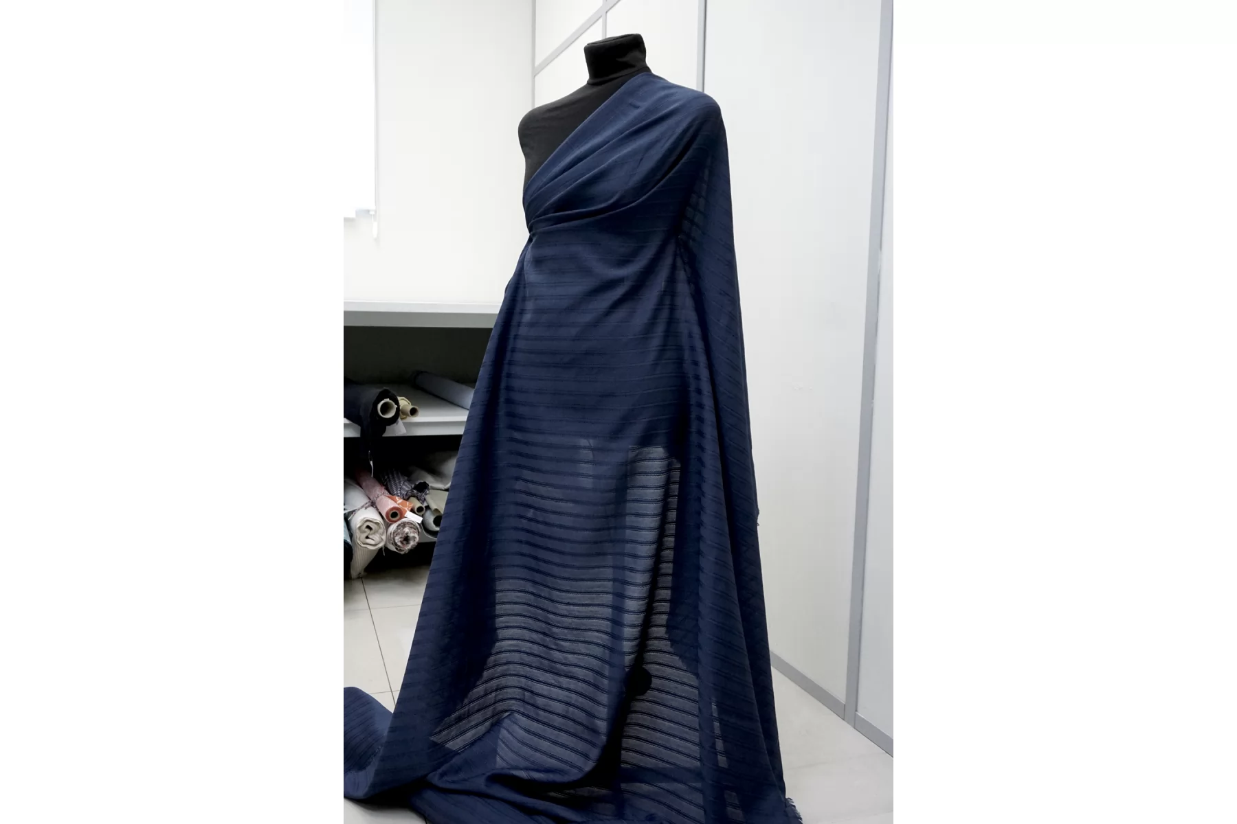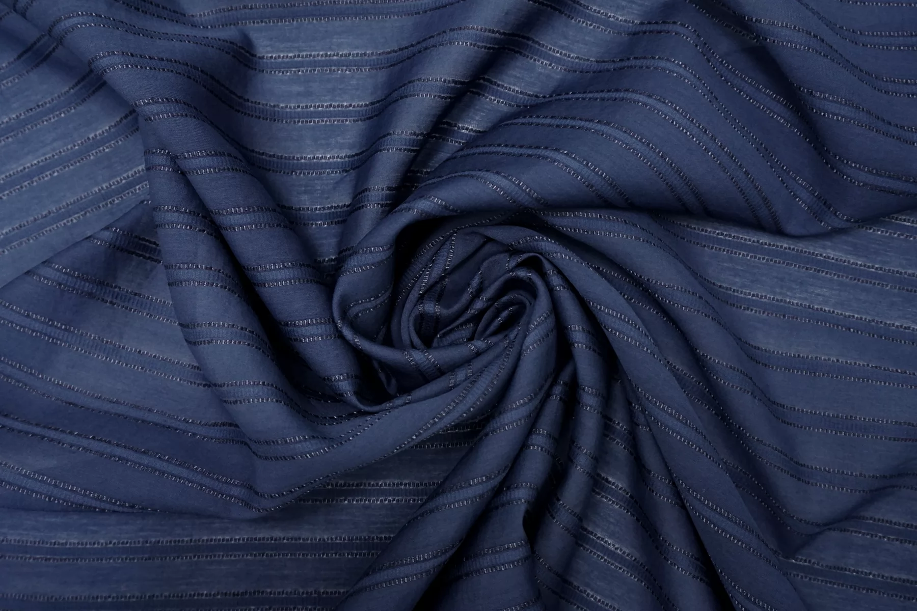 ВНИМАНИЕ!! На местах где полосы жаккарда по всему полотну в хаотичном порядке встречаются еле заметные уплотнения, нитки и зацепки см. фото. Рубашечный хлопок с шёлком, плотность ближе к рубашечной, в приглушённом синем цвете (с жаккардовой полоской поперек кромки). Мягкий, тонкий, приятный, легкий, летящий. Сминается. Не тянется. Просвечивает . Хорошо драпируется, форму держит слабо. Пластичный. На рубашки, платья, юбки, сарафаны и не только. При необходимости используйте подкладочный материал.