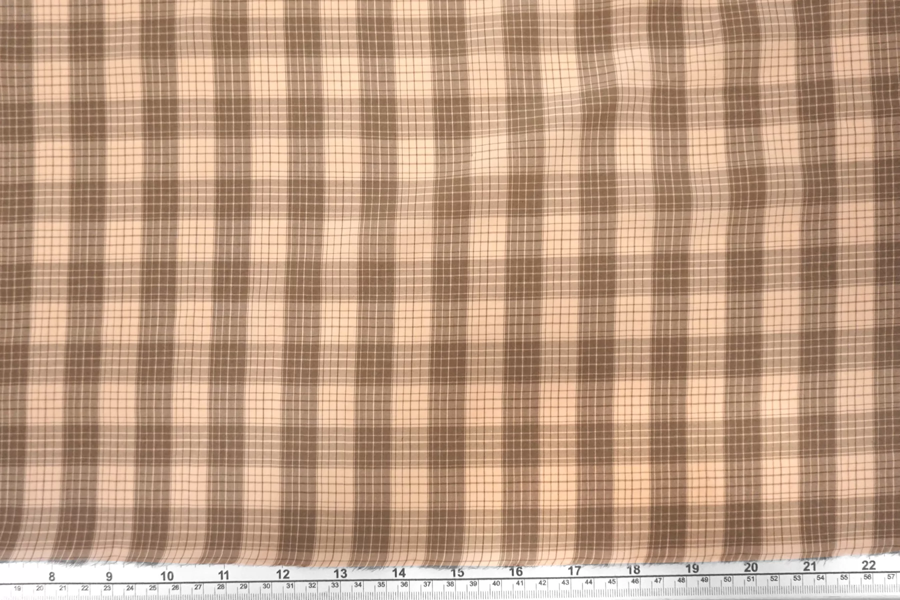 Очень классный рубашечный хлопок с вискозой в клетку, нити персиково-бежевого и тёмно-бежевого цвета. Тактильно скользящий, мягкий, тонкий. Не тянется. Просвечивает силуэт. Сминается. Пестрый вариант на рубашки, юбки, платья и не только.