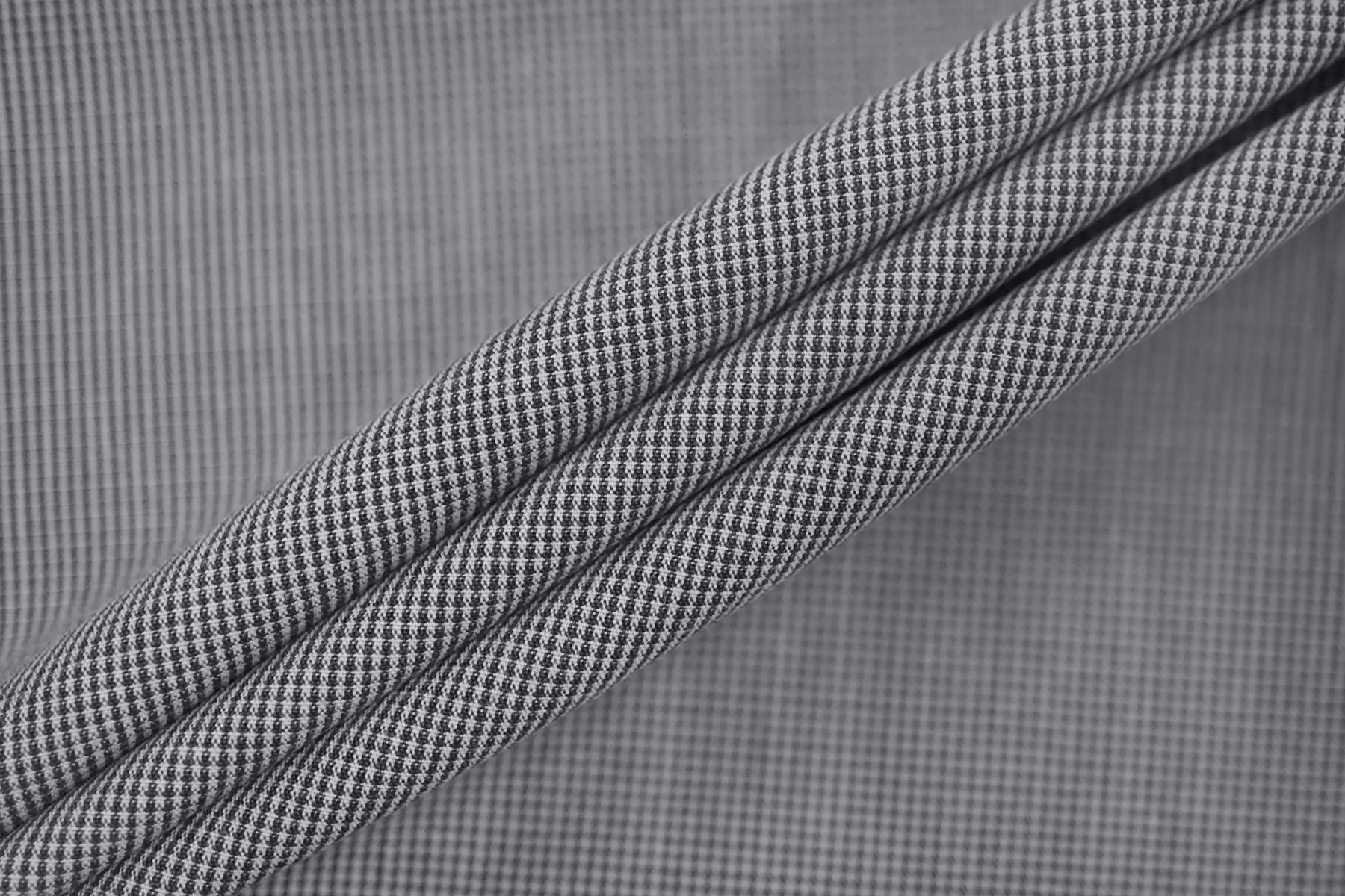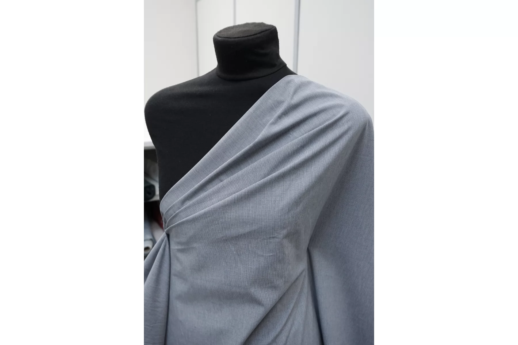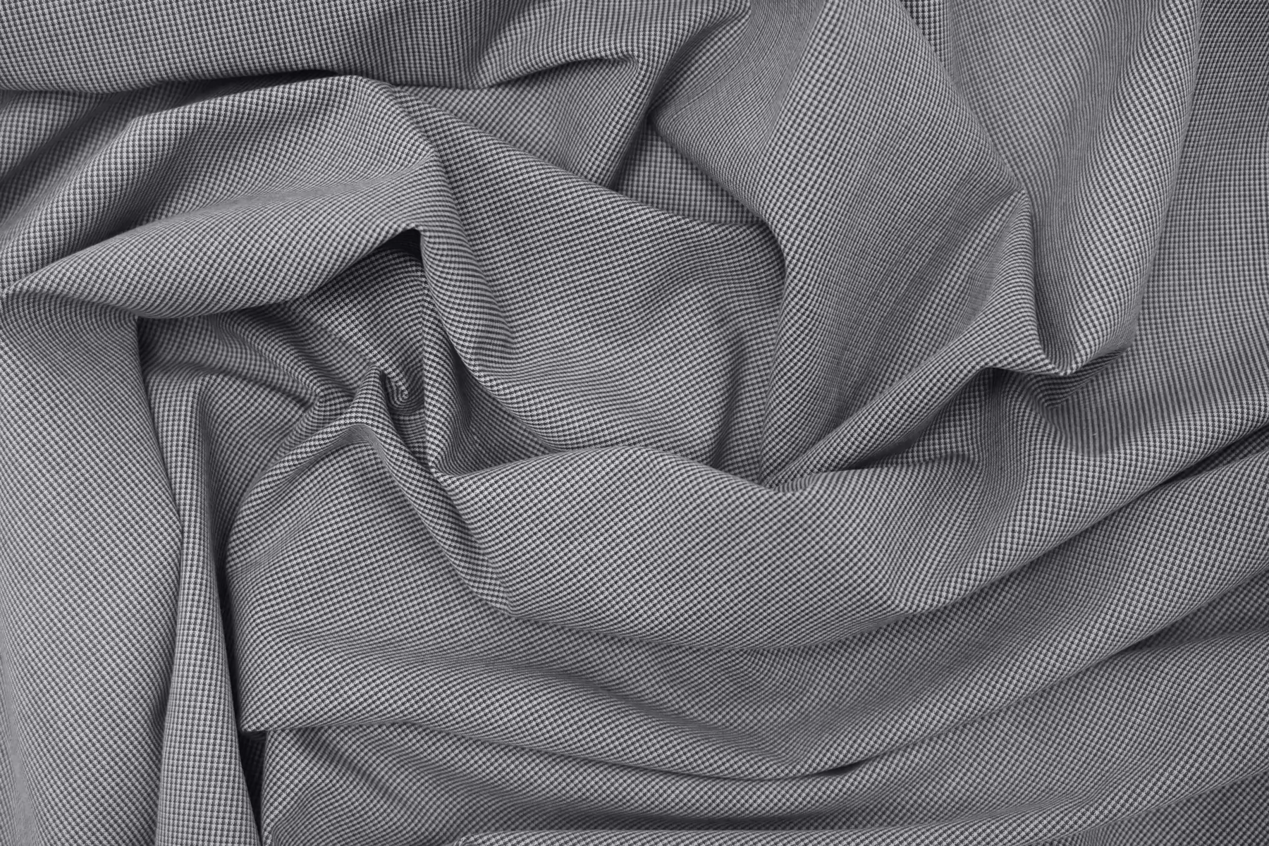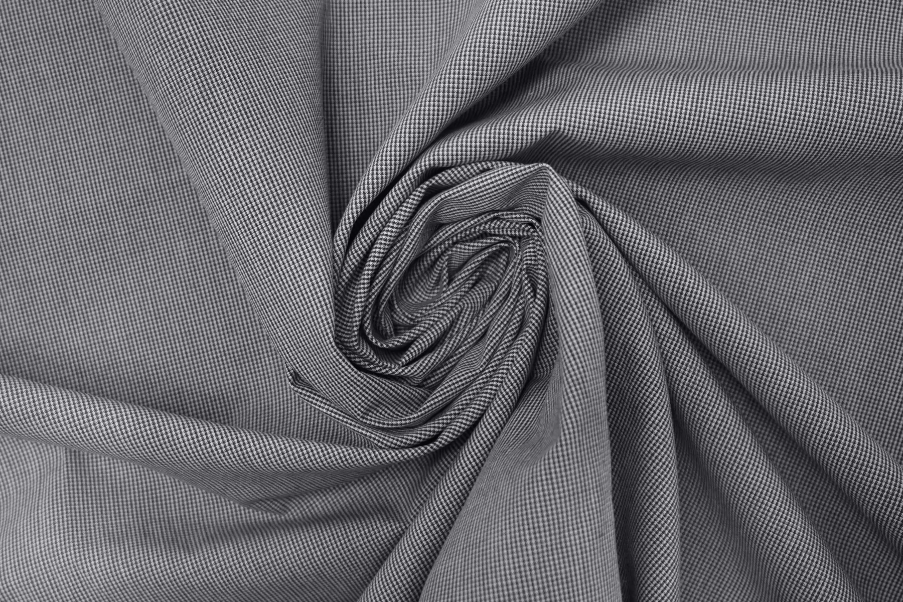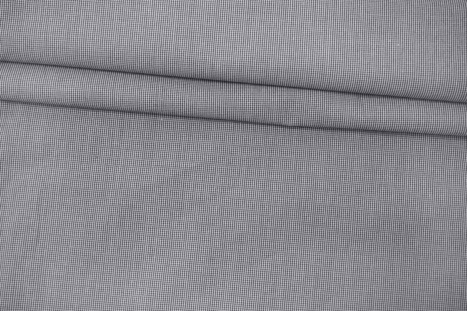Рубашечный хлопок с мелким узором, напоминающим клетку, из нитей белого и тёмно-серого цвета. Ткань тактильно велюристая. Мягкая, довольно плотная, не толстая. Не тянется. Немного мнется, не просвечивает, держит форму. Шьем платья, юбки, брюки, плотные рубашки. Учитывайте усадку.