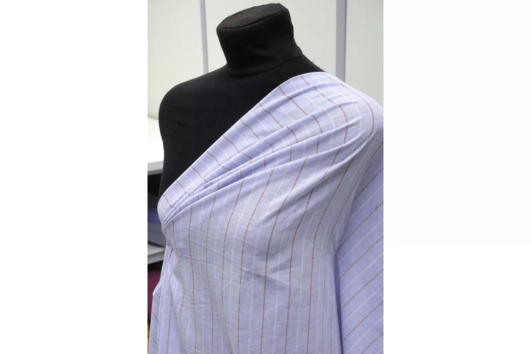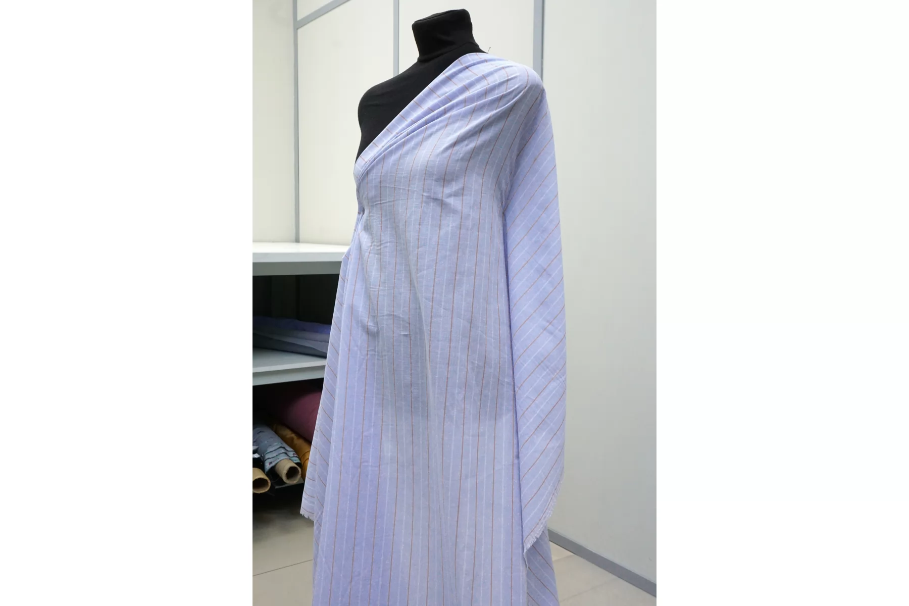 ВНИМАНИЕ!! По всему полотну присутствуют уплотнения с вкраплениями темных нитей см. фото. Рубашечный хлопок с добавкой льна, голубого цвета в полосук. Материал гладкий, тонкий, чувствуется сухость льна. Мнется. Просвечивает силуэт, не тянется. Пластичный, но при этом держит форму. Прекрасный вариант на рубашки, юбки, платья. Материал дает усадку.