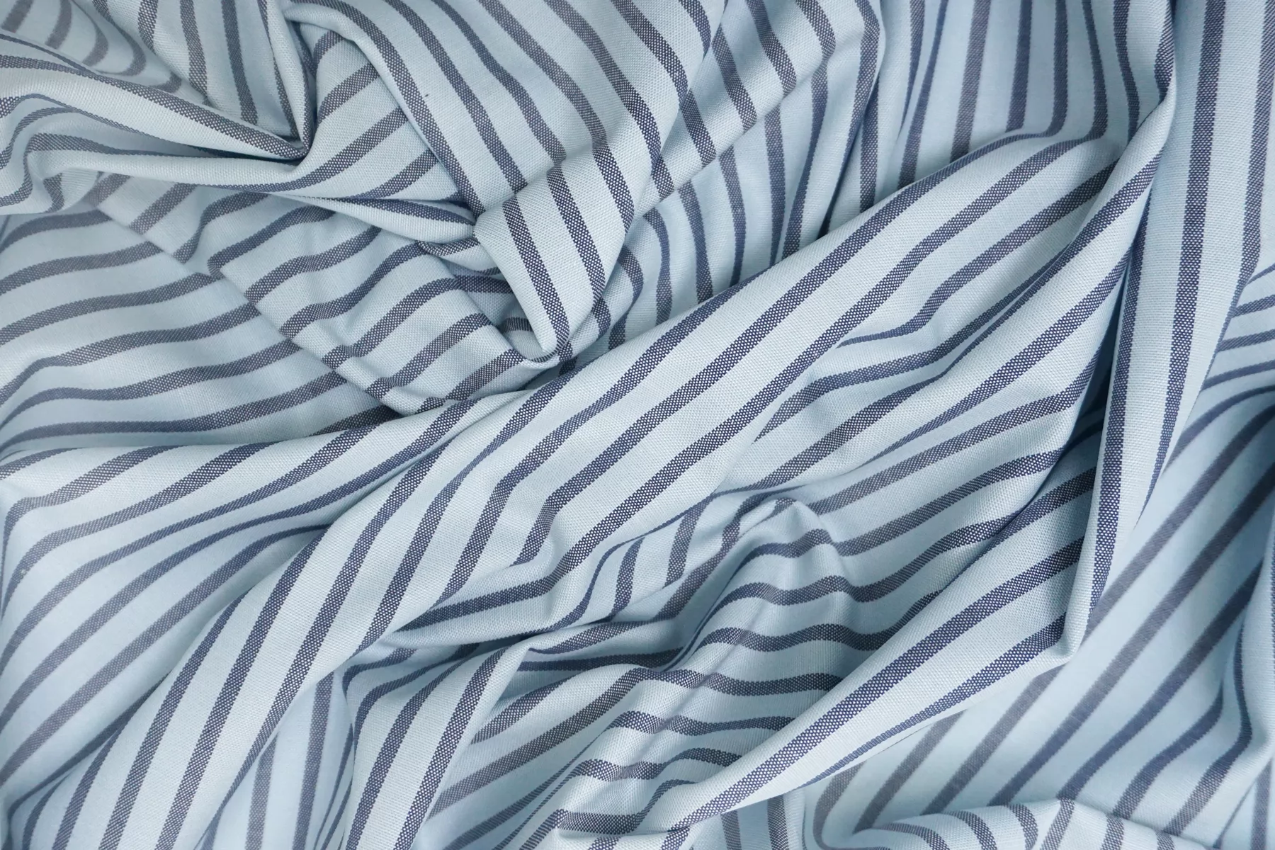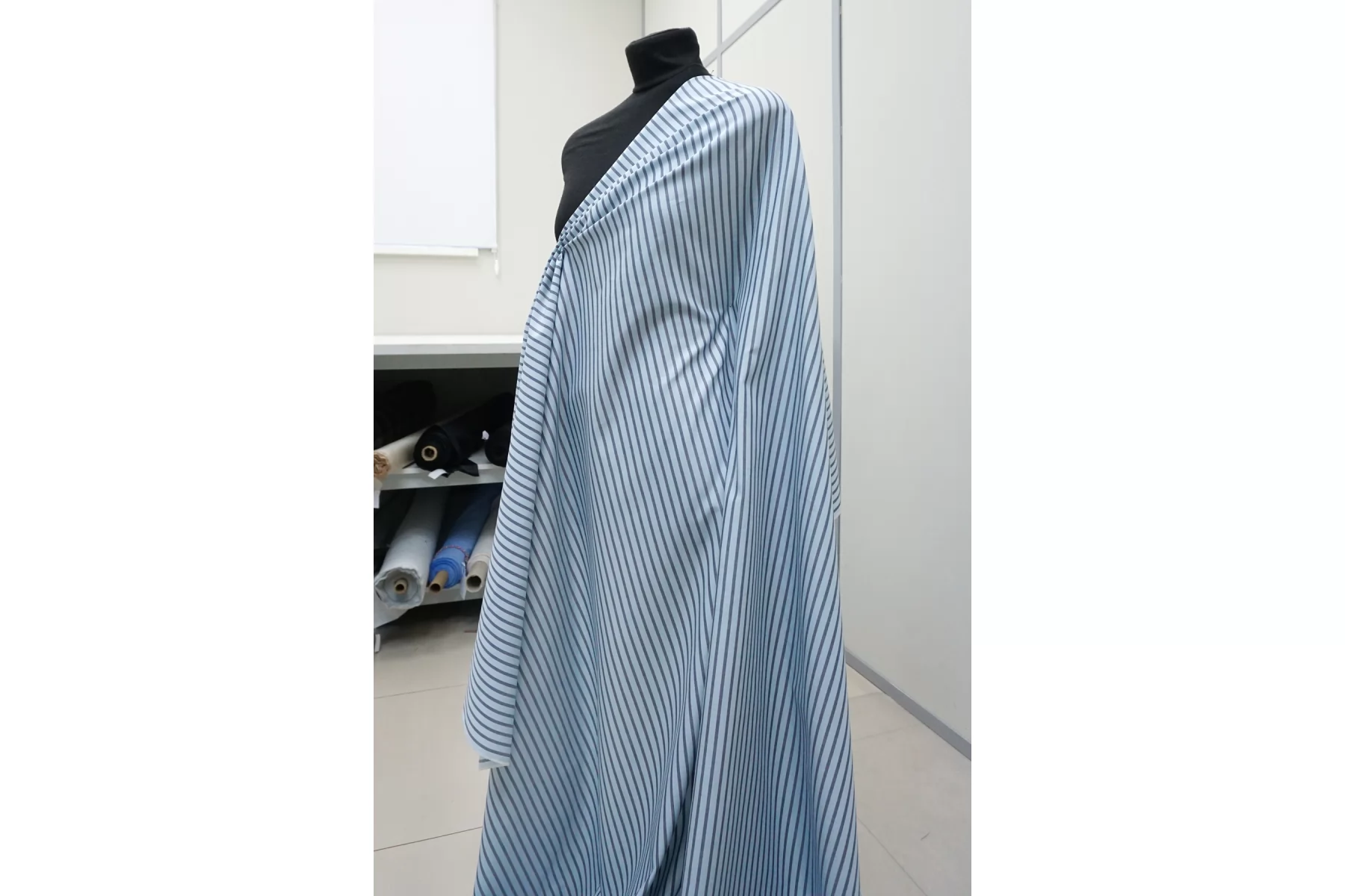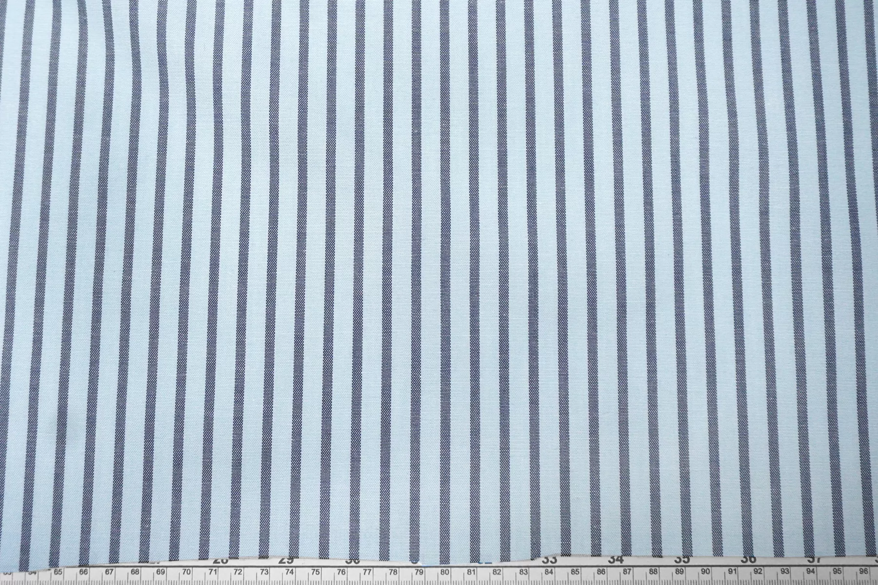 Итальянский хлопок с добавкой льна, полотняного плетения, рубашечной плотности, с узором-полоской, нити тёмно-синего и голубого цвета (полоска вдоль кромки). Присутствуют классические льняные утолщения нити. Ткань тонкая, тактильно суховатая, просвечивает, мнется. Плетение не плотное. Отличный вариант для летнего изделия - платья, юбки, сарафана, рубашки.