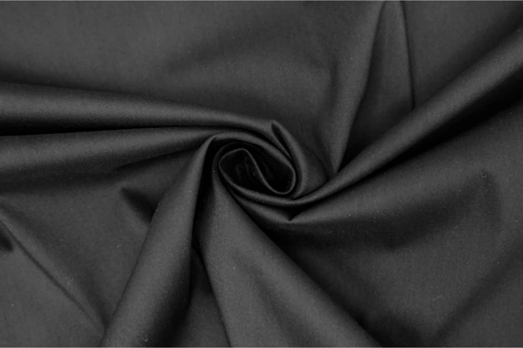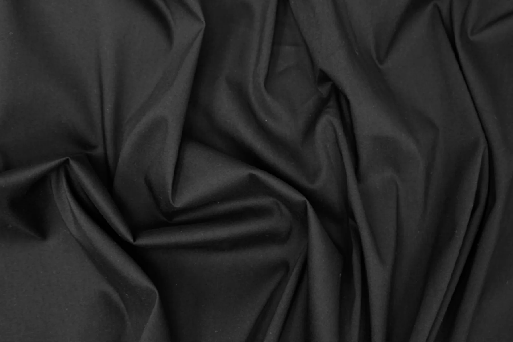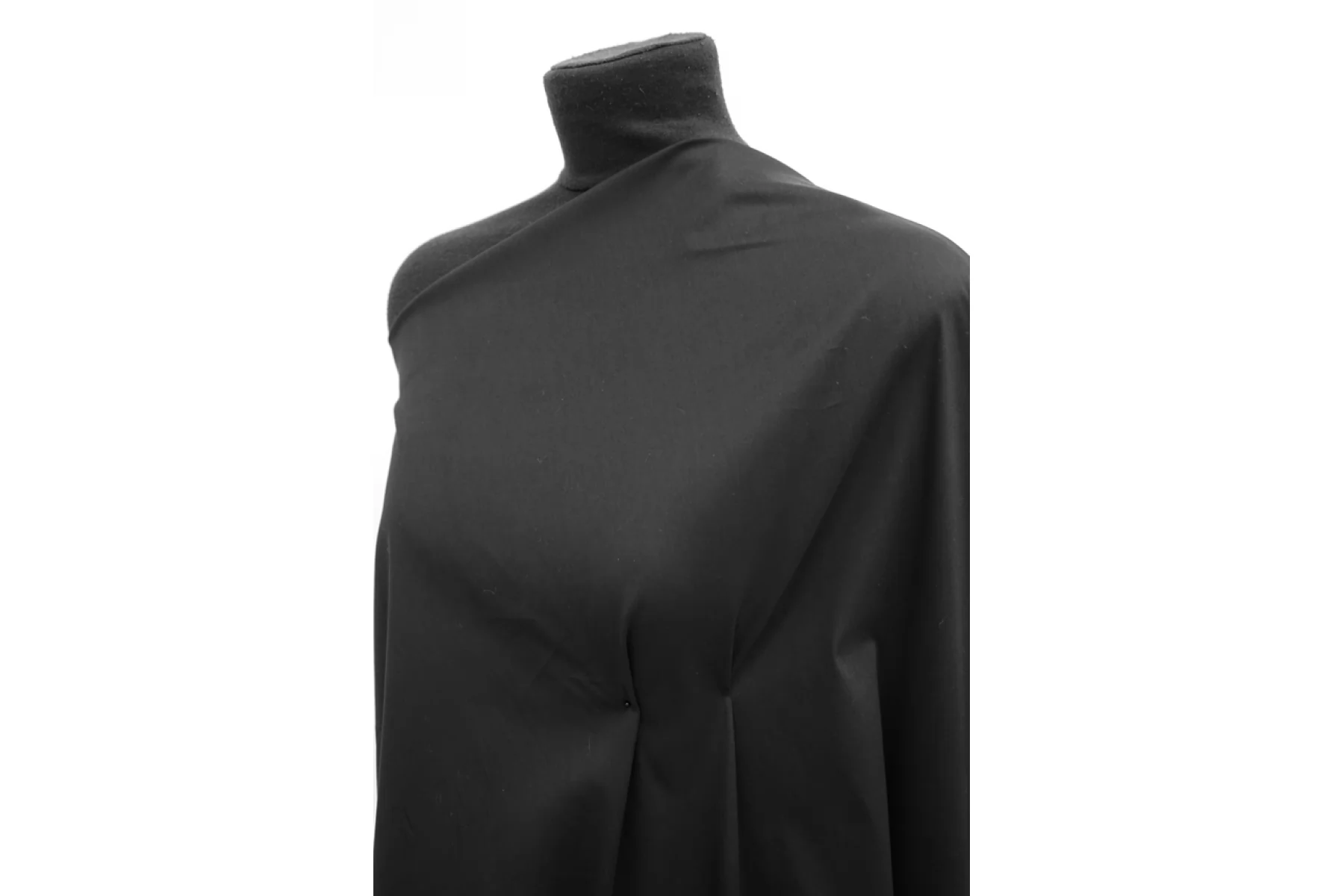 Рубашечный тонкий хлопок стрейч черного оттенка. Тактильно приятный, мягкий. Отлично тянется за счет эластана. Просвечивает силуэт, если смотреть на просвет. Форму держит слабо. Сминается. Подойдет для пошива рубашки, платья, юбки и других вариантов. При необходимости используйте подкладочный материал.