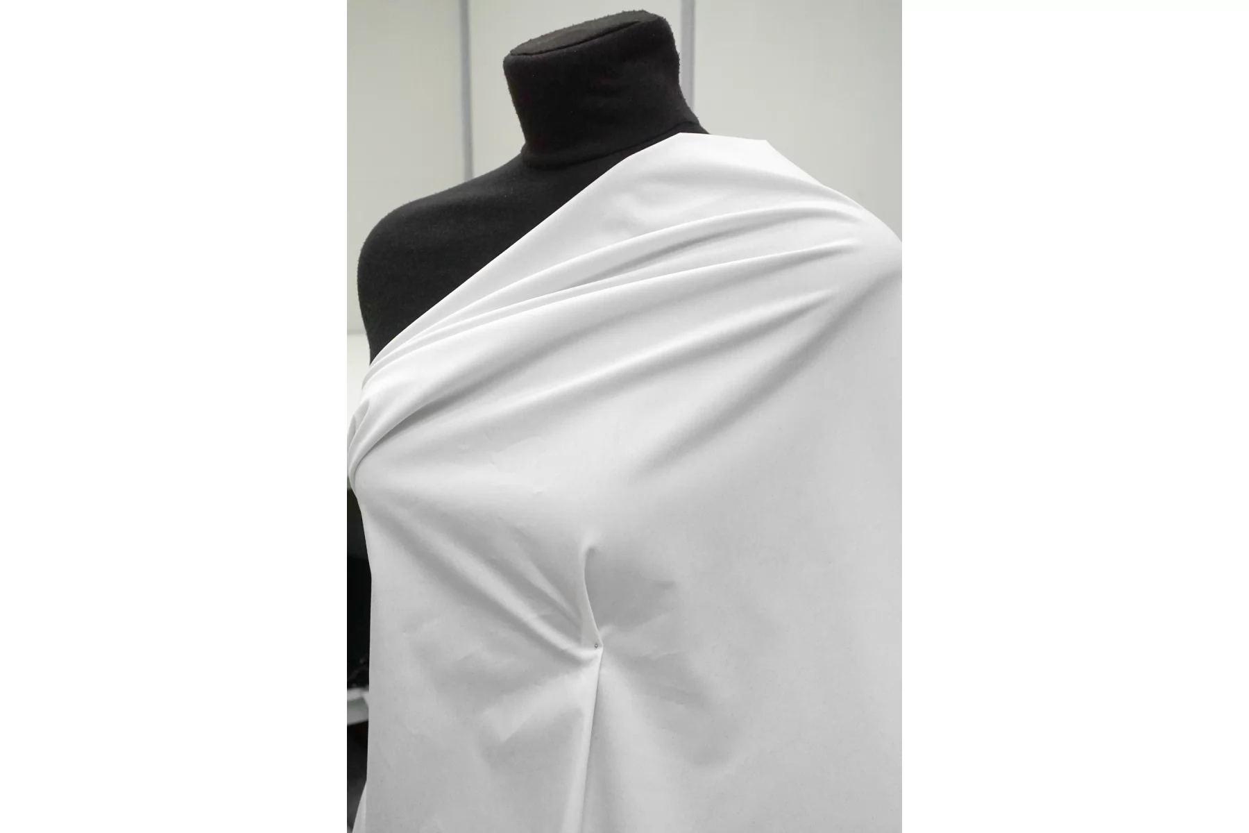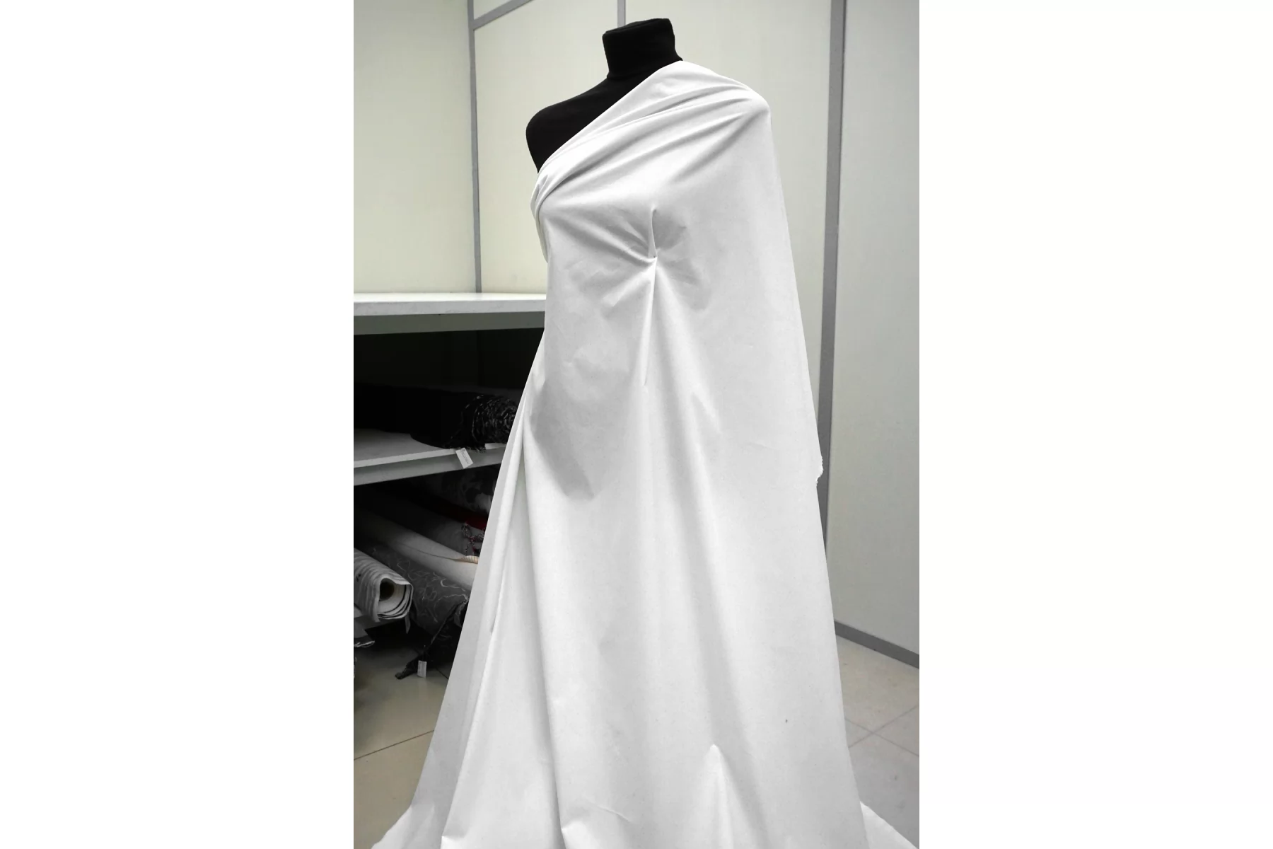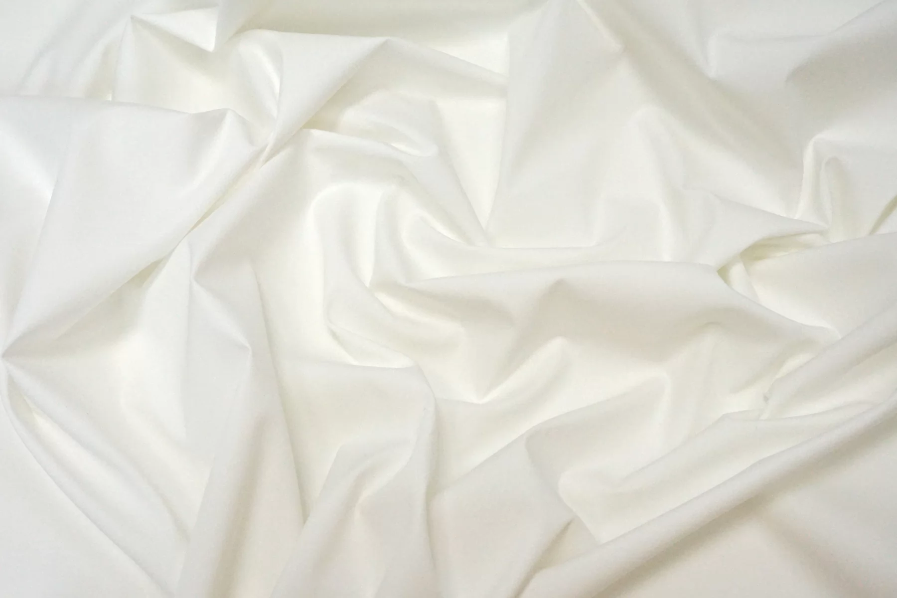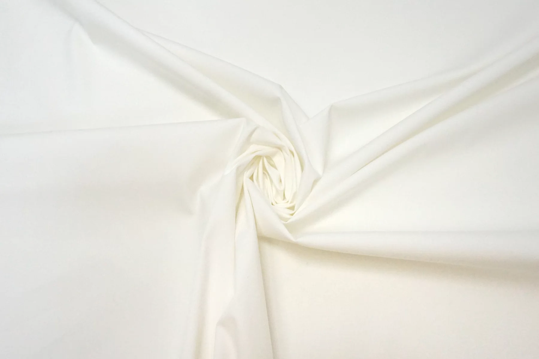 Рубашечный хлопок стрейч белого цвета с очень лёгким молочным подтоном. Не гладкий, есть фактурность. Тактильно очень приятный и мягкий. Немного шуршит. Хорошо тянется. Не просвечивает. Плотный по плетению, но тонкий на ощупь. Держит форму при этом пластичный. Мнется. Шьем рубашки, платья, юбки и не только.