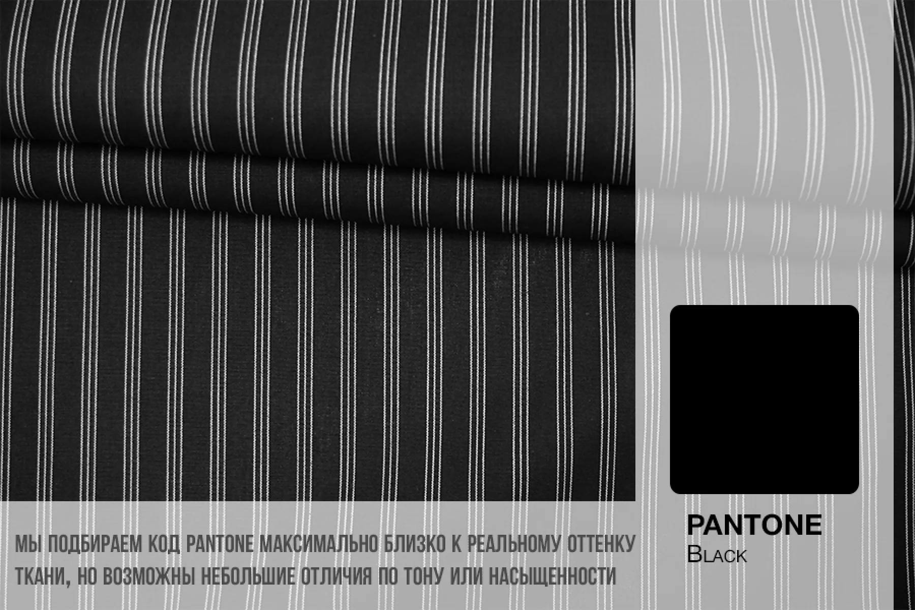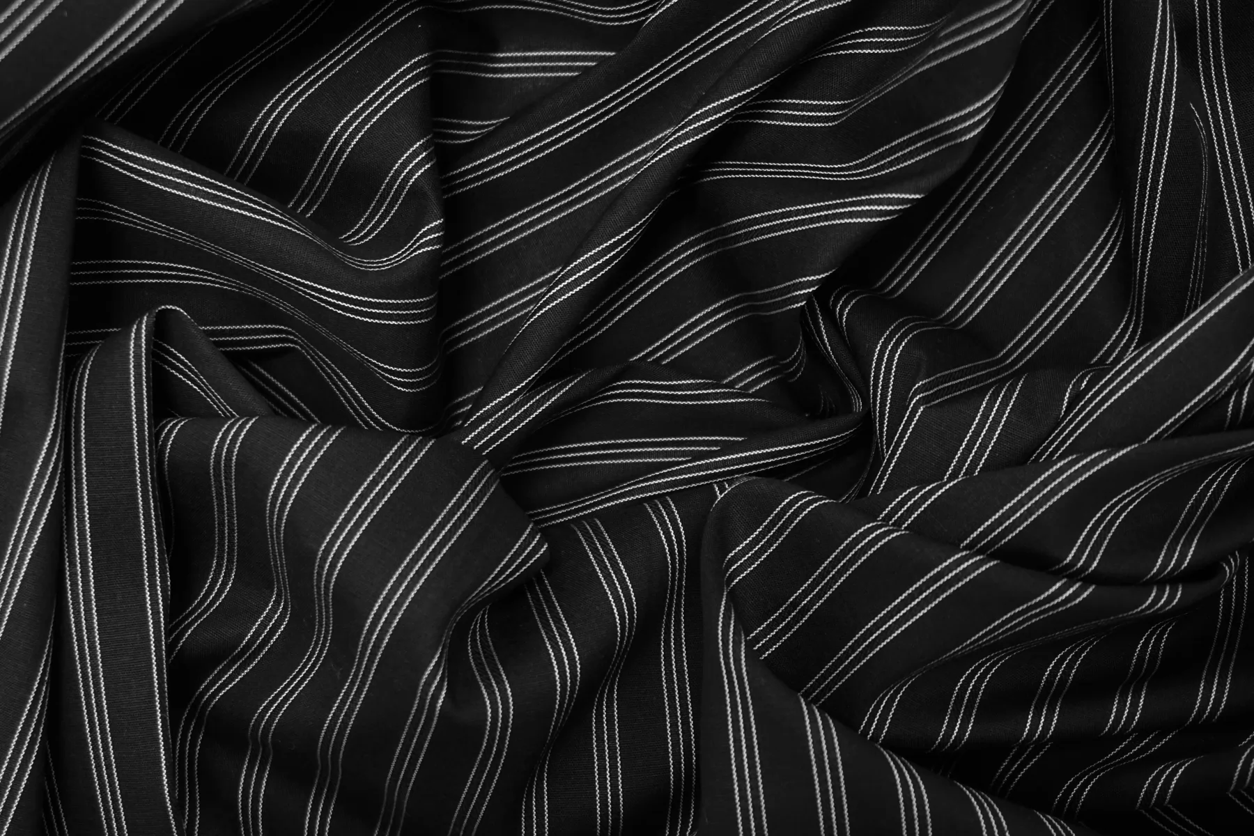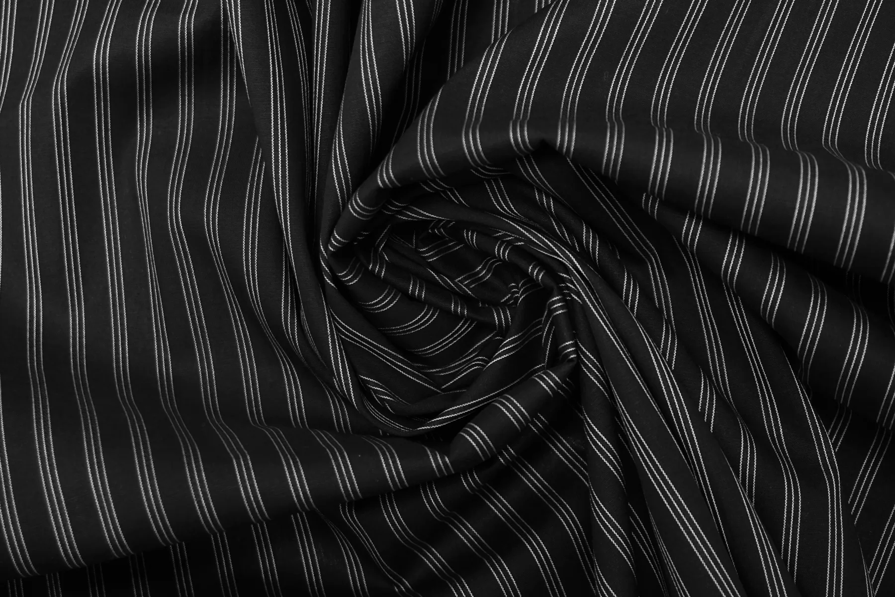 Итальянский хлопок рубашечной плотности, чёрно-серого цвета в тонкую белую полоску (проходит параллельно кромке). Материал слегка тактильно слегка суховатый, тонкий. Тянется. Мнется. Немного просвечивает силуэт в один слой. Пластичный и немного держит форму. Прекрасный вариант на рубашки, юбки, платья. Материал дает усадку.