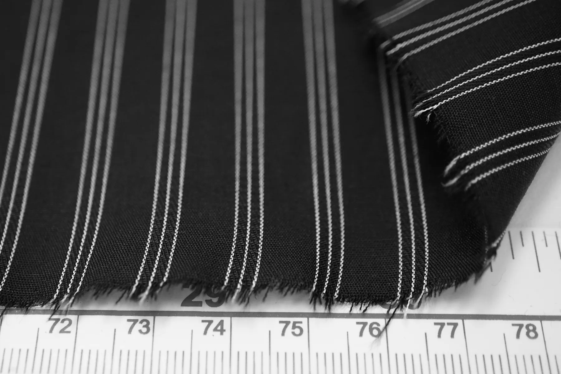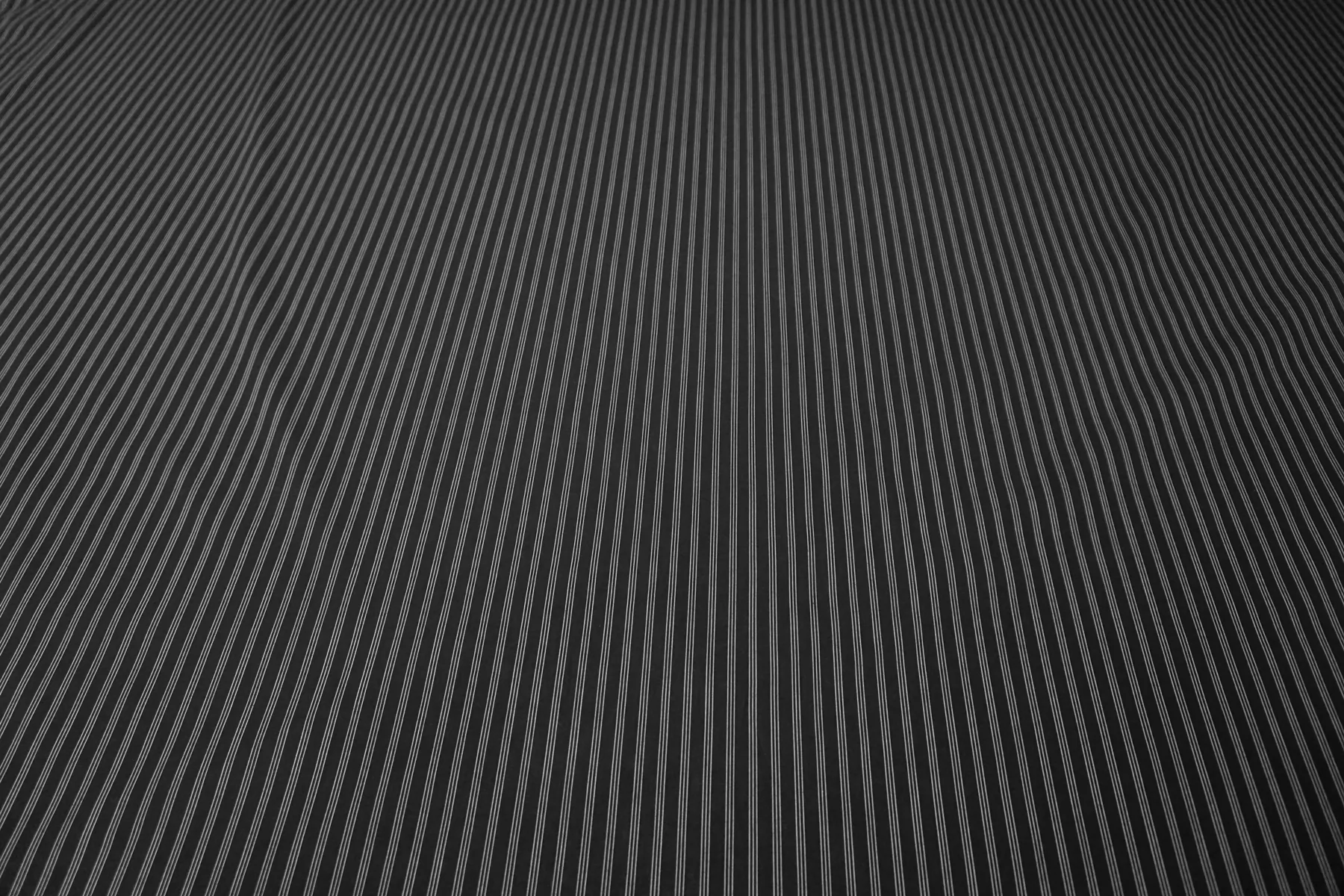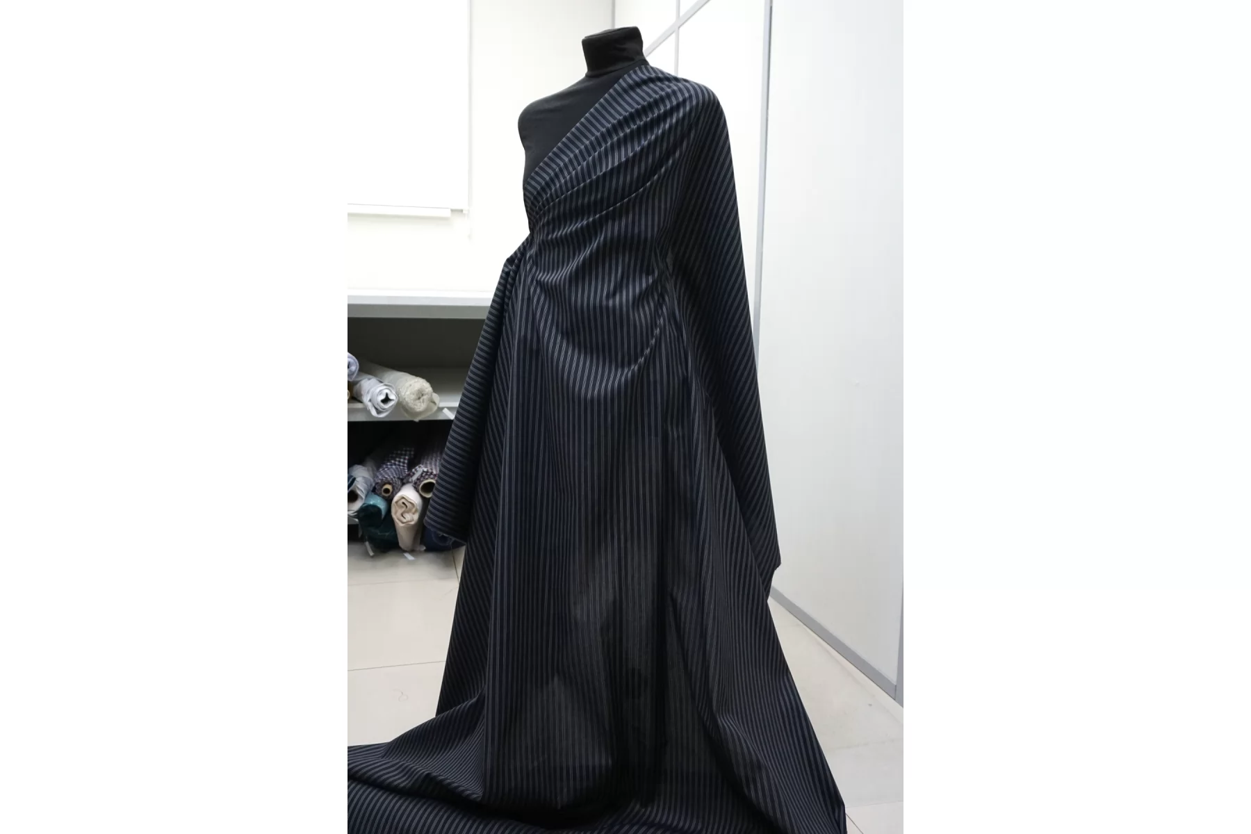 Итальянский хлопок рубашечной плотности, чёрно-серого цвета в тонкую белую полоску (проходит параллельно кромке). Материал слегка тактильно слегка суховатый, тонкий. Тянется. Мнется. Немного просвечивает силуэт в один слой. Пластичный и немного держит форму. Прекрасный вариант на рубашки, юбки, платья. Материал дает усадку.