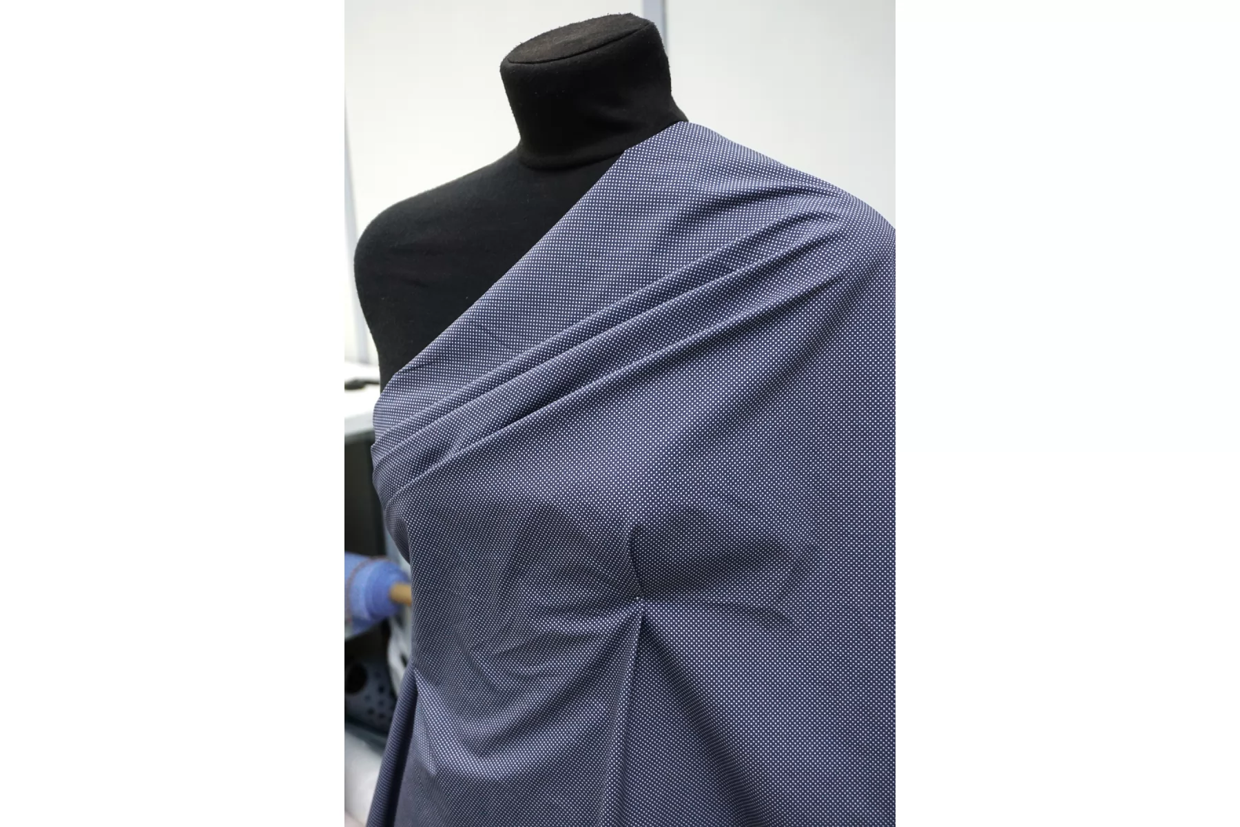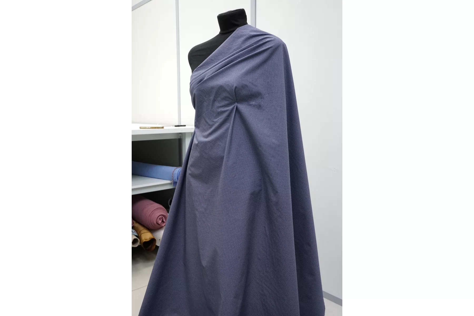 Рубашечный хлопок полотняного плетения. Основа материала тёмно-синяя, принт мелкий белый горошек. Плотный и тонкий. Пластичный но при иэтом держит форму. Не тянется, не просвечивает. Подойдет на рубашки, платья, юбки и не только.