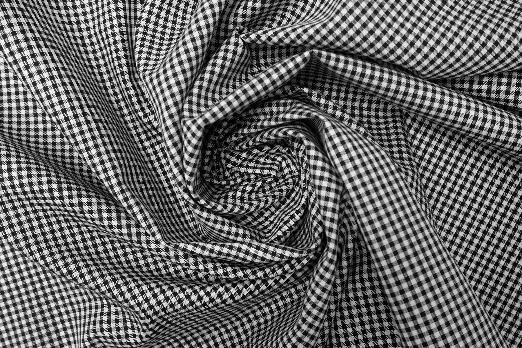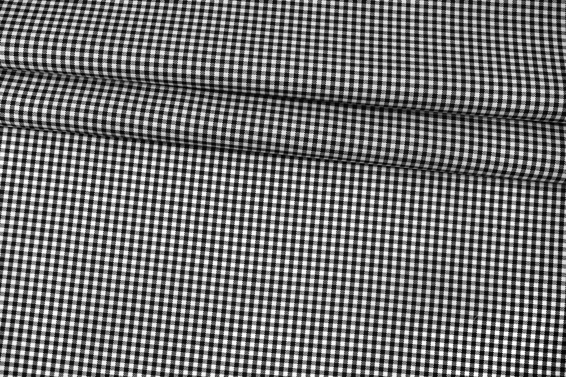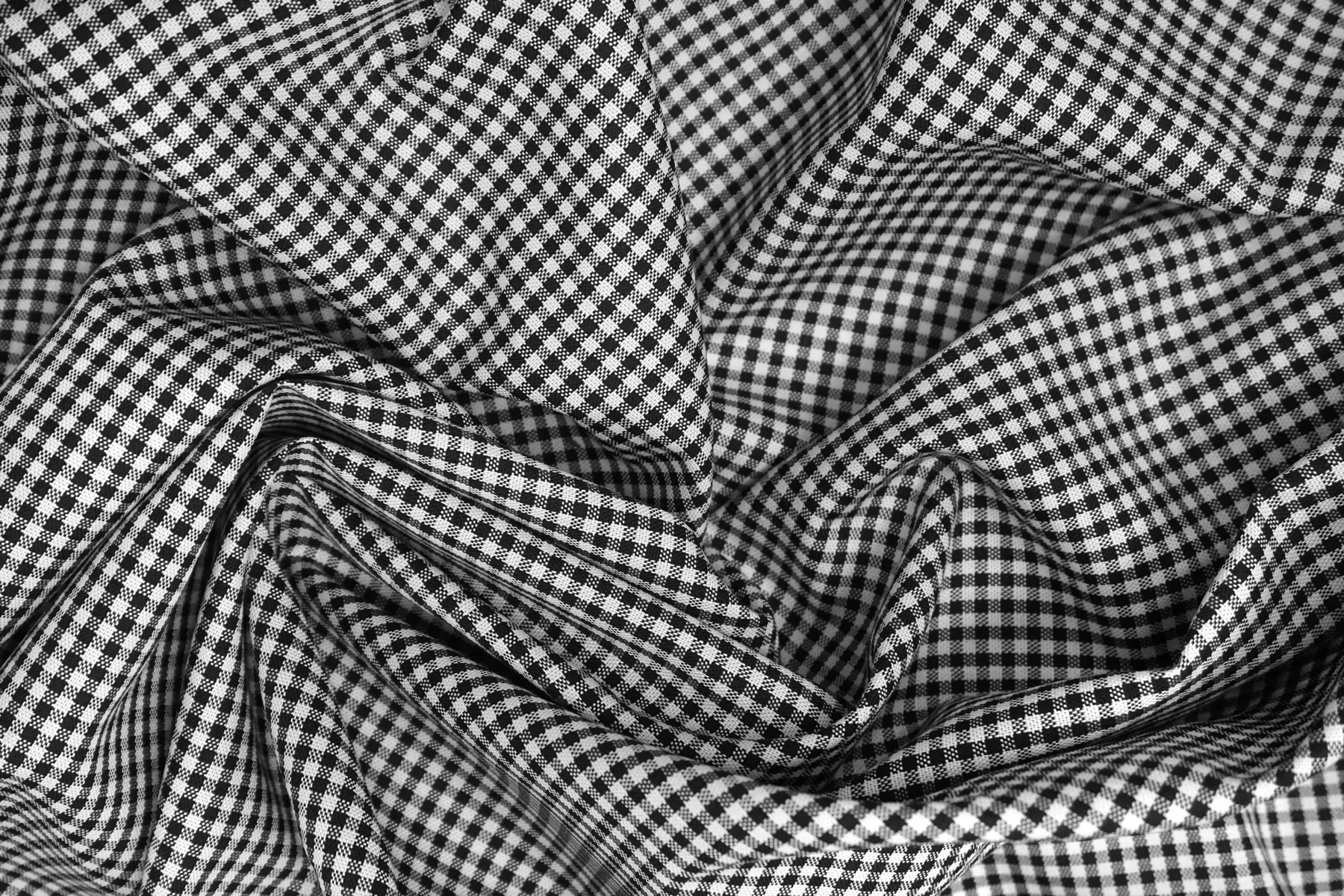 Классный рубашечный хлопок, нити белого и чёрного цвета, узор мелкая клетка. Материал тактильно мягкий, очень приятный и гладкий. Минимально просвечивает силуэт в один слой. Не тянется и умеренно держит форму. Отличный вариант на платья, рубашки. Учитывайте усадку.