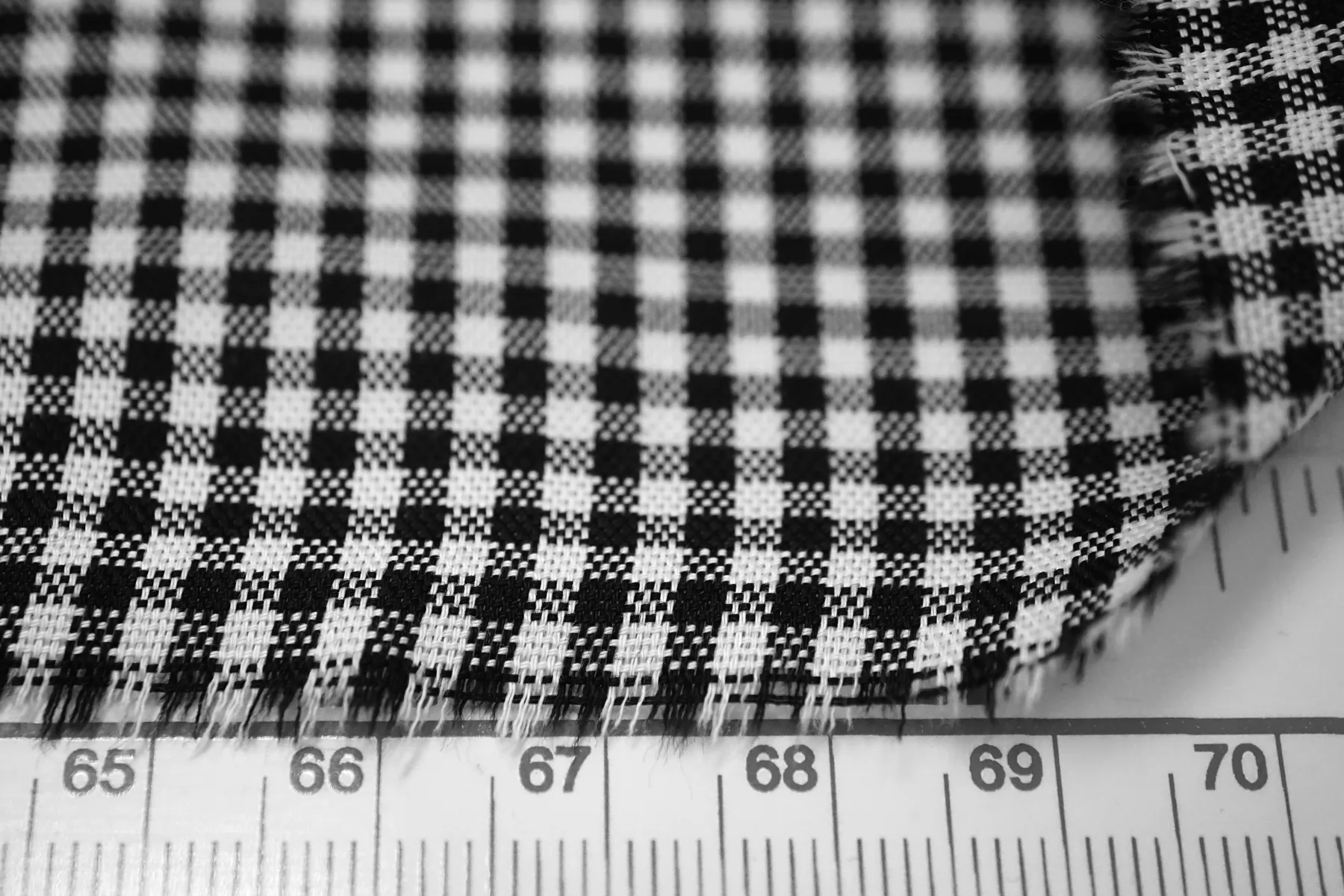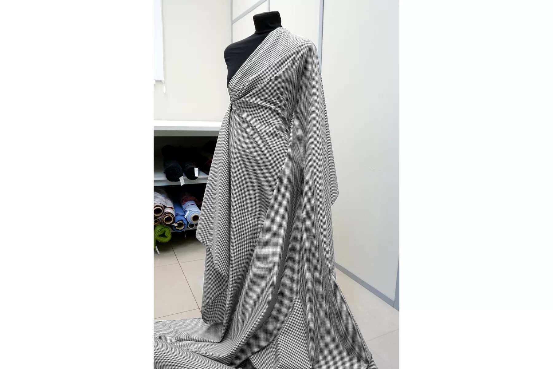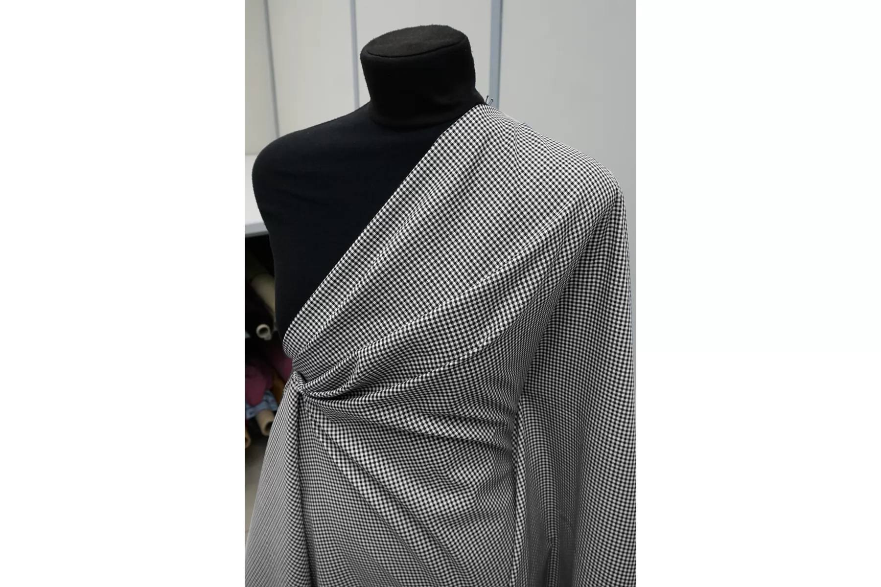 Классный рубашечный хлопок, нити белого и чёрного цвета, узор мелкая клетка. Материал тактильно мягкий, очень приятный и гладкий. Минимально просвечивает силуэт в один слой. Не тянется и умеренно держит форму. Отличный вариант на платья, рубашки. Учитывайте усадку.