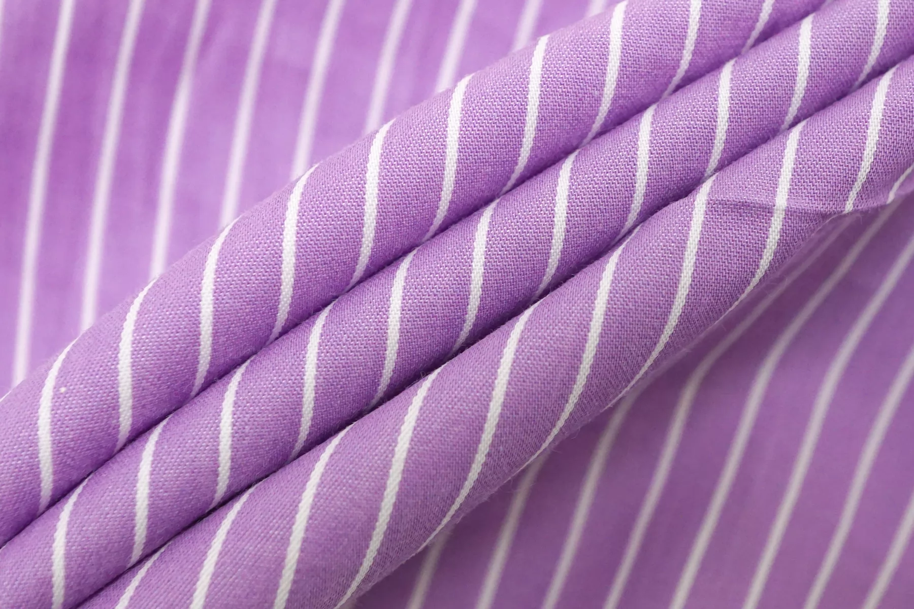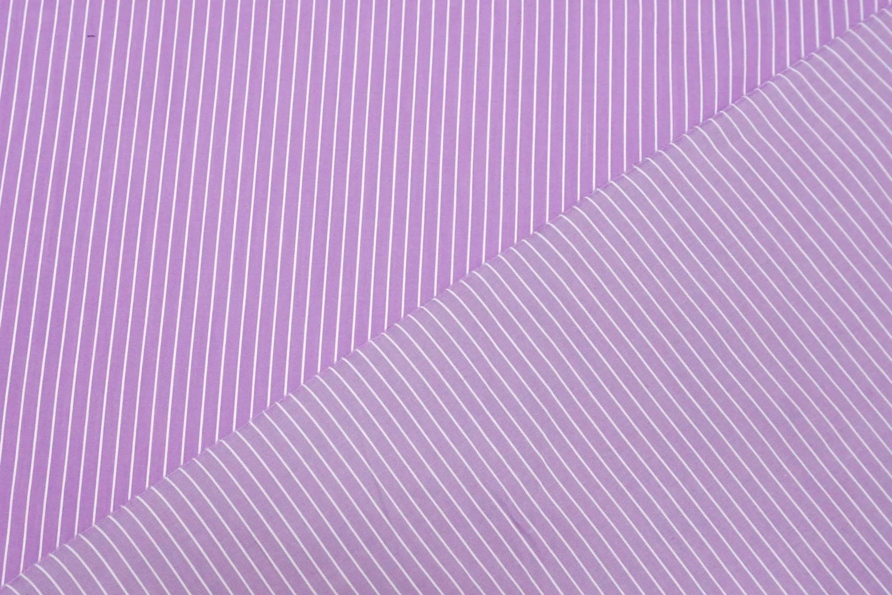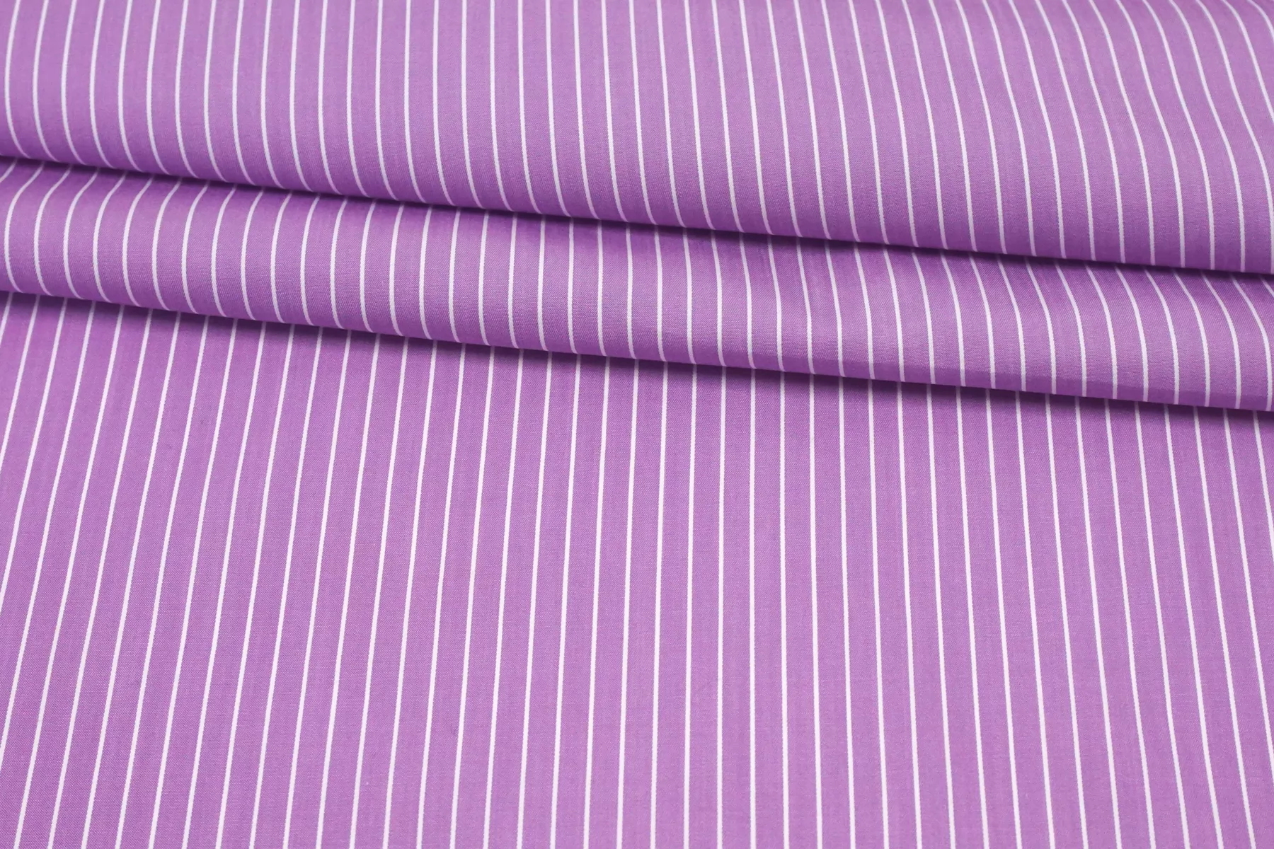 Рубашечный хлопок с узором-полоской, плетение сатиновое но без выраженного лоска. Нити лилово-сиреневого и белого цвета, полоска параллельна кромке. Приятный и гладкий. Тонкий но при этом плотный. Минимально просвечивает силуэт в один слой, в изделии заметно не будет. Не тянется. Хорошо драпируется и немного держит форму. Отличный вариант на рубашки, платья, сарафаны, юбки.