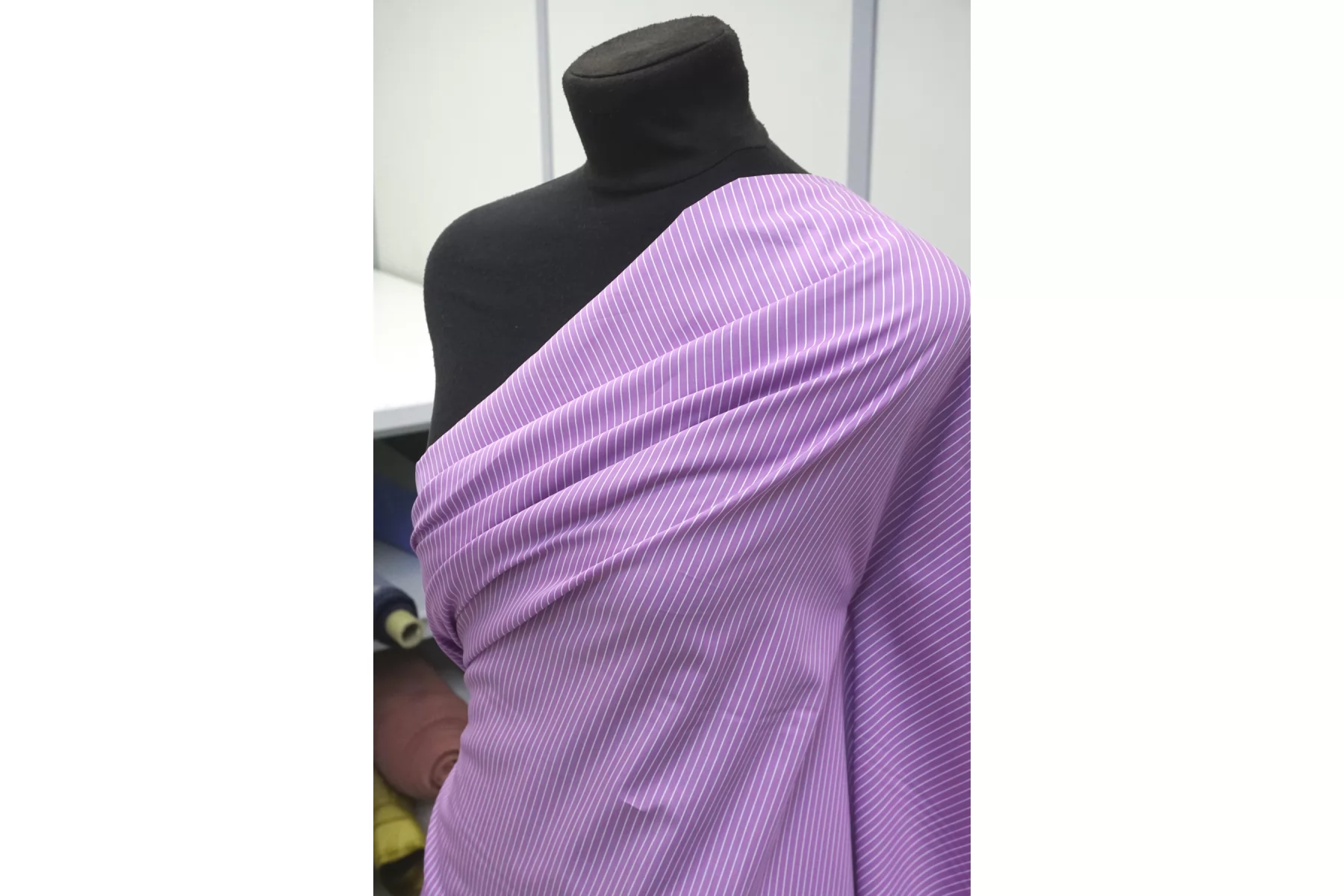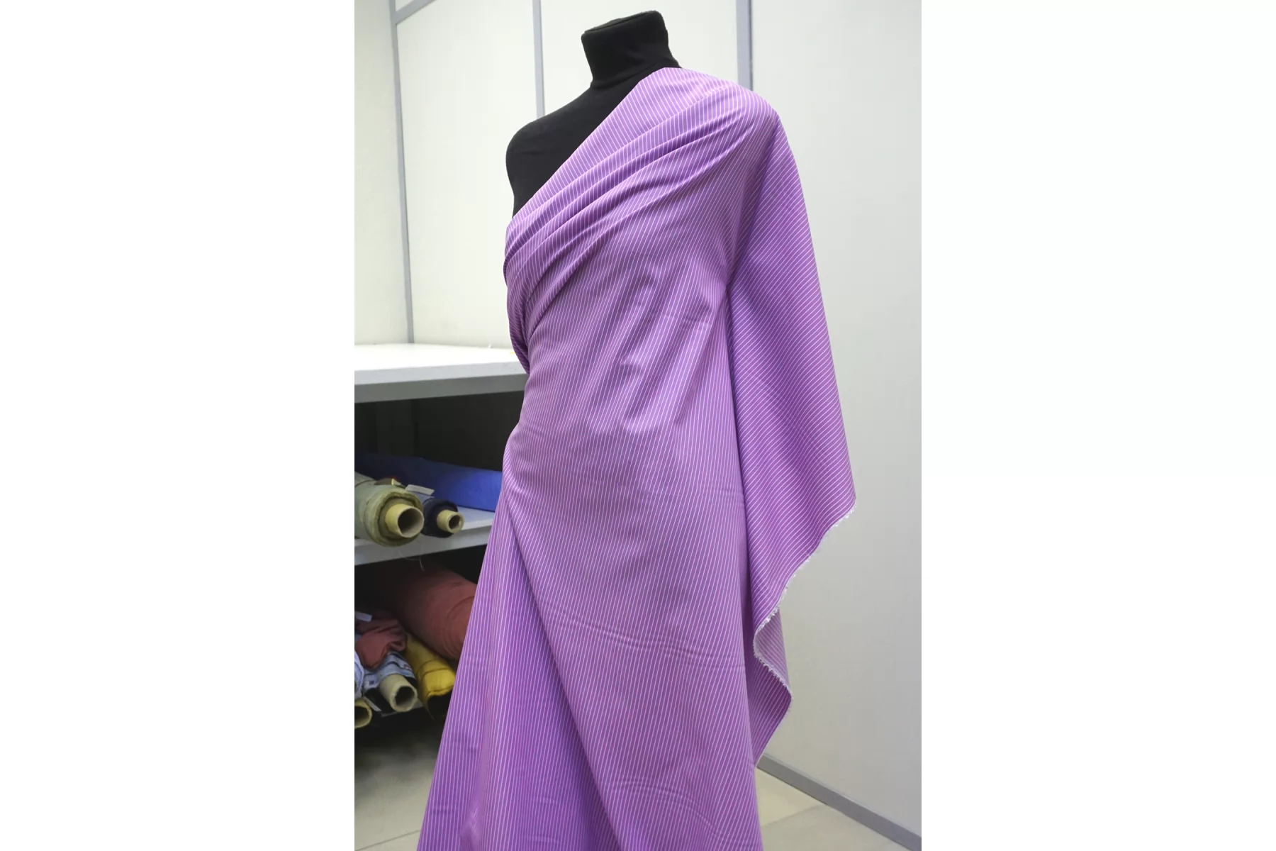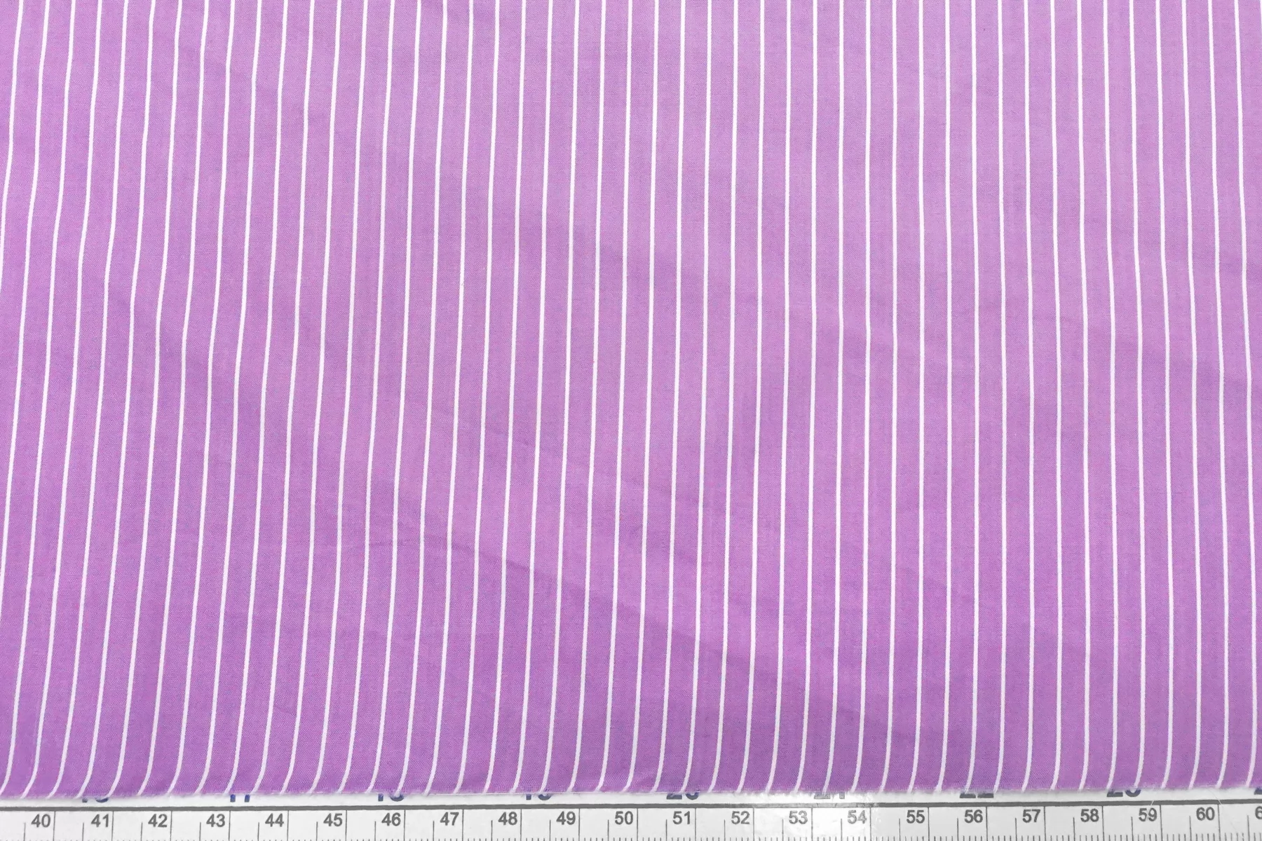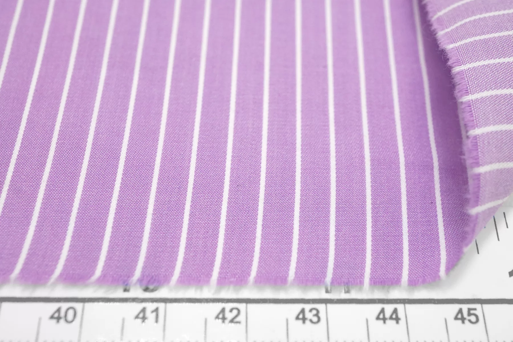Рубашечный хлопок с узором-полоской, плетение сатиновое но без выраженного лоска. Нити лилово-сиреневого и белого цвета, полоска параллельна кромке. Приятный и гладкий. Тонкий но при этом плотный. Минимально просвечивает силуэт в один слой, в изделии заметно не будет. Не тянется. Хорошо драпируется и немного держит форму. Отличный вариант на рубашки, платья, сарафаны, юбки.