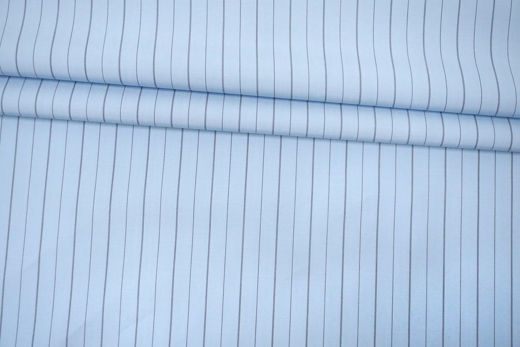 Итальянский хлопок от ALBINI рубашечной плотности, голубого цвета в тонкую чёрную полоску (проходит параллельно кромке). Материал гладкий, мягкий, тонкий. Мнется. Слегка просвечивает силуэт в один слой, не тянется. Пластичный и немного держит форму. Прекрасный вариант на рубашки, юбки, платья. Материал дает усадку.