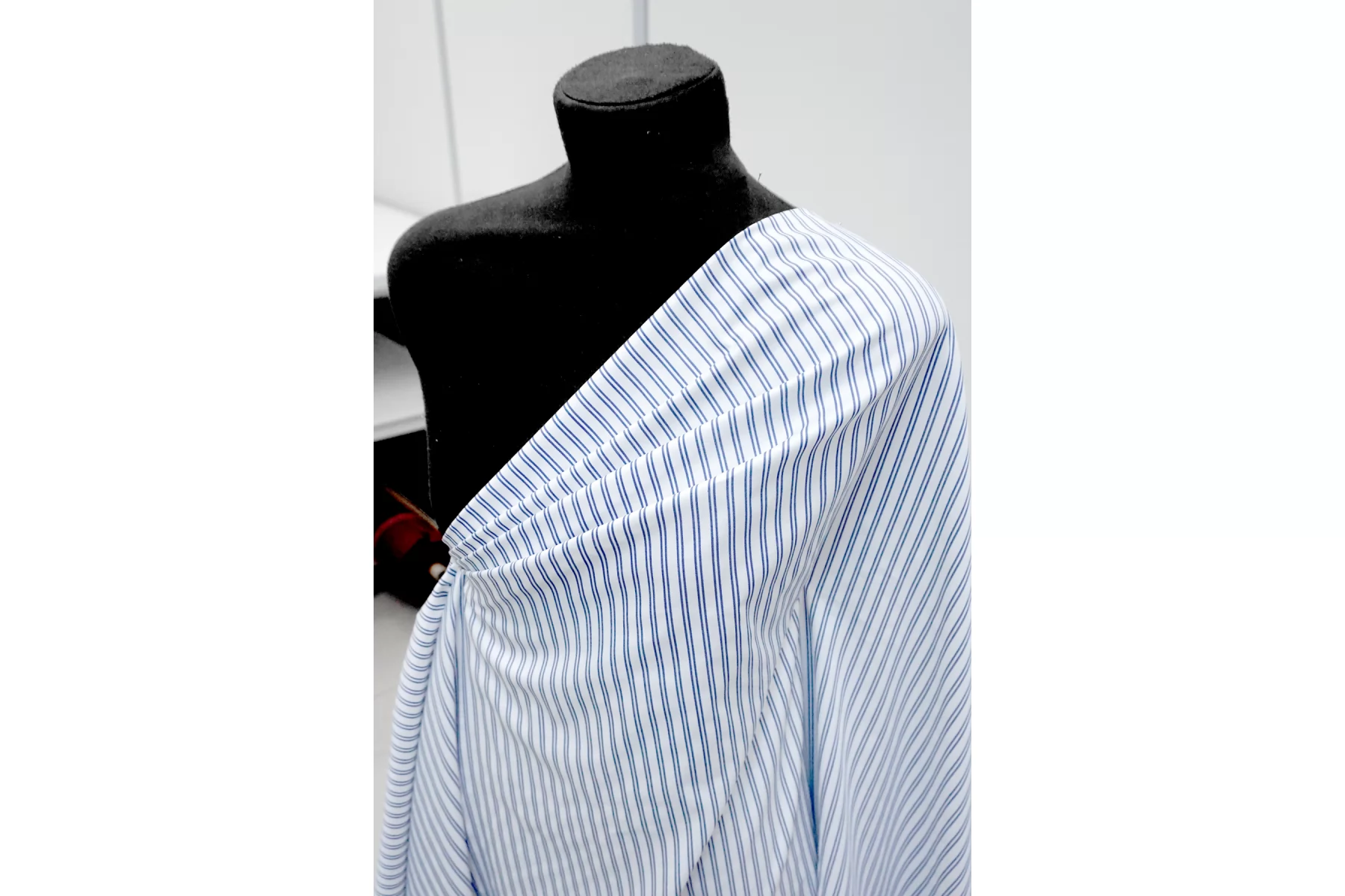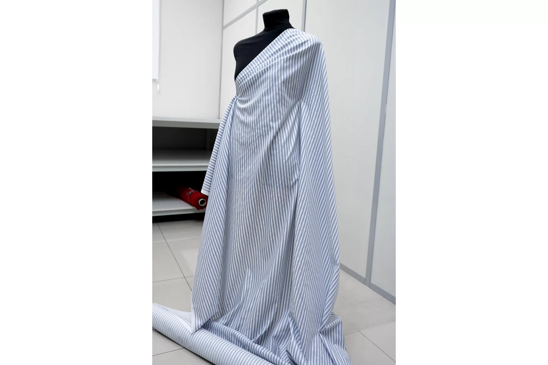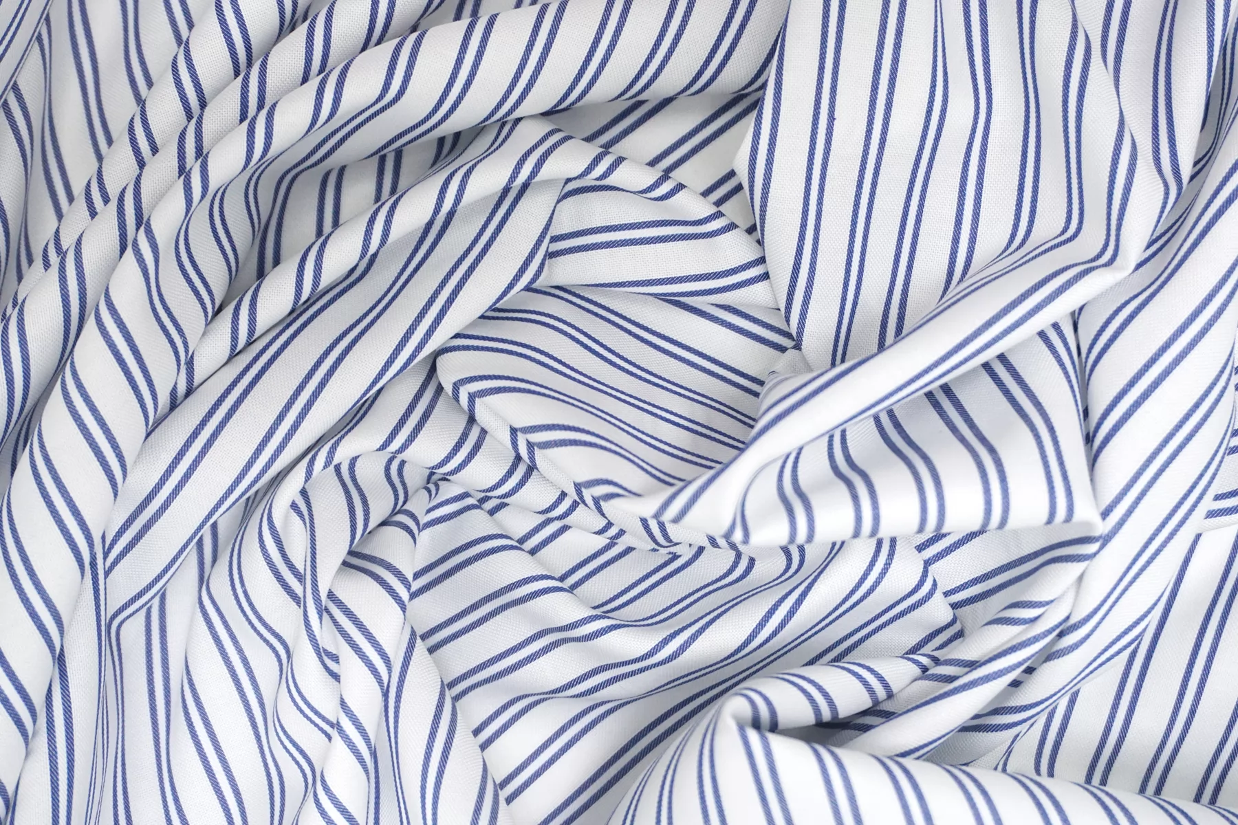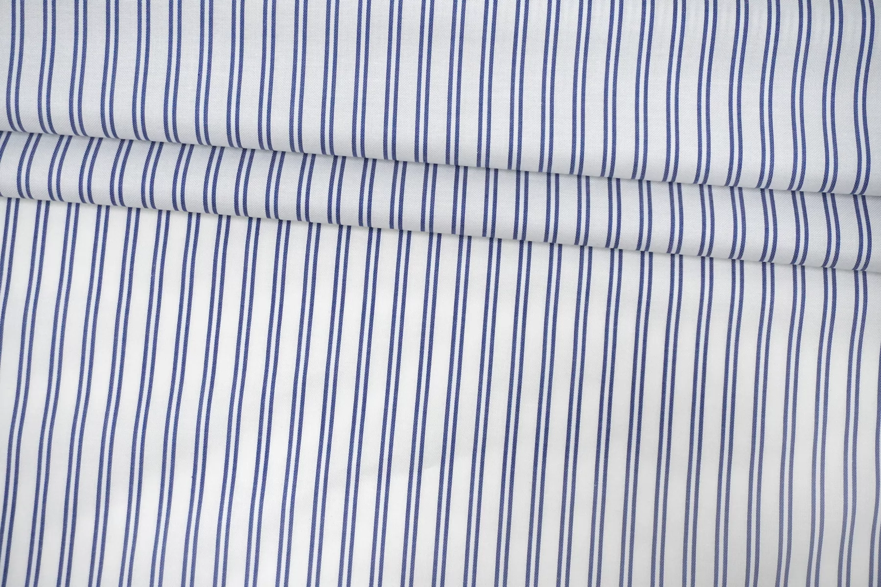 Итальянский рубашечно-плательный хлопок из нитей белого и синего цвета с жаккардовой выработкой и полоской (полоска вдоль кромки). Тонкий, пластичный. Тактильно приятный, мягкий. Красиво смотрится в складке. Форму держит умеренно. Не тянется. Слегка сминается. Немного светит. Подойдет для пошива платья, рубашки, юбки, сарафана. Учитывайте возможную усадку.