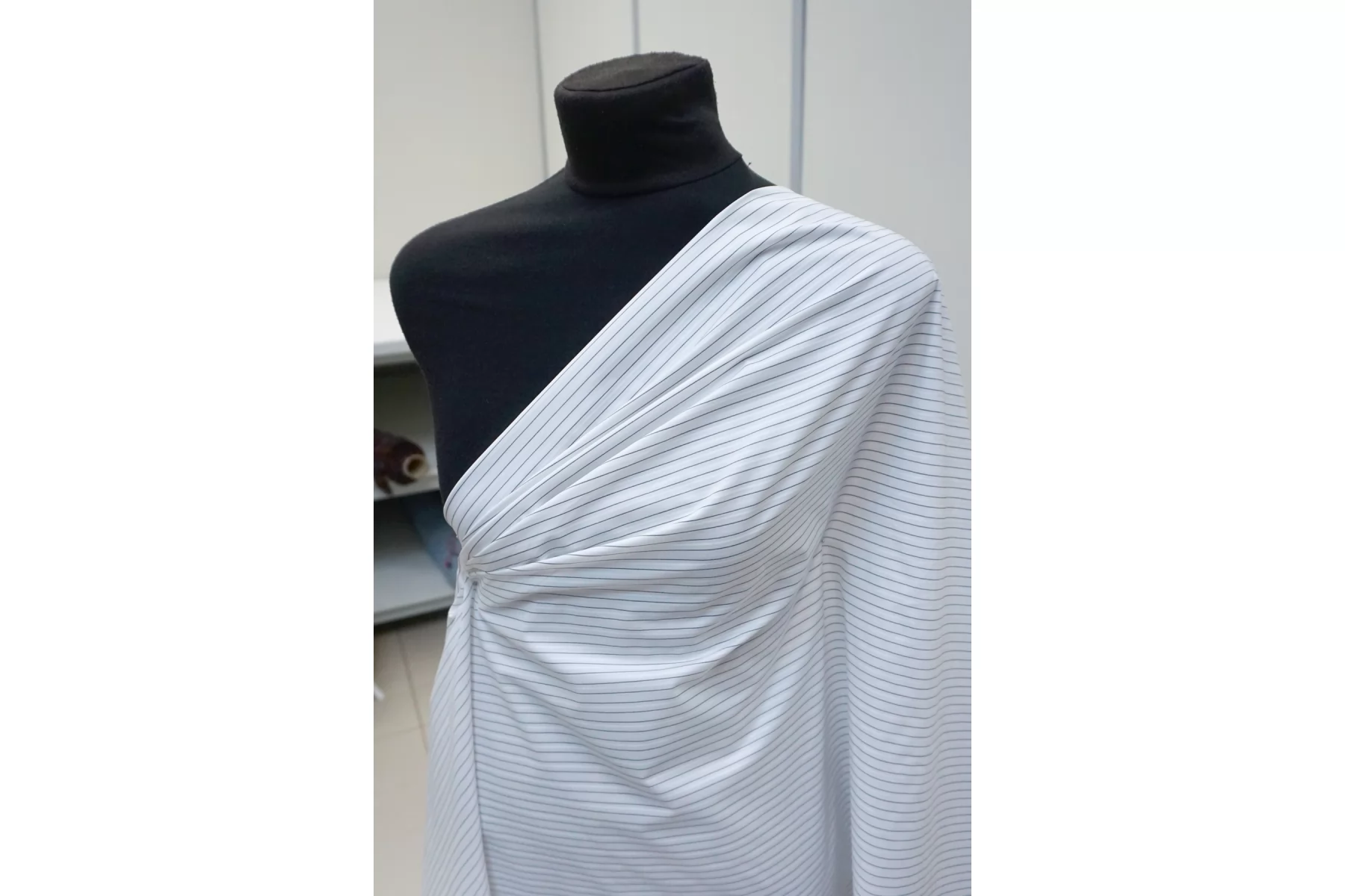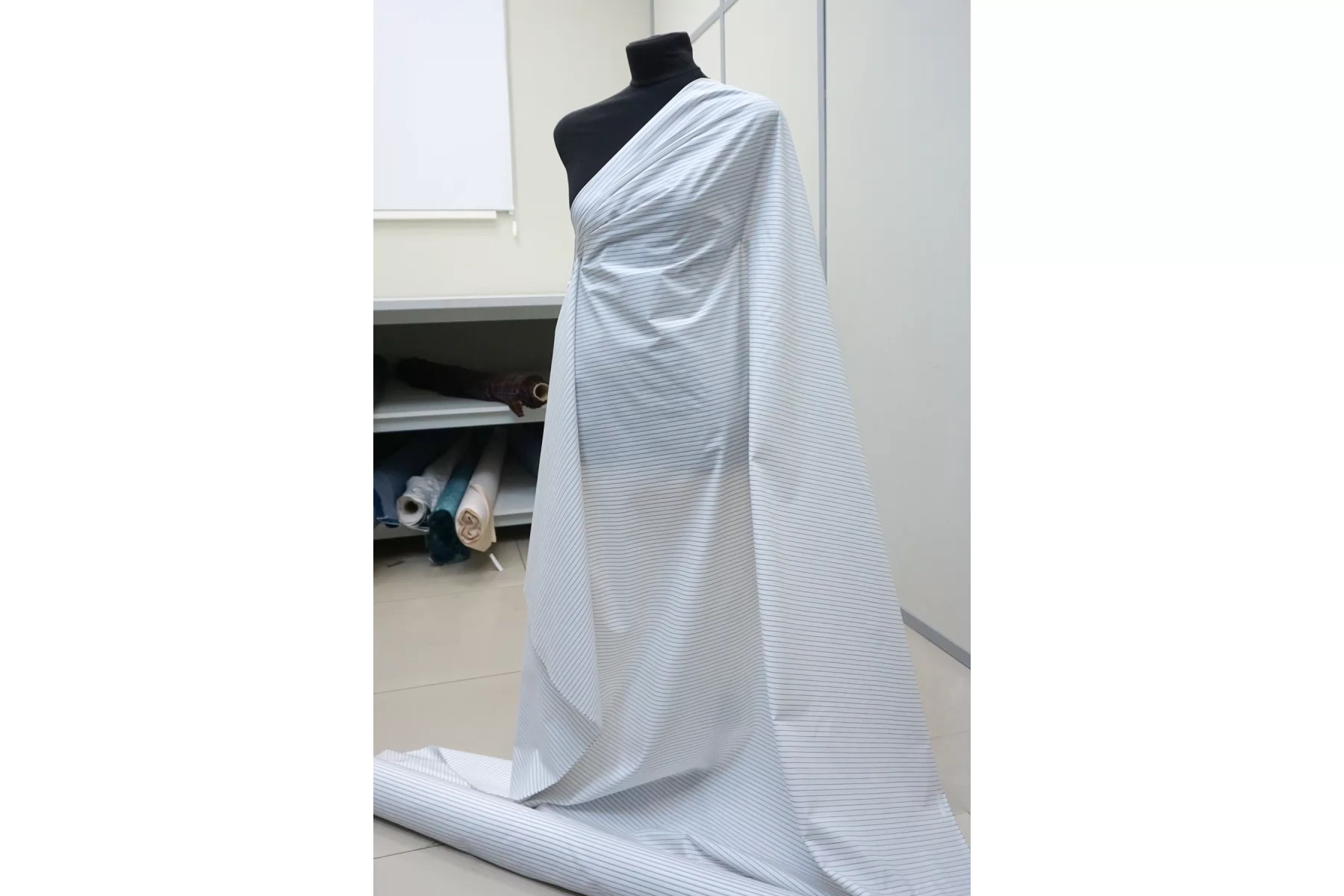 Итальянский рубашечный хлопок из нитей белого и чёрного цвета с жаккардовой выработкой и полоской (полоска поперек кромки). Тонкий, пластичный. Тактильно приятный, мягкий. Красиво смотрится в складке. Форму держит умеренно. Не тянется. Слегка сминается. Просвечивает в один слой. Подойдет для пошива платья, рубашки, юбки, сарафана. Учитывайте возможную усадку.
