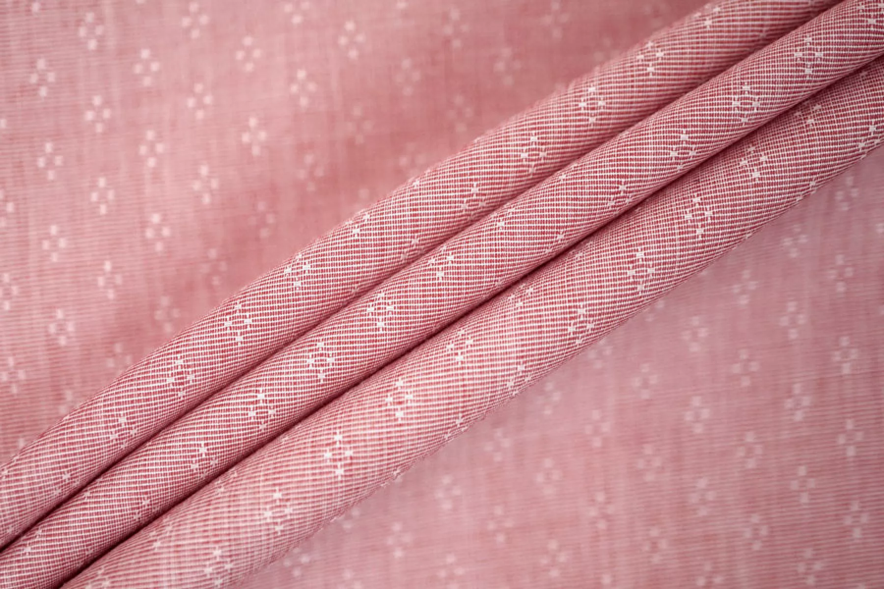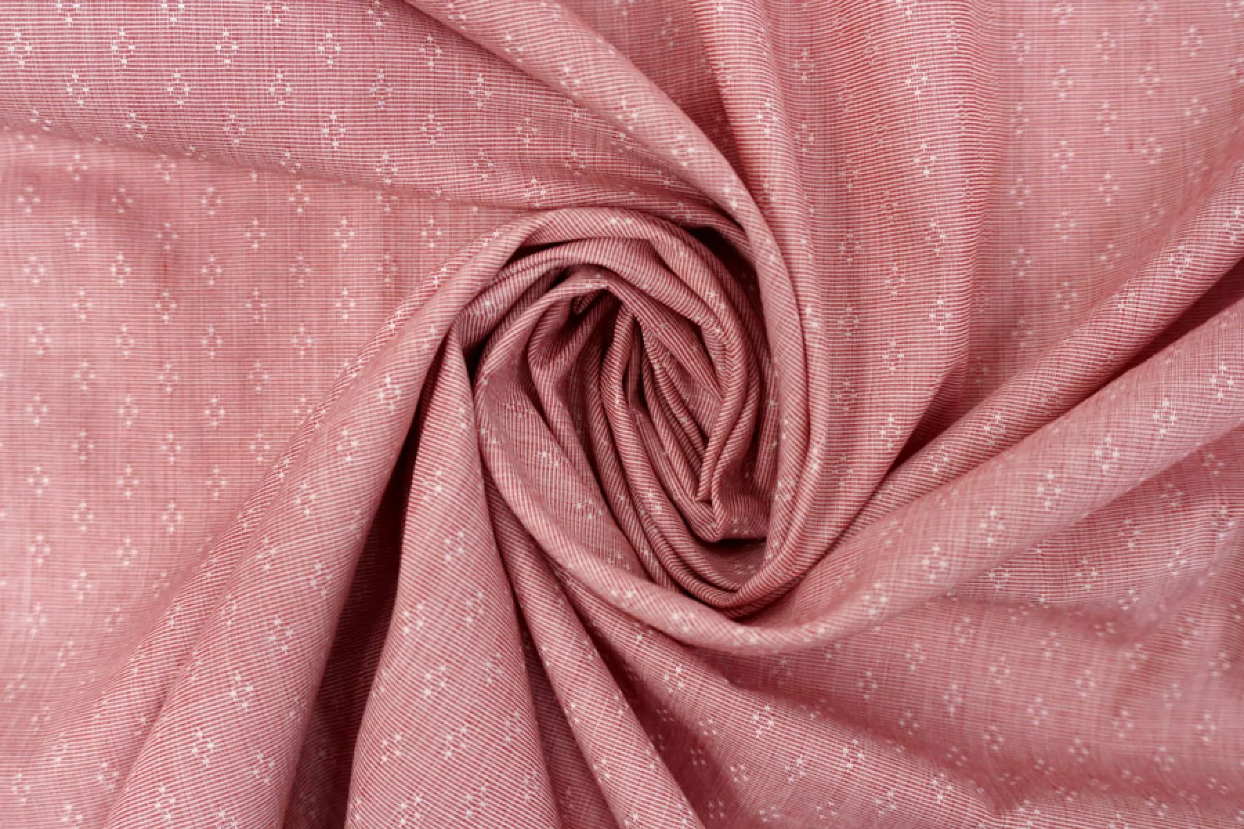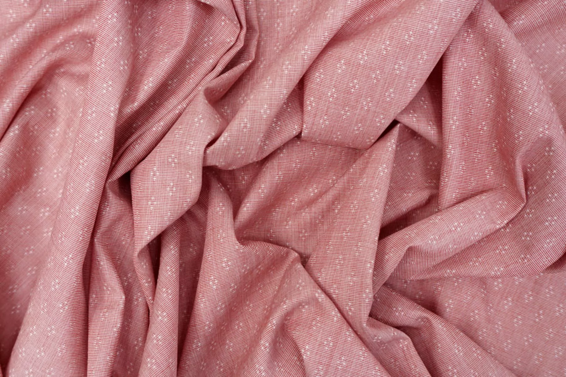 Итальянский рубашечный хлопок от Etro, с жаккардовой выработкой - мелким узором, нити белого и красного цвета. Материал гладкий, мягкий, тонкий, легкий. Немного мнется и немного просвечивает. Не тянется, очень пластичный и форму практически не держит. Прекрасный вариант на рубашки, юбки, платья. Для платья или юбки может потребоваться подкладка. Материал дает усадку.