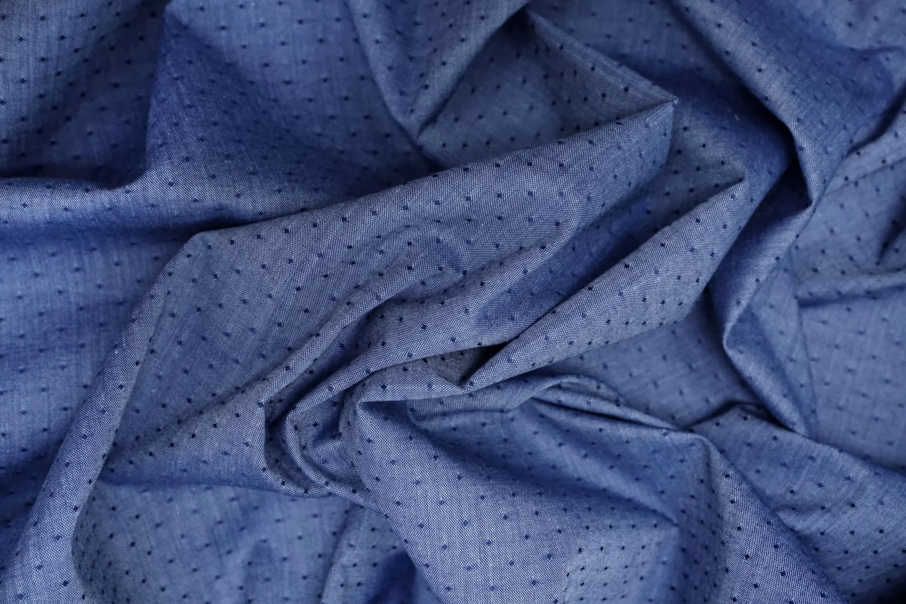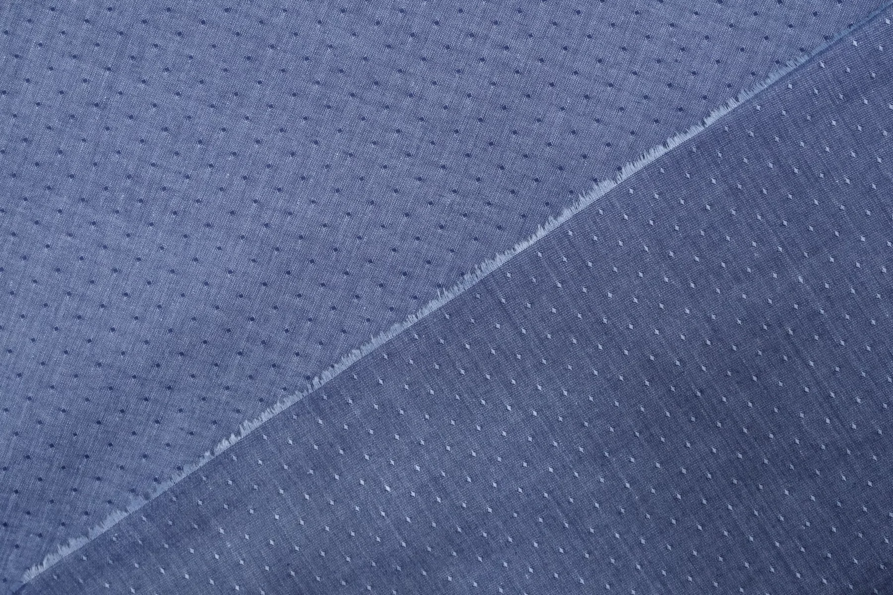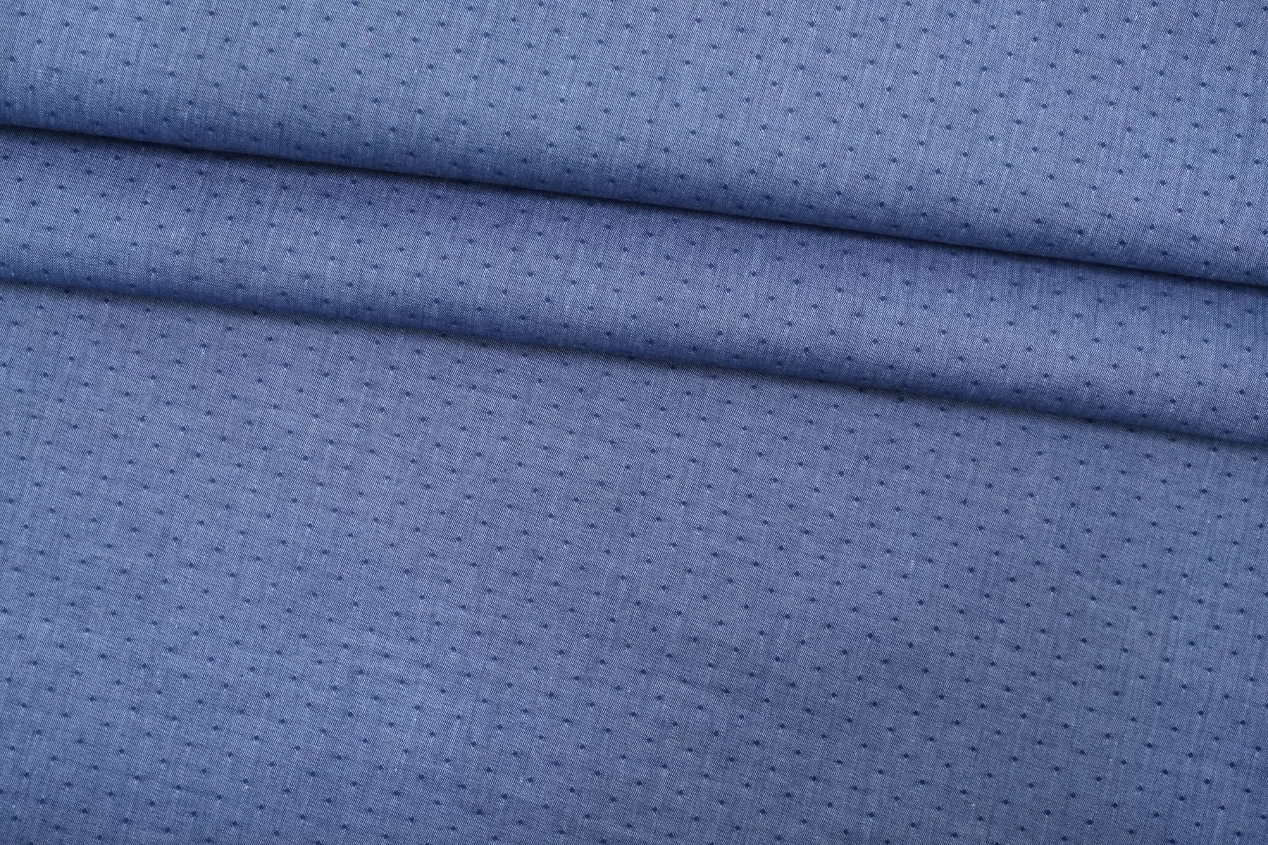 Рубашечный хлопок от Etro с жаккардовым узором в виде точек, нити темно-синего и голубого цвета. Тактильно очень приятный, легкий, просвечивает силуэт, если смотреть прямо на просвет. Хорошо драпируется и немного держит форму. Не тянется. Немного мнется. Отлично подойдет на платья, юбки, рубашки. Учитывайте усадку материала!