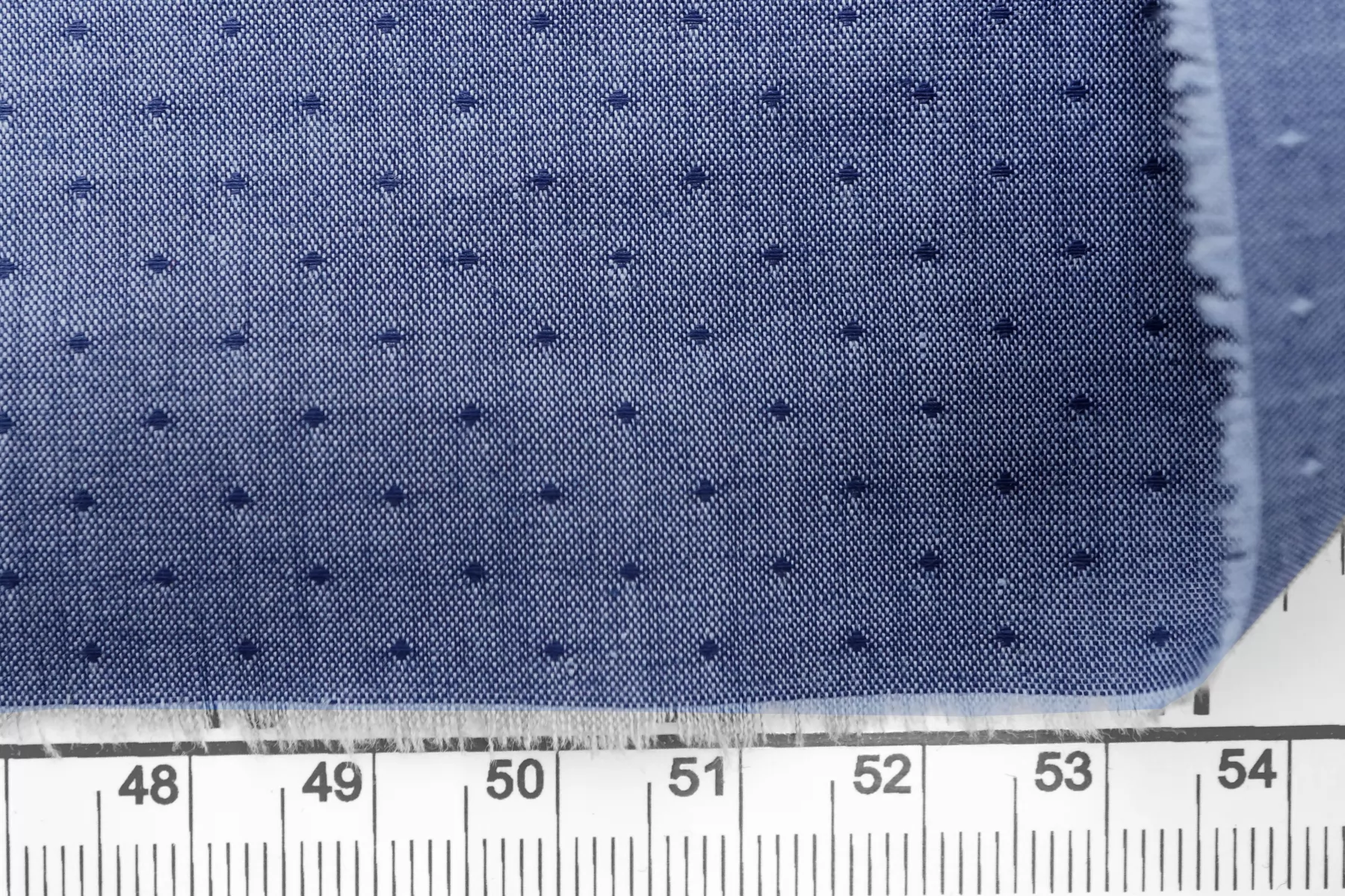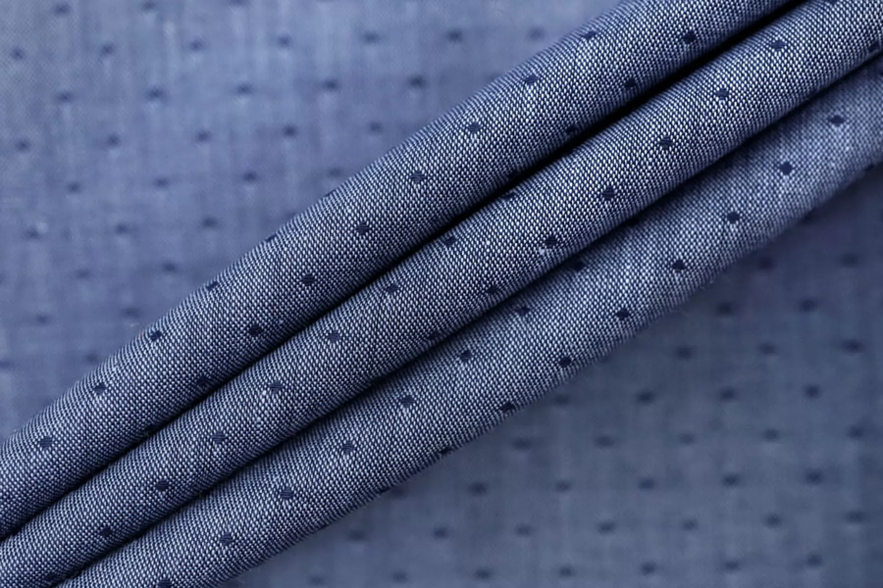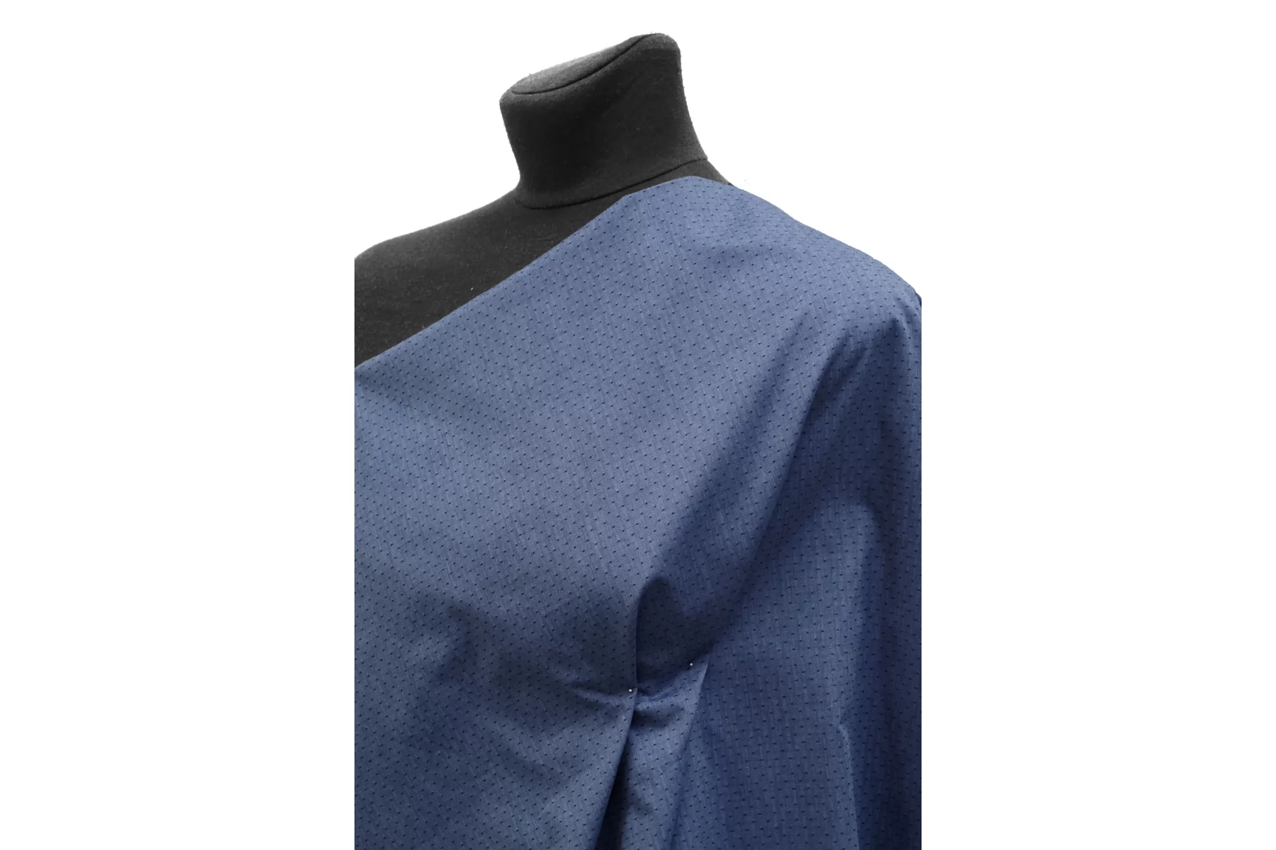 Рубашечный хлопок от Etro с жаккардовым узором в виде точек, нити темно-синего и голубого цвета. Тактильно очень приятный, легкий, просвечивает силуэт, если смотреть прямо на просвет. Хорошо драпируется и немного держит форму. Не тянется. Немного мнется. Отлично подойдет на платья, юбки, рубашки. Учитывайте усадку материала!