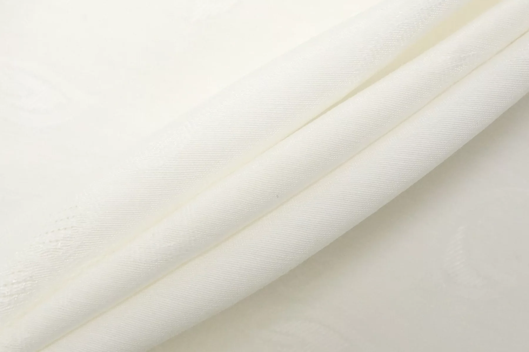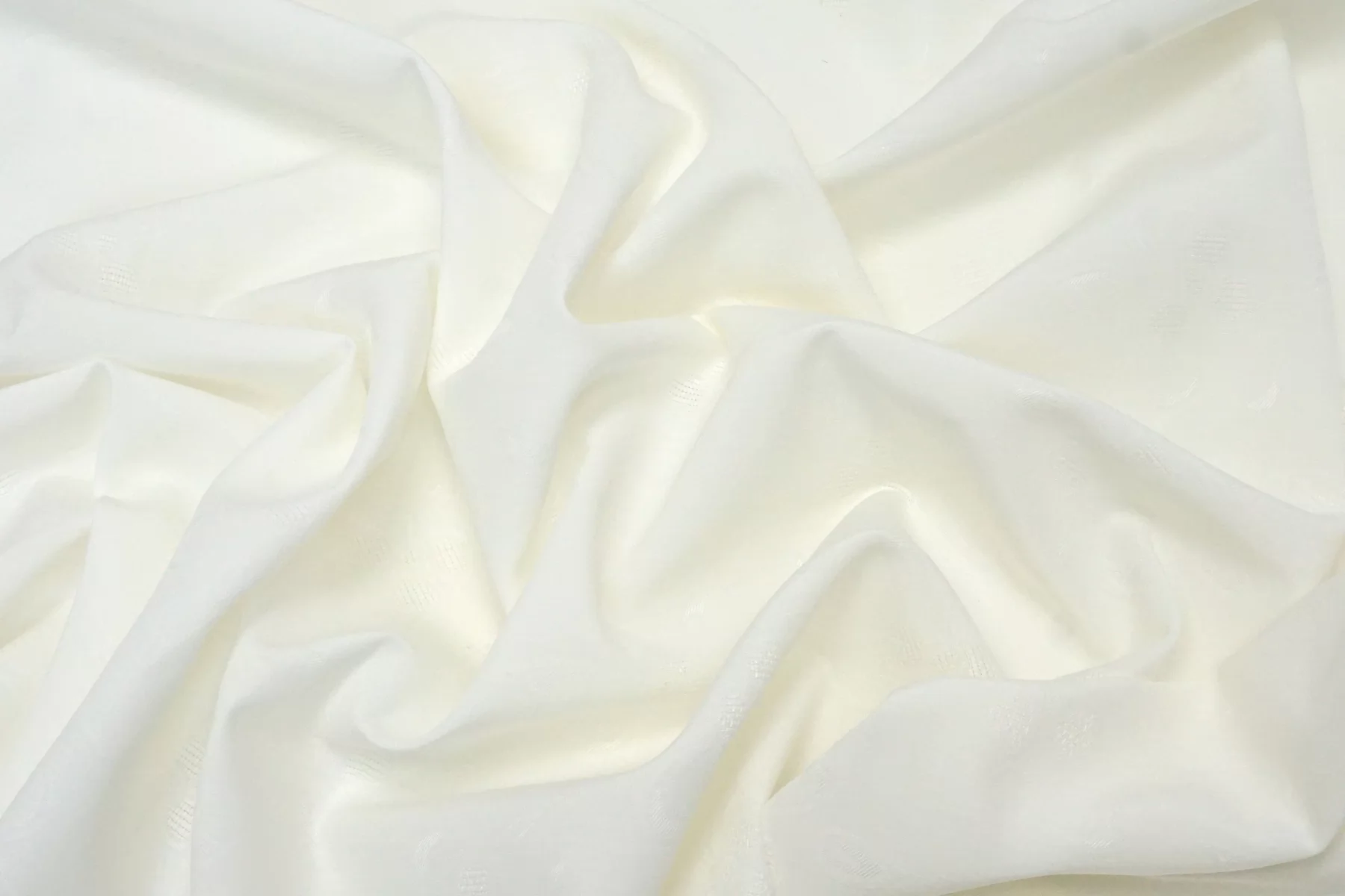 Внимание! Весь рулон в пыльных загрязнениях и пятнах каждые 30-40 см, возможно отстирается см. фото. Шикарного качества рубашечный жаккардовый хлопок с добавлением вискозы с выработкой в виде цветочного узора в молочном оттенке. Мягкий, гладкий, даже шелковистый наощупь. Пластичный, немножко держит форму. Просвечивает, не тянется. Сминается. Идеальный вариант для рубашки, сарафана. Учитывайте усадку материала на 7-10%.