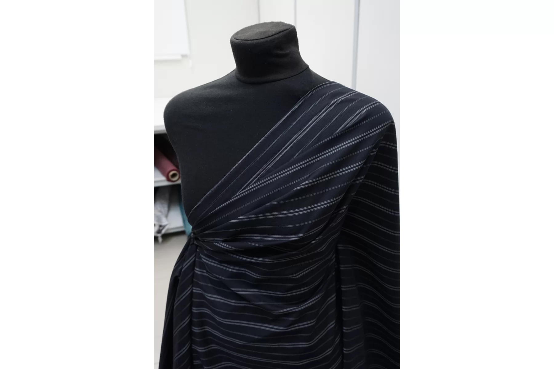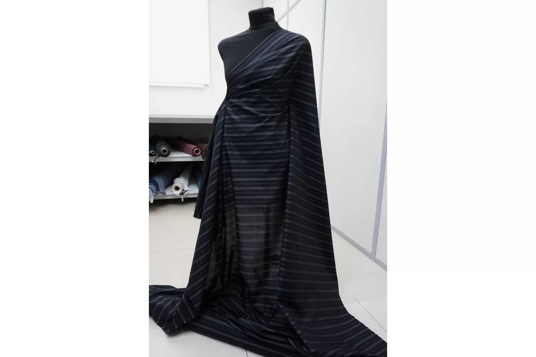 Итальянский рубашечный хлопок из нитей серого, чёрного и чёрно-синего цвета с жаккардовой выработкой и полоской (полоска поперек кромки). Тонкий, пластичный. Тактильно приятный, мягкий. Красиво смотрится в складке. Форму держит умеренно. Не тянется. Сминается. Просвечивает в один слой. Подойдет для пошива платья, рубашки, юбки, сарафана. Учитывайте возможную усадку.