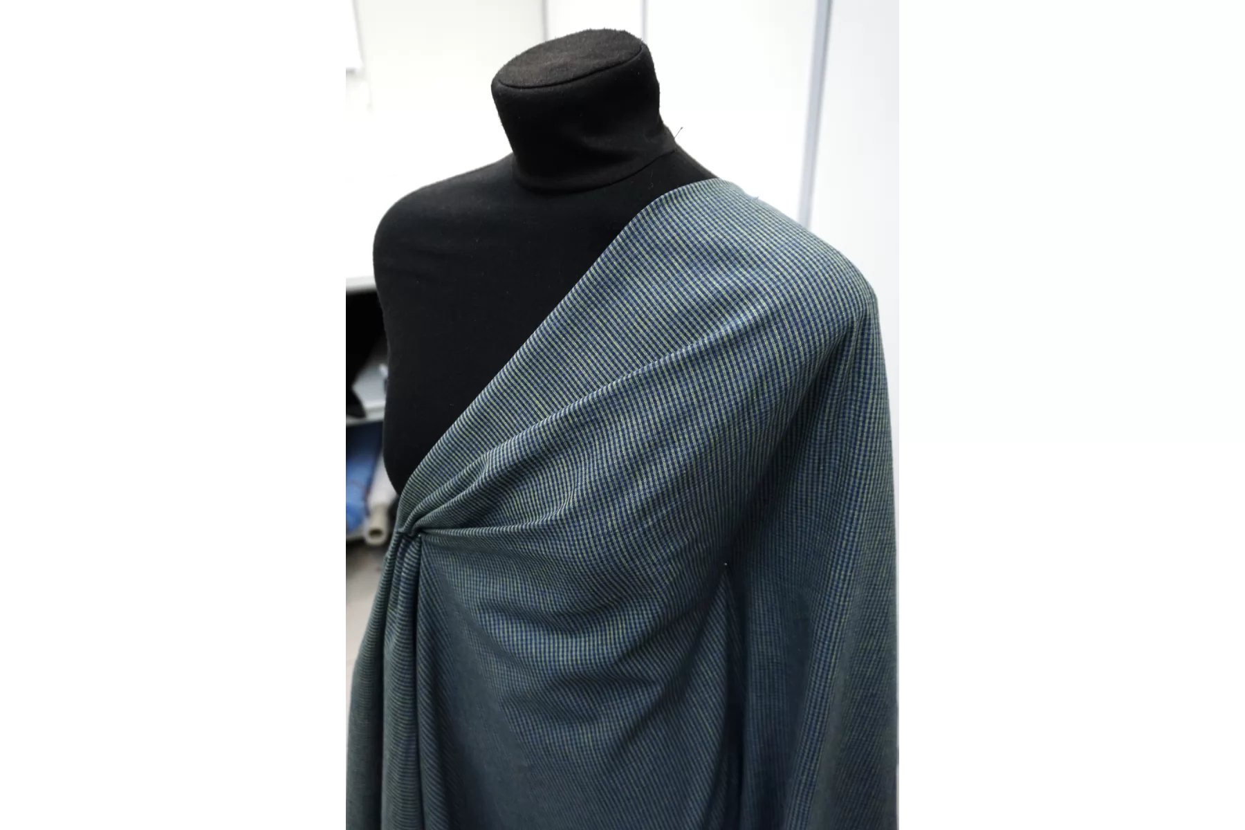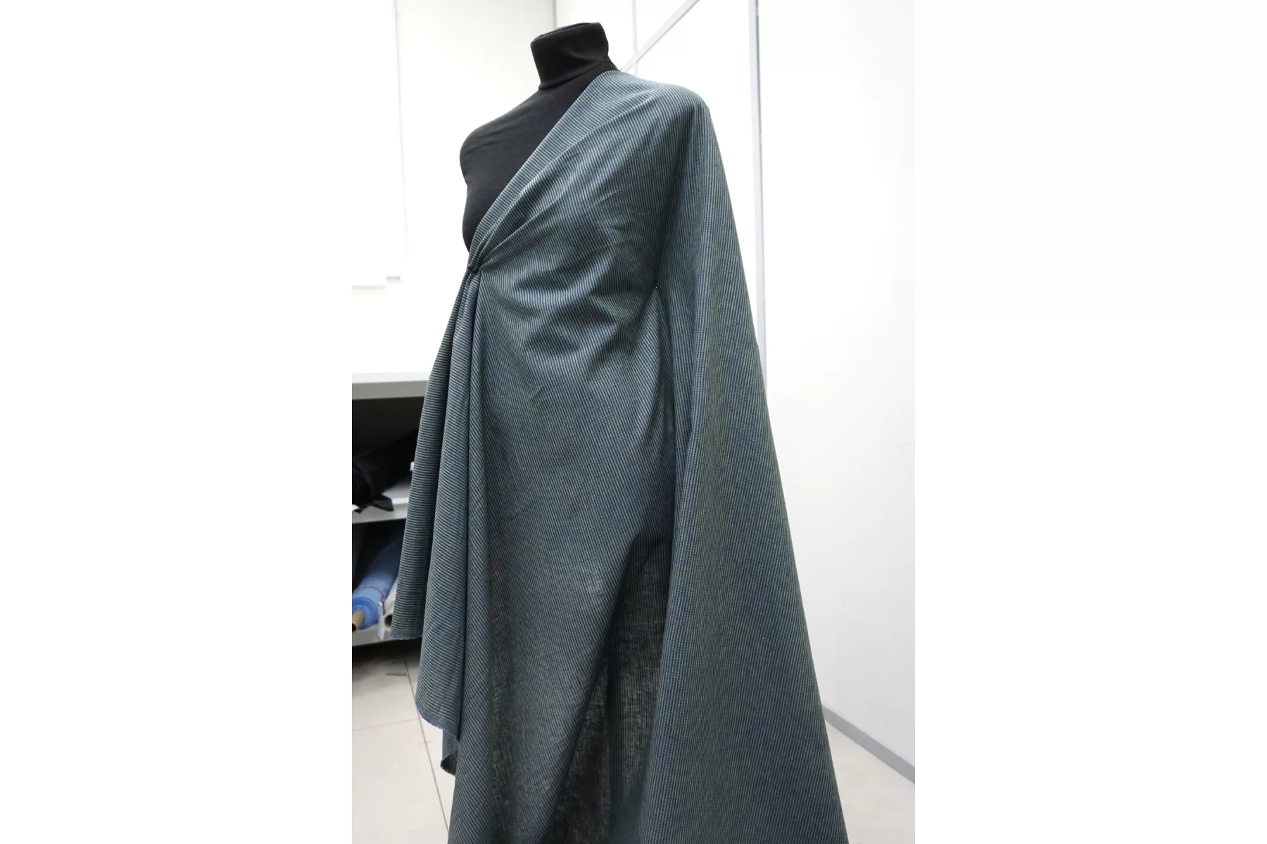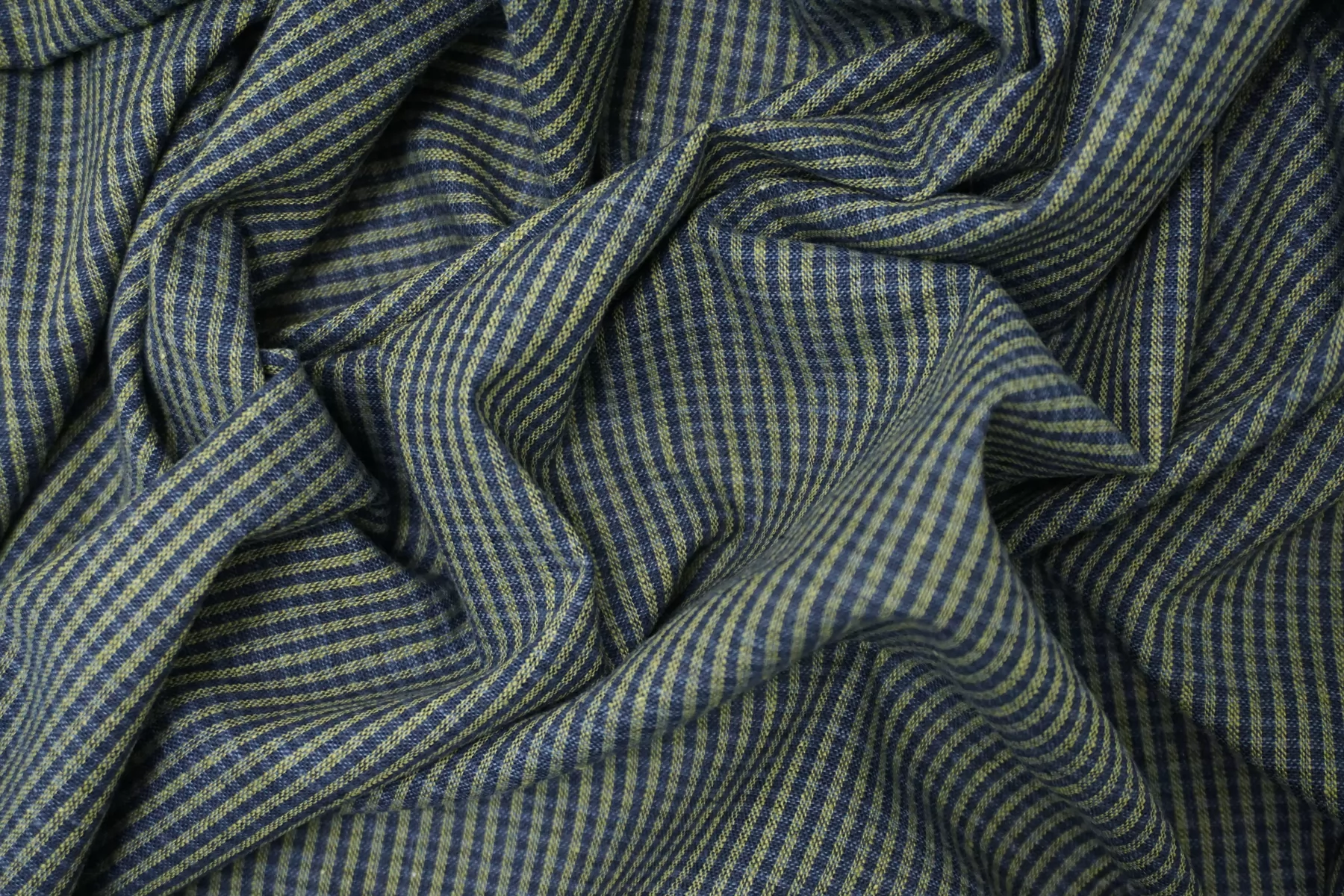 Итальянский лён с добавкой хлопка, полотняного плетения, рубашечной плотности, с узором-неявной клеткой, нити тёмно-синего, синего и зелёного цвета. Присутствуют классические льняные утолщения нити. Ткань тонкая, тактильно суховатая, просвечивает в один слой, мнется. Плетение не плотное. Отличный вариант для летнего изделия - платья, юбки, сарафана, рубашки.