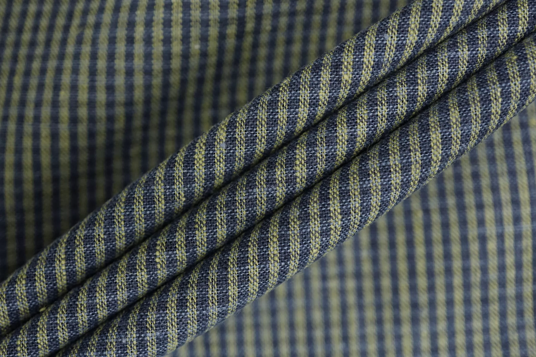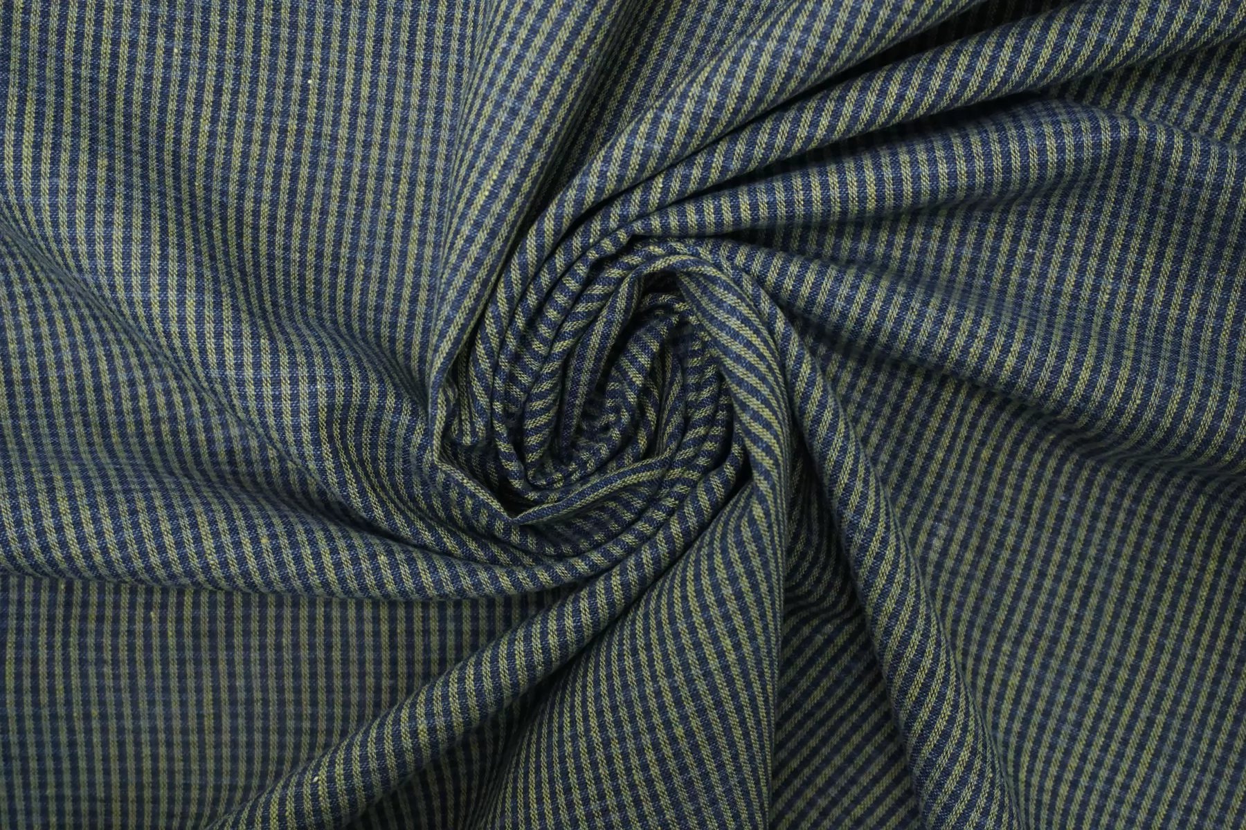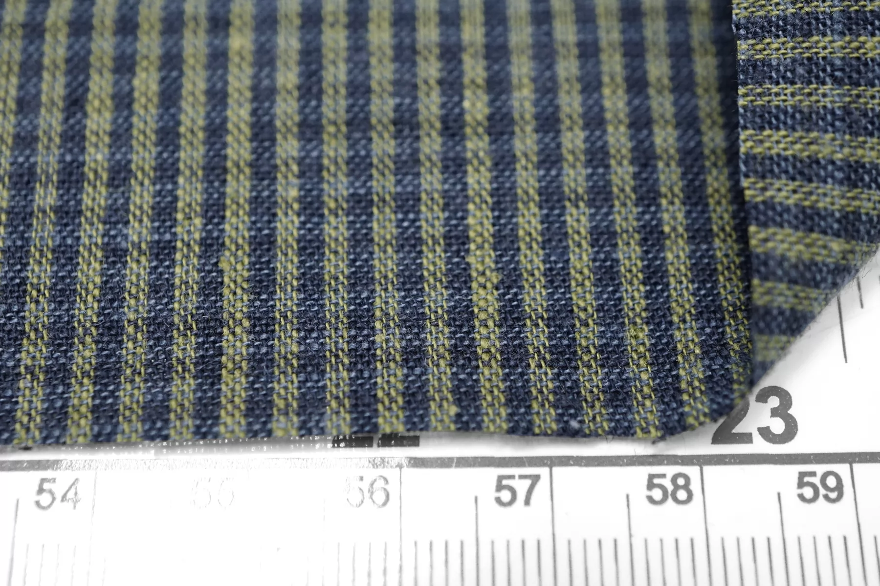 Итальянский лён с добавкой хлопка, полотняного плетения, рубашечной плотности, с узором-неявной клеткой, нити тёмно-синего, синего и зелёного цвета. Присутствуют классические льняные утолщения нити. Ткань тонкая, тактильно суховатая, просвечивает в один слой, мнется. Плетение не плотное. Отличный вариант для летнего изделия - платья, юбки, сарафана, рубашки.