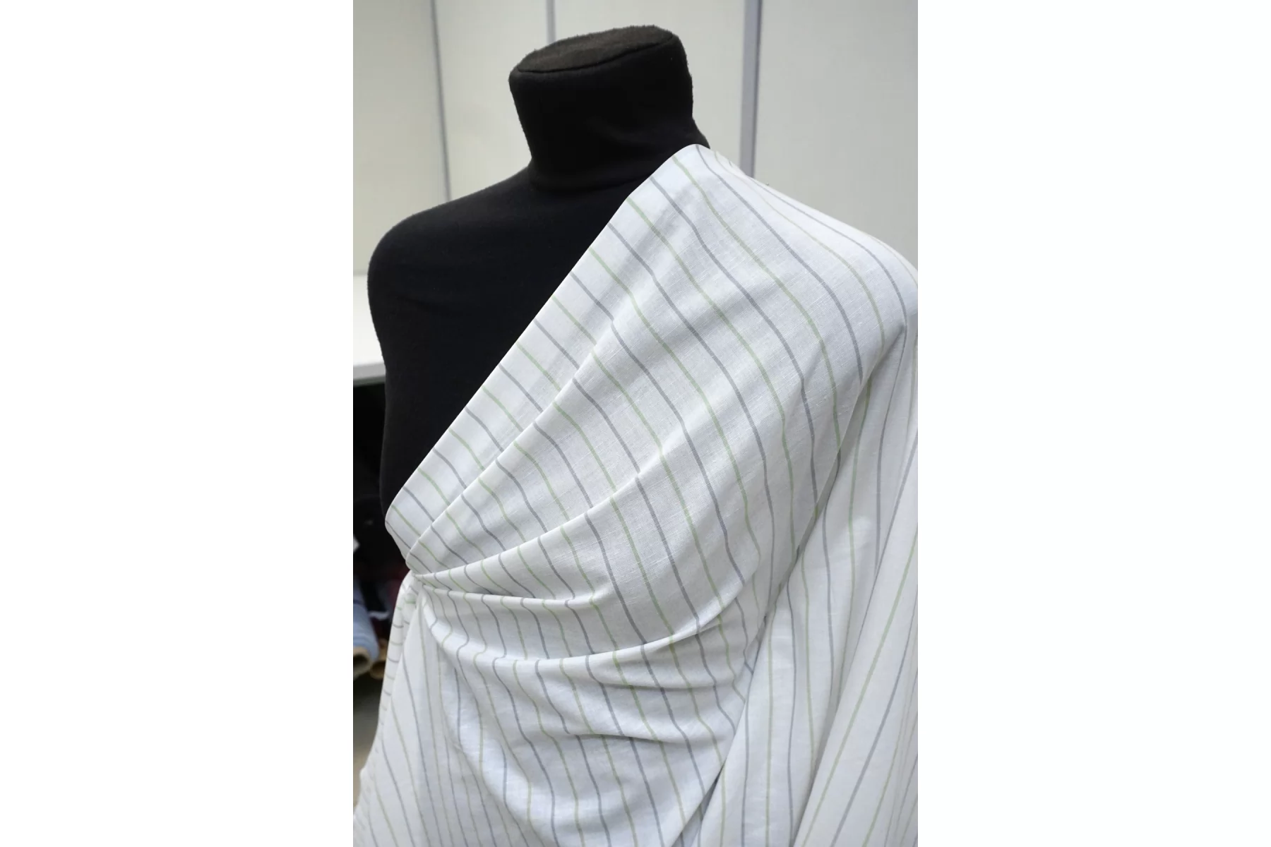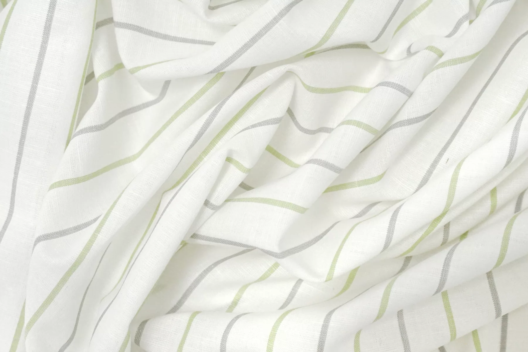 Итальянский лён с добавкой хлопка, полотняного плетения, рубашечной плотности, с узором-полоской, нити белого, серого и салатового цвета (полоска вдоль кромки). Присутствуют классические льняные утолщения нити. Ткань тонкая, тактильно суховатая, просвечивает, мнется. Плетение не плотное. Отличный вариант для летнего изделия - платья, юбки, сарафана, рубашки.