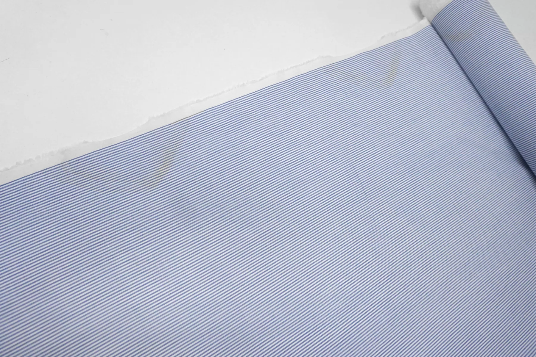 ВНИМАНИЕ!! Желты пятна (развода) у кромки каждые 20 см., рабочая ширина 148 см. см. фото. Итальянский хлопок рубашечной плотности, в полоску из нитей белого и сине-голубого цвета (проходит вдоль кромки). С фактурными утолщениями нити под лён. Материал гладкий, мягкий, тонкий. Мнется. Немного просвечивает в один слой, не тянется. Пластичный и немного держит форму. Прекрасный вариант на рубашки, юбки, платья. Материал дает усадку.