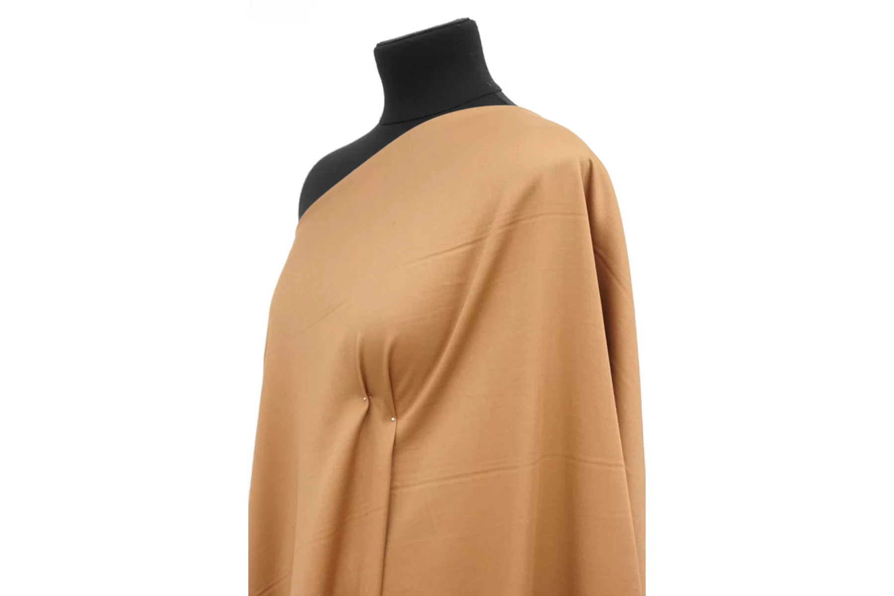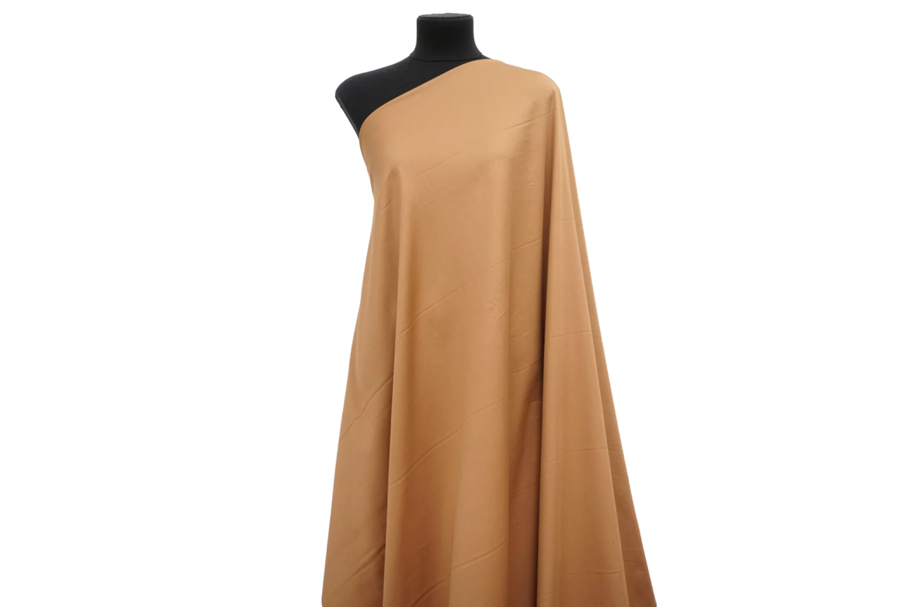 Рубашечно-плательный хлопок-стрейч сатинового плетения красивого песочного оттенка. Материал тактильно приятный, мягкий. Упруго тянется за счет небольшого содержания эластана. Слегка просвечивает силуэт, если смотреть на просвет. Хорошо драпируется и немного держит форму. Немного мнется. Шьем платье, юбку, рубашку и другие варианты. При необходимости используйте подкладочный материал.