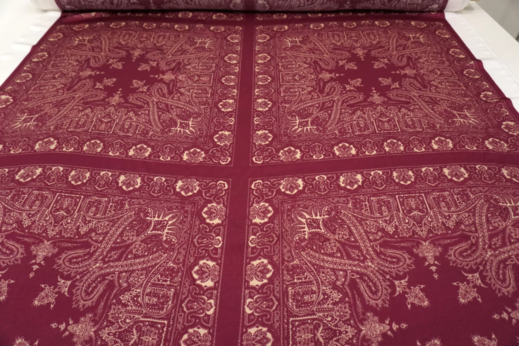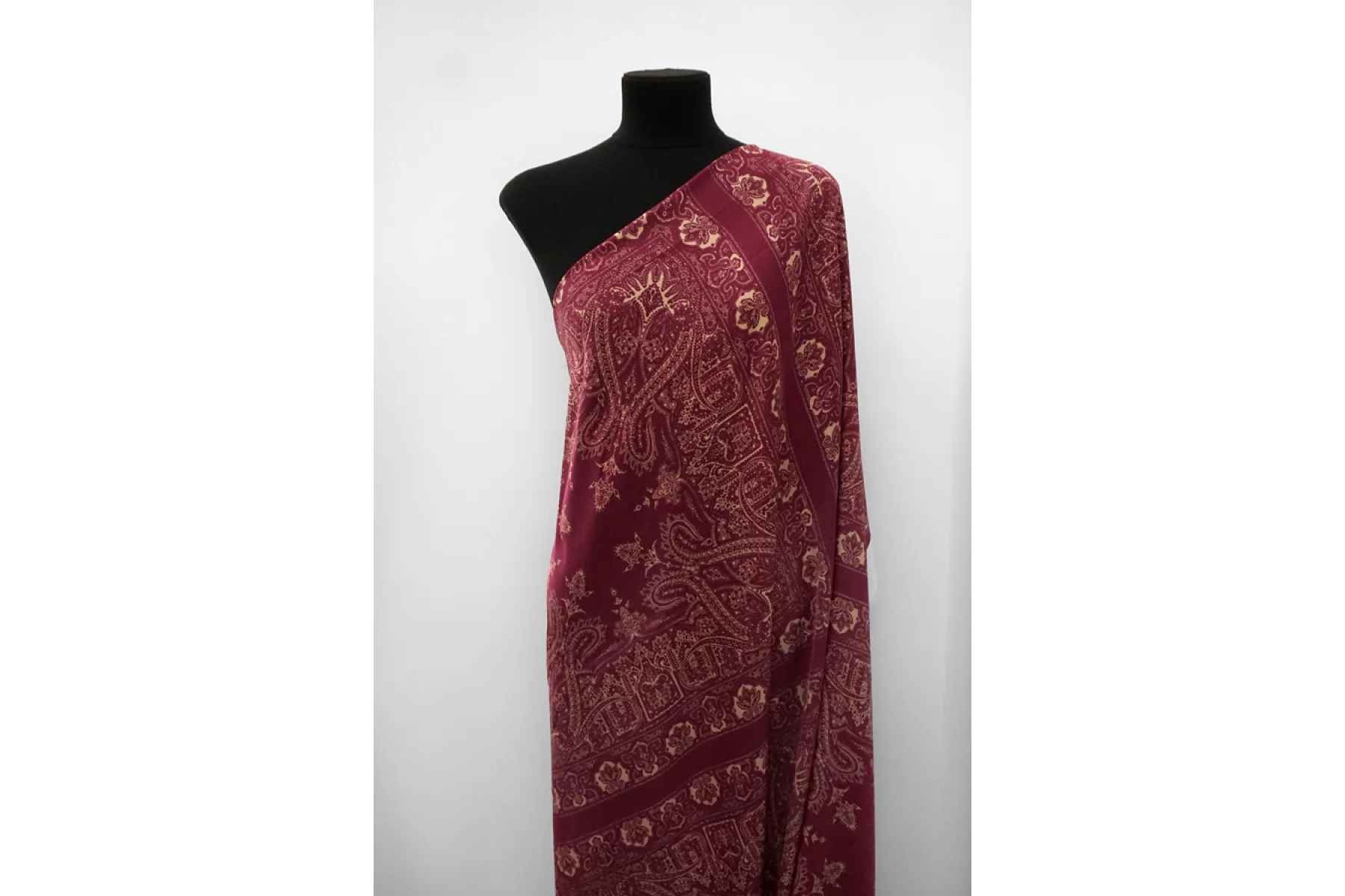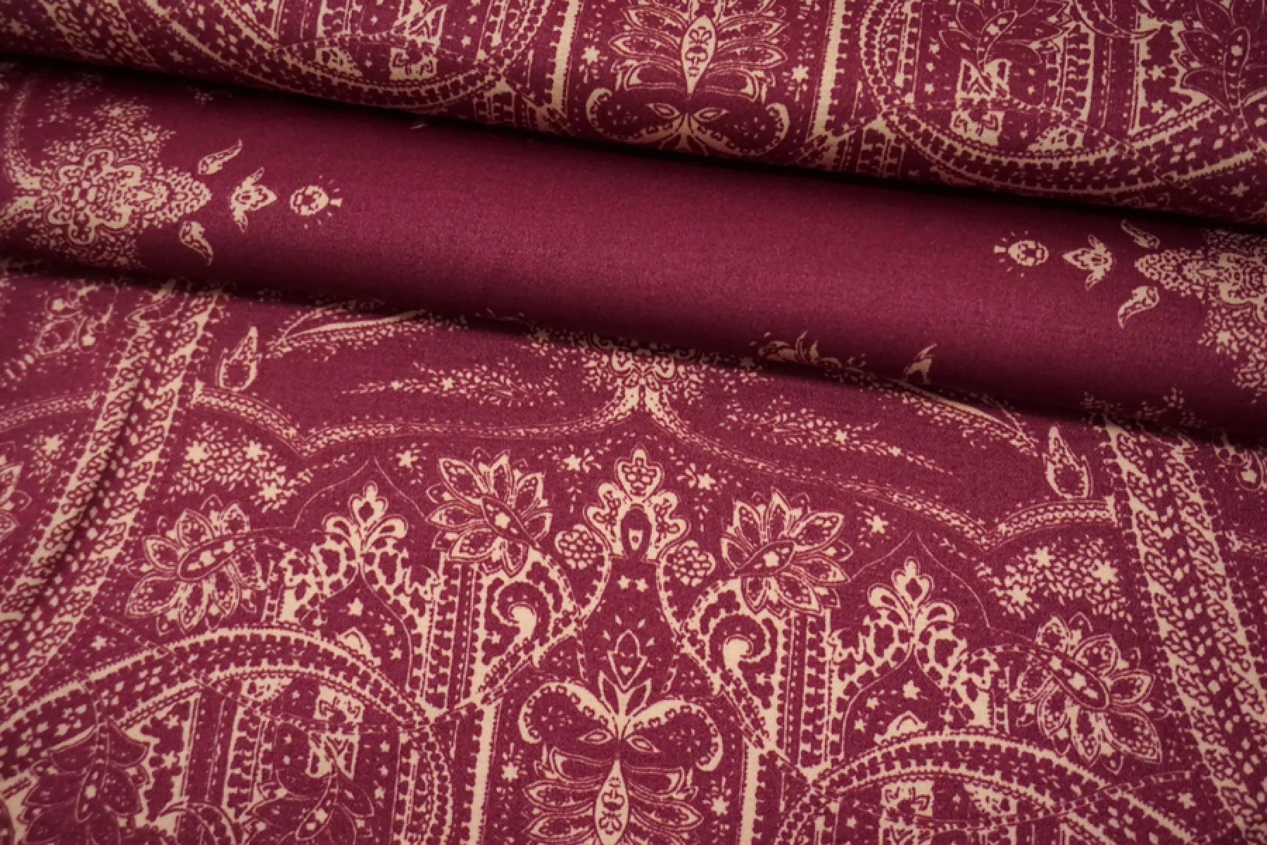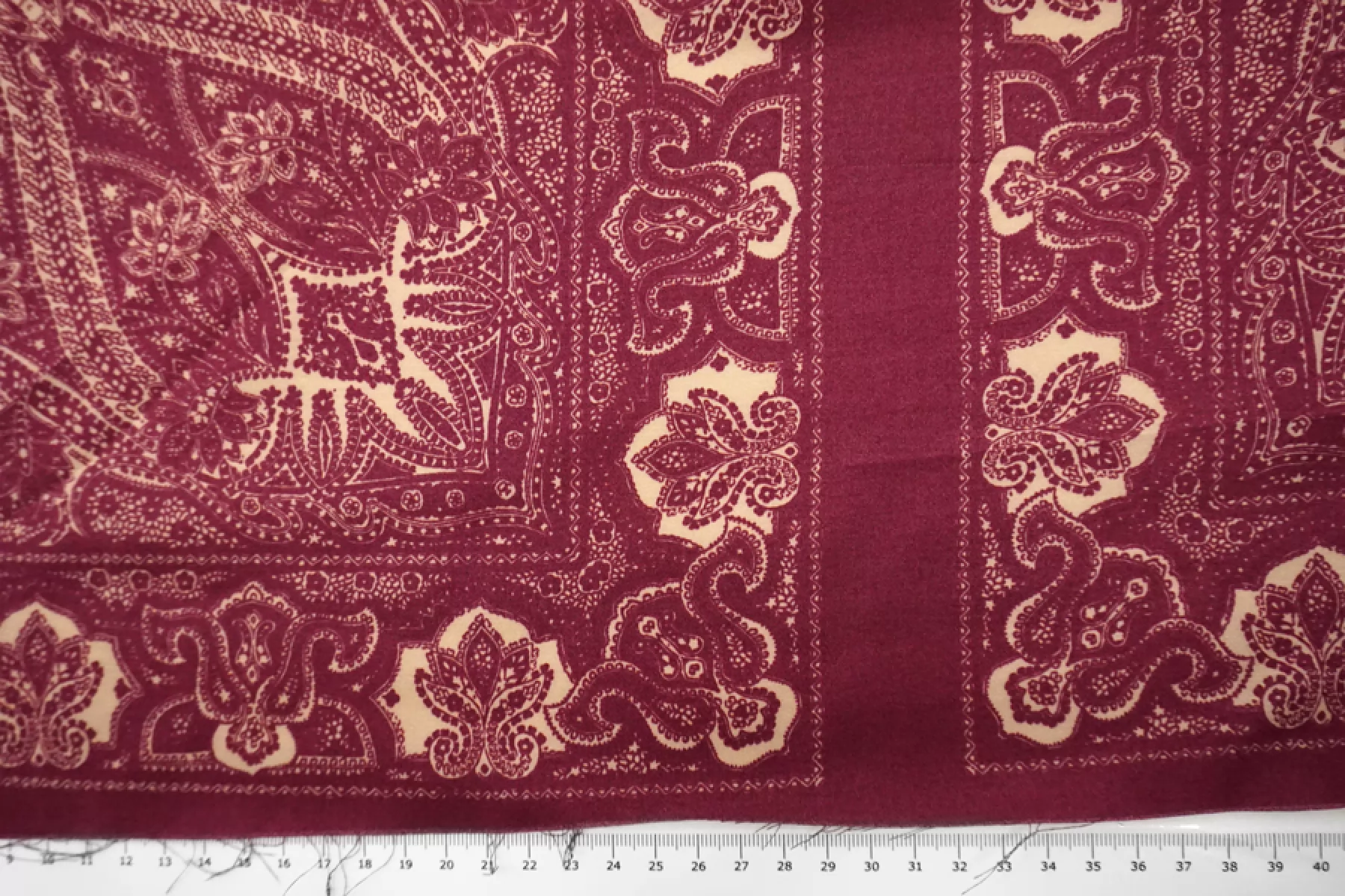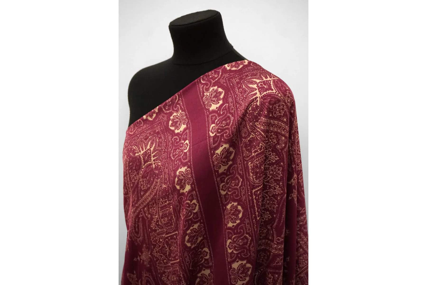 Итальянская вискоза с орнаментальным принтом в бордовой цветовой гамме. Принт разделен на квадраты в 60 см. Продается кратно 85 см. Цена за купон - 1351 руб. Тонкая, пластичная, с сатиновым плетением. Подойдет для пошива платья, юбки, туники, блузки, рубашки. Также можно использовать в качестве платков. При работе с этой тканью советуем использовать тонкие иглы и нитки.
