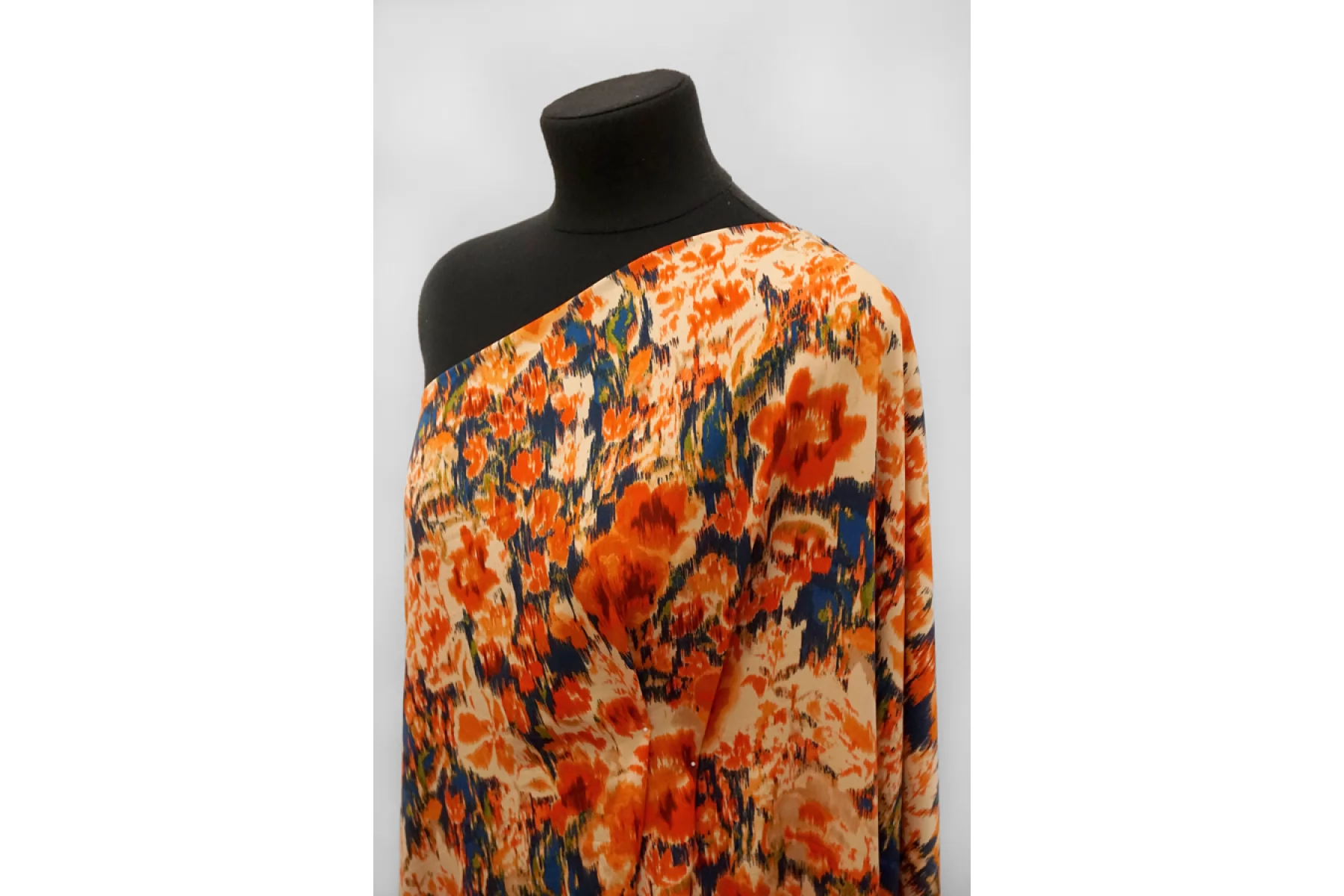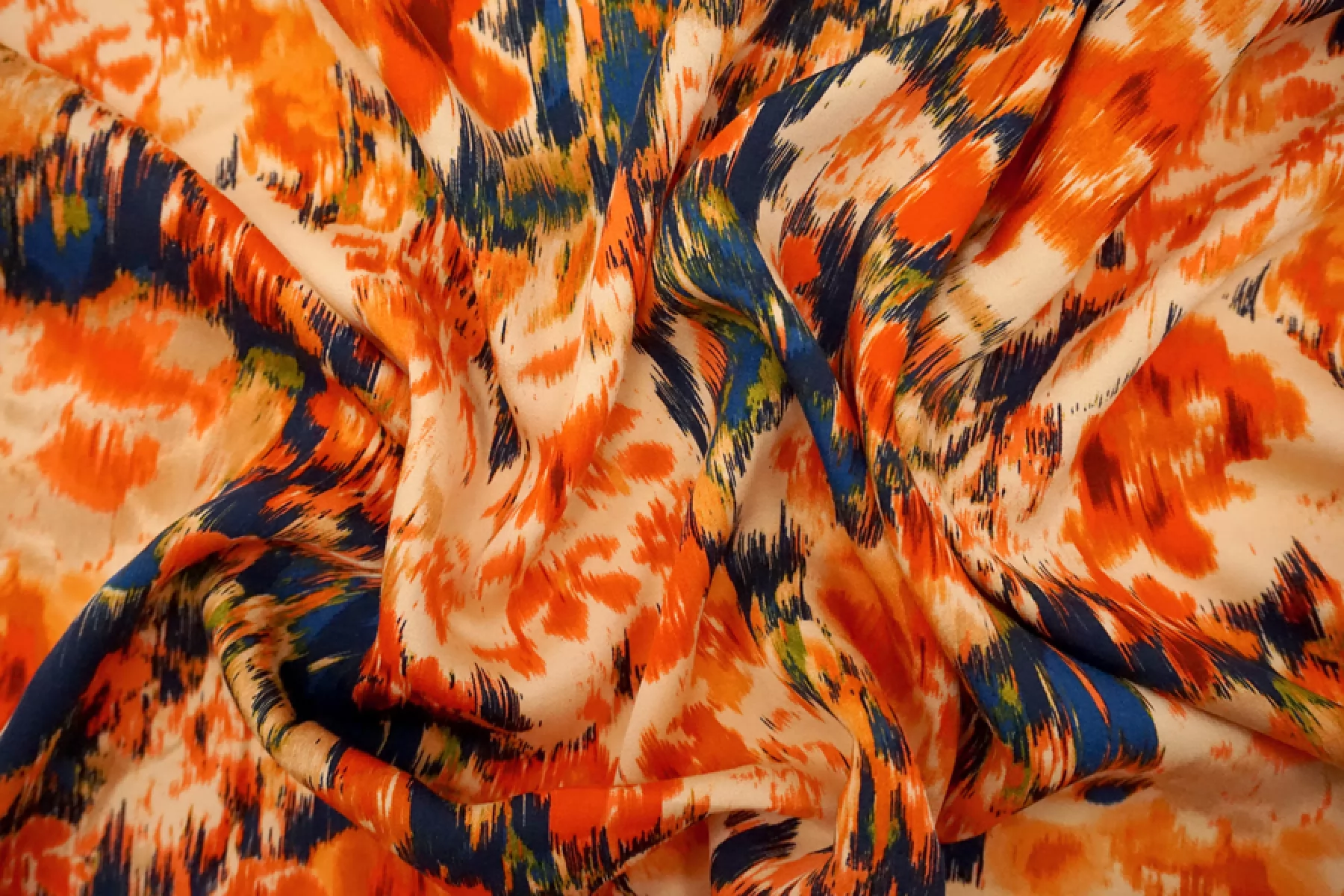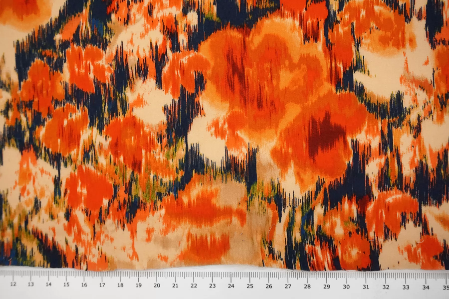 Итальянская вискоза со стилизованным цветочным принтом в оранжевом оттенке. Тонкая, пластичная, с сатиновым плетением. Подойдет для пошива платья, юбки, туники, блузки, рубашки. При работе с этой тканью советуем использовать тонкие иглы и нитки.