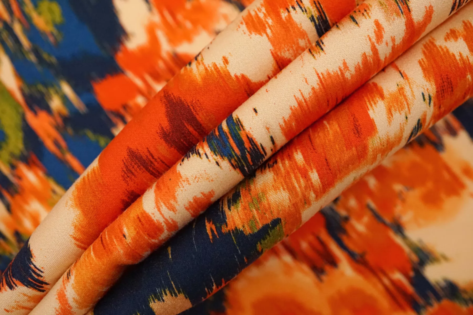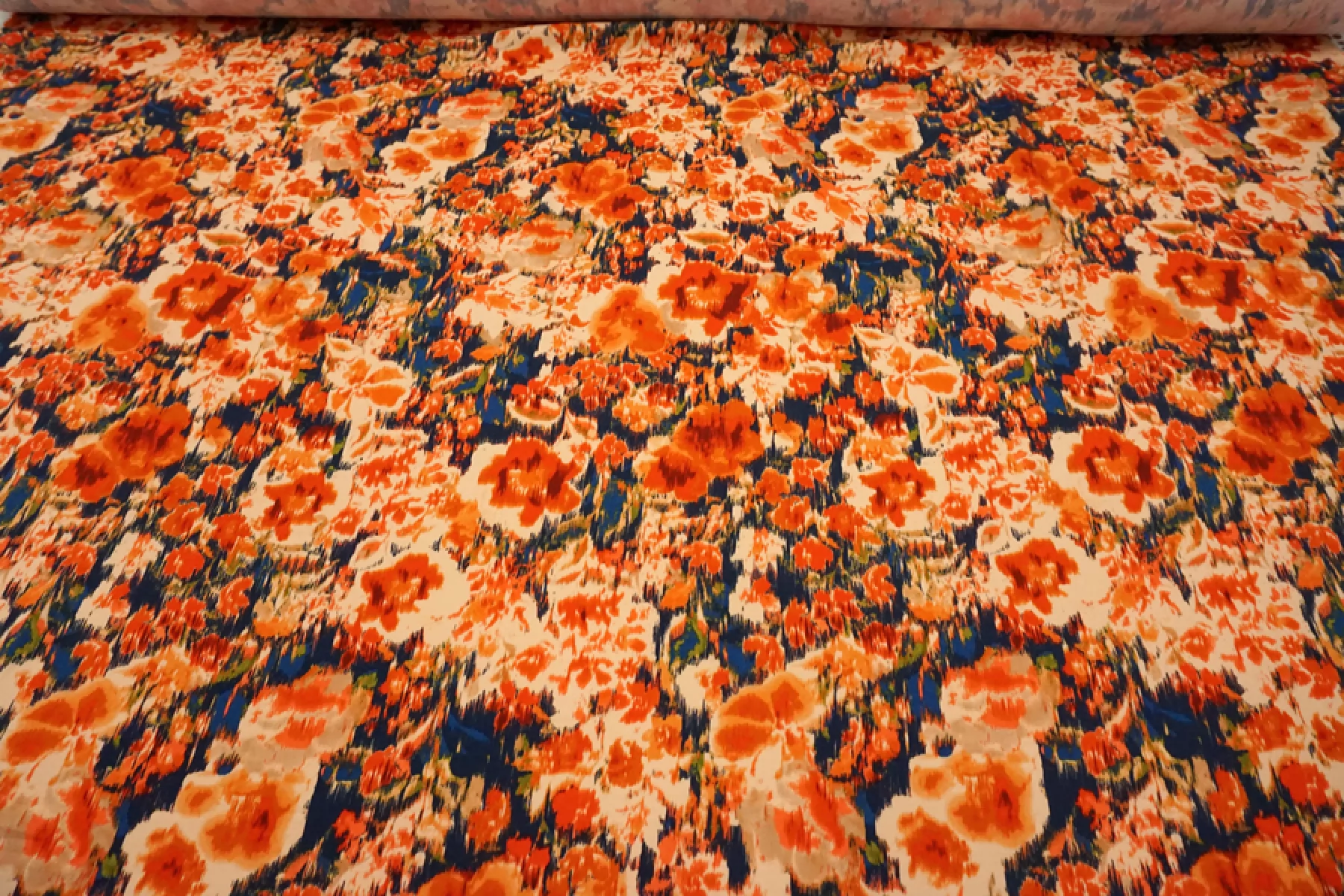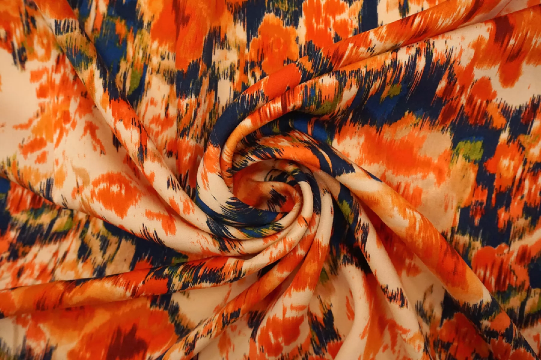Итальянская вискоза со стилизованным цветочным принтом в оранжевом оттенке. Тонкая, пластичная, с сатиновым плетением. Подойдет для пошива платья, юбки, туники, блузки, рубашки. При работе с этой тканью советуем использовать тонкие иглы и нитки.