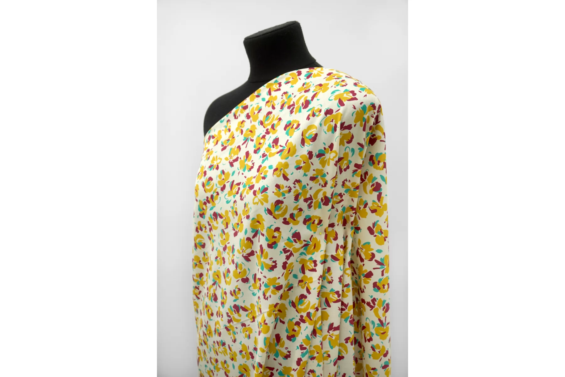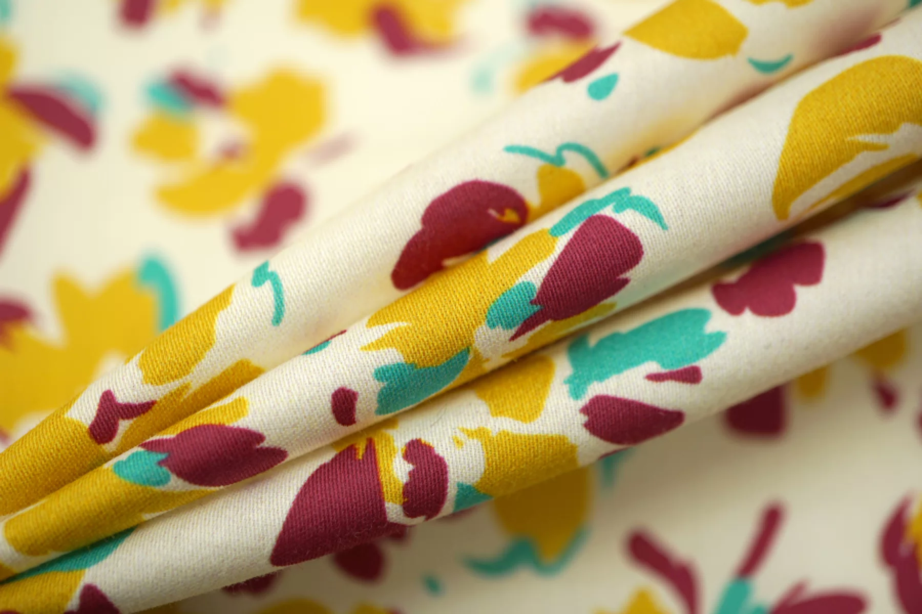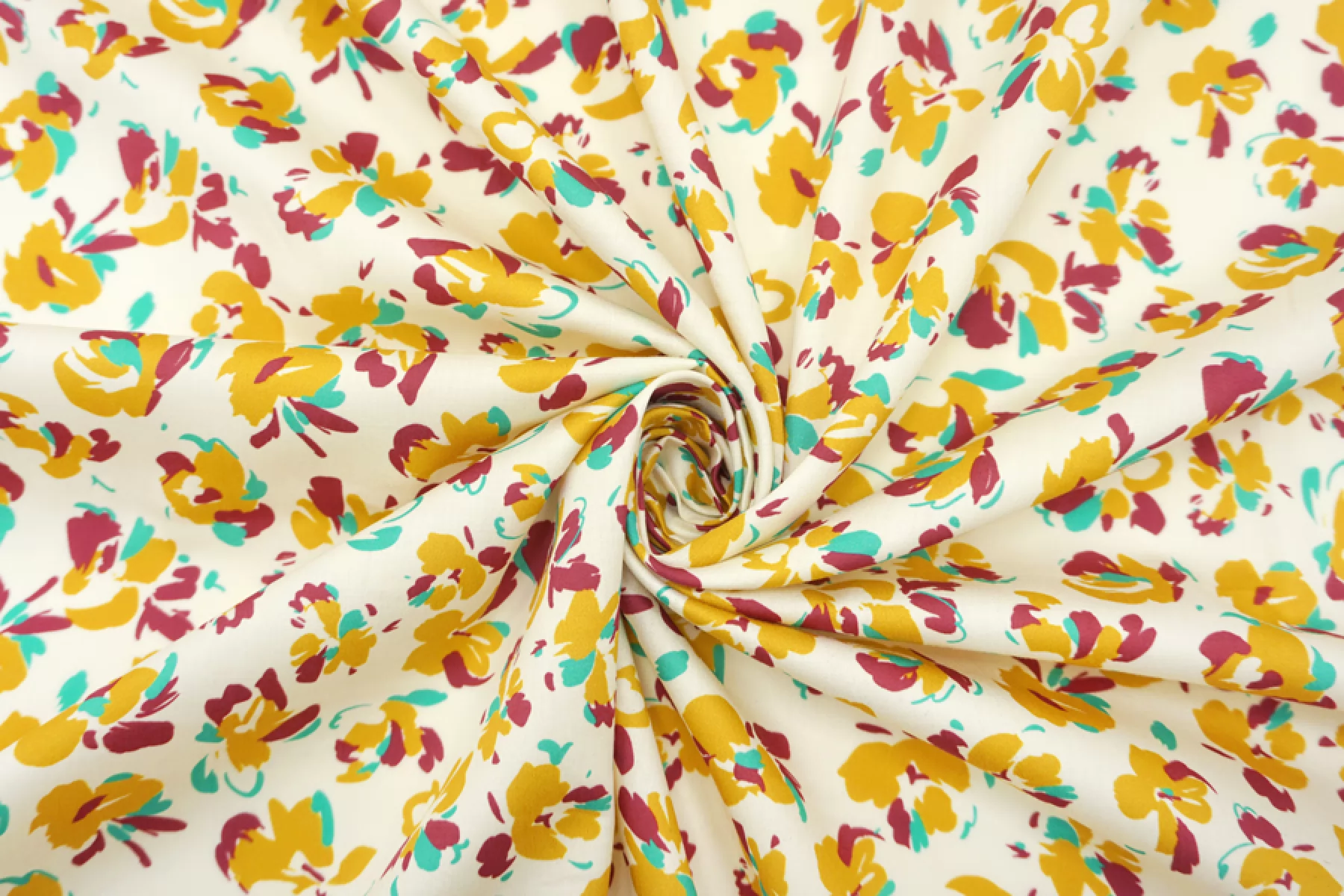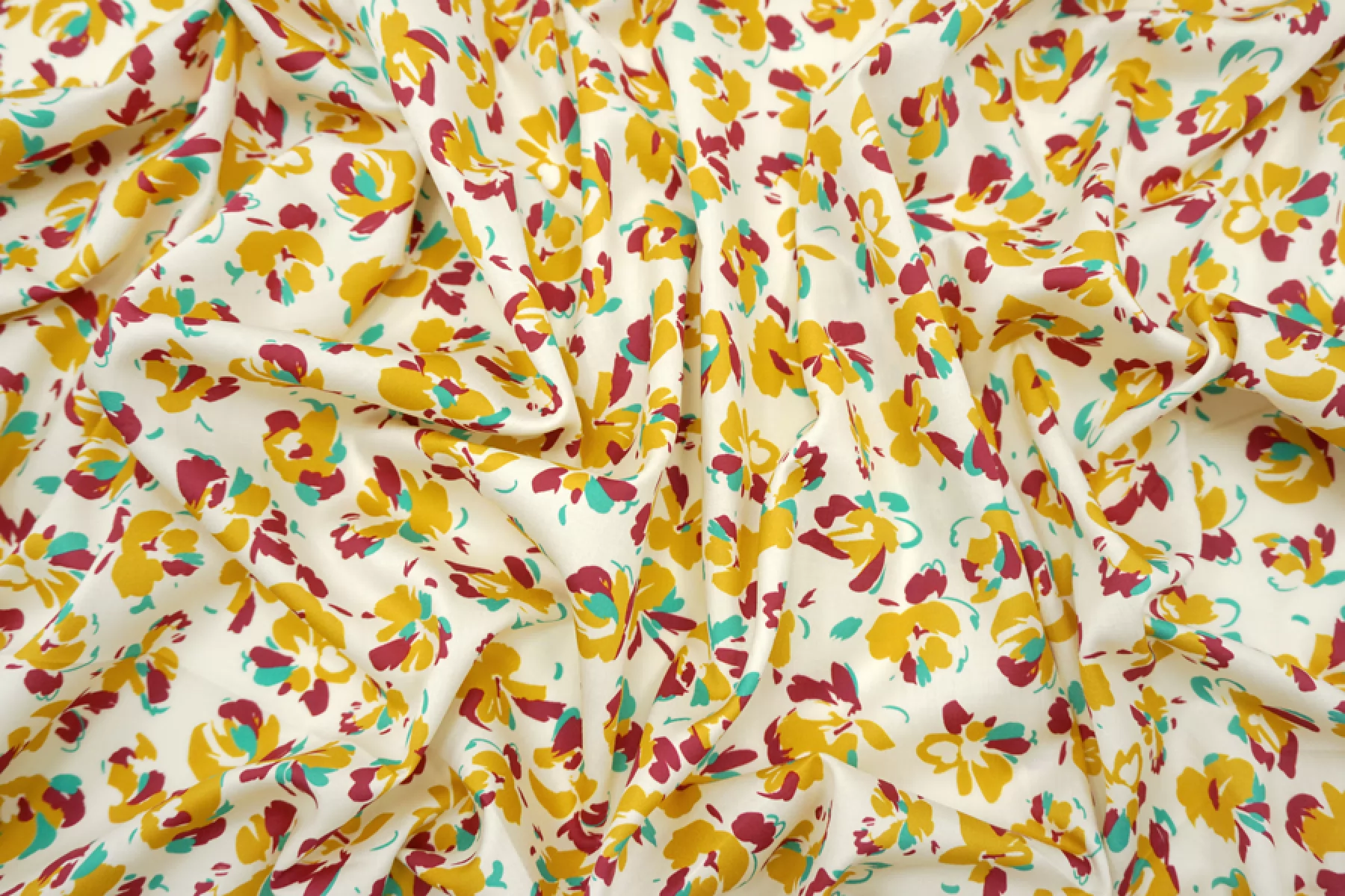 Тонкий сатин с принтом из абстрактных цветов, в стильной цветовой гамме (ягодный, бирюзово-зеленый и золотистый) на молочном фоне. Тонкий, пластичный, легкий. Подойдет для пошива платья, рубашки, юбки.