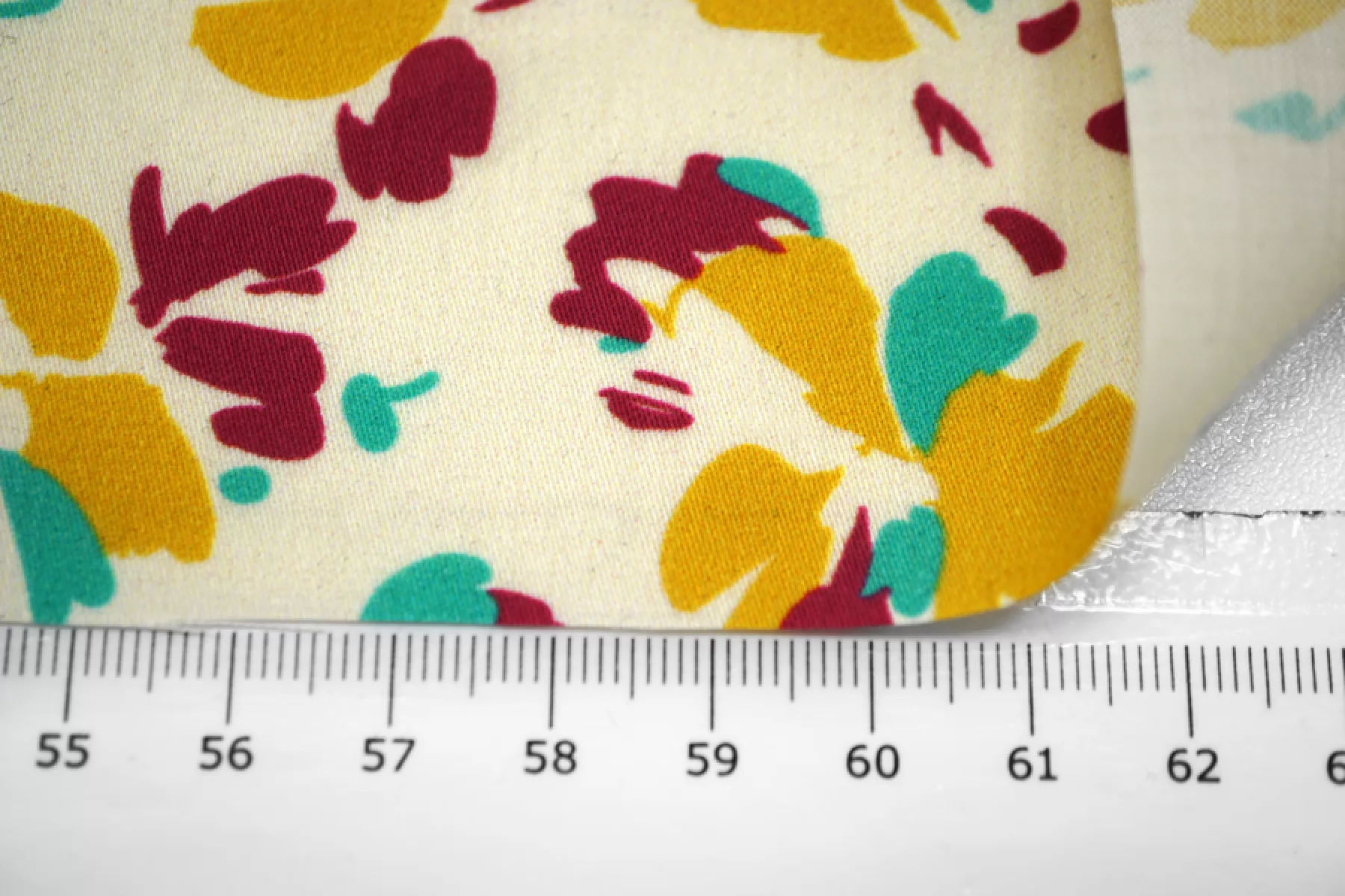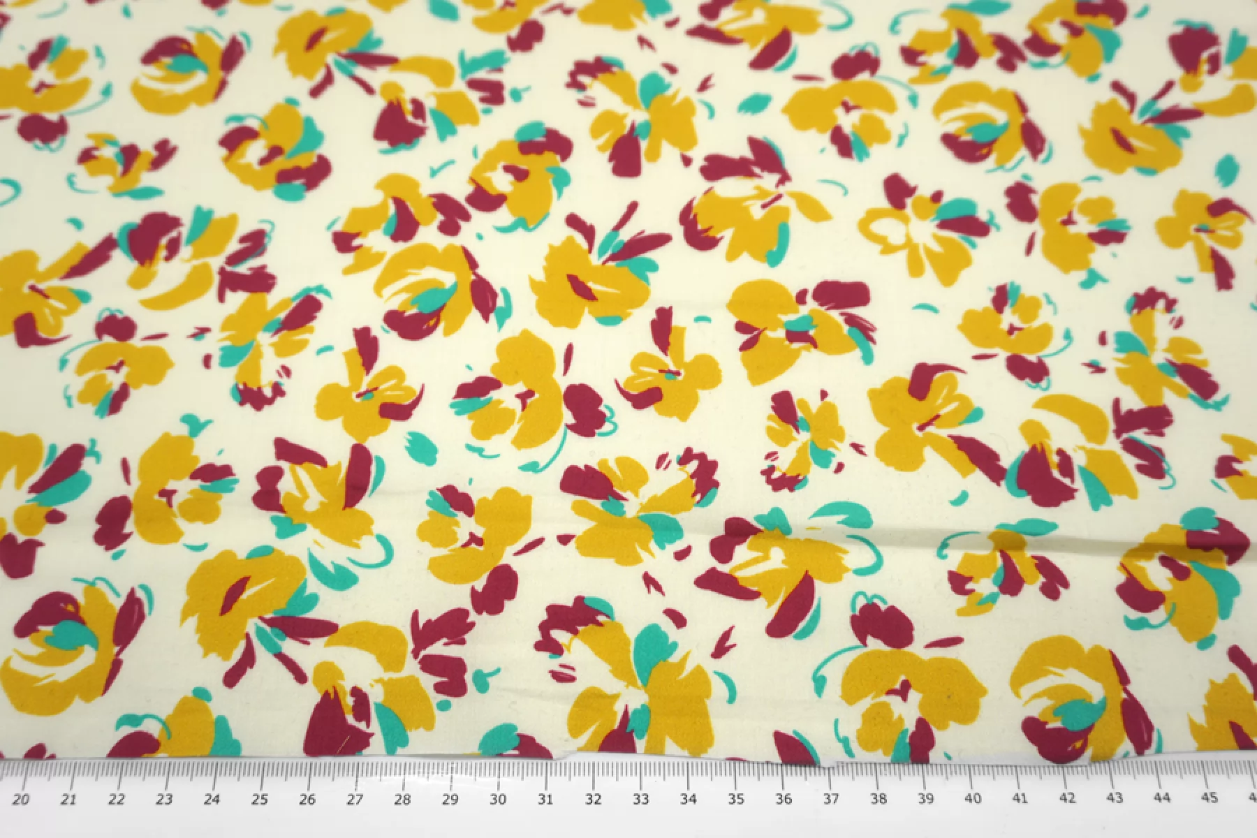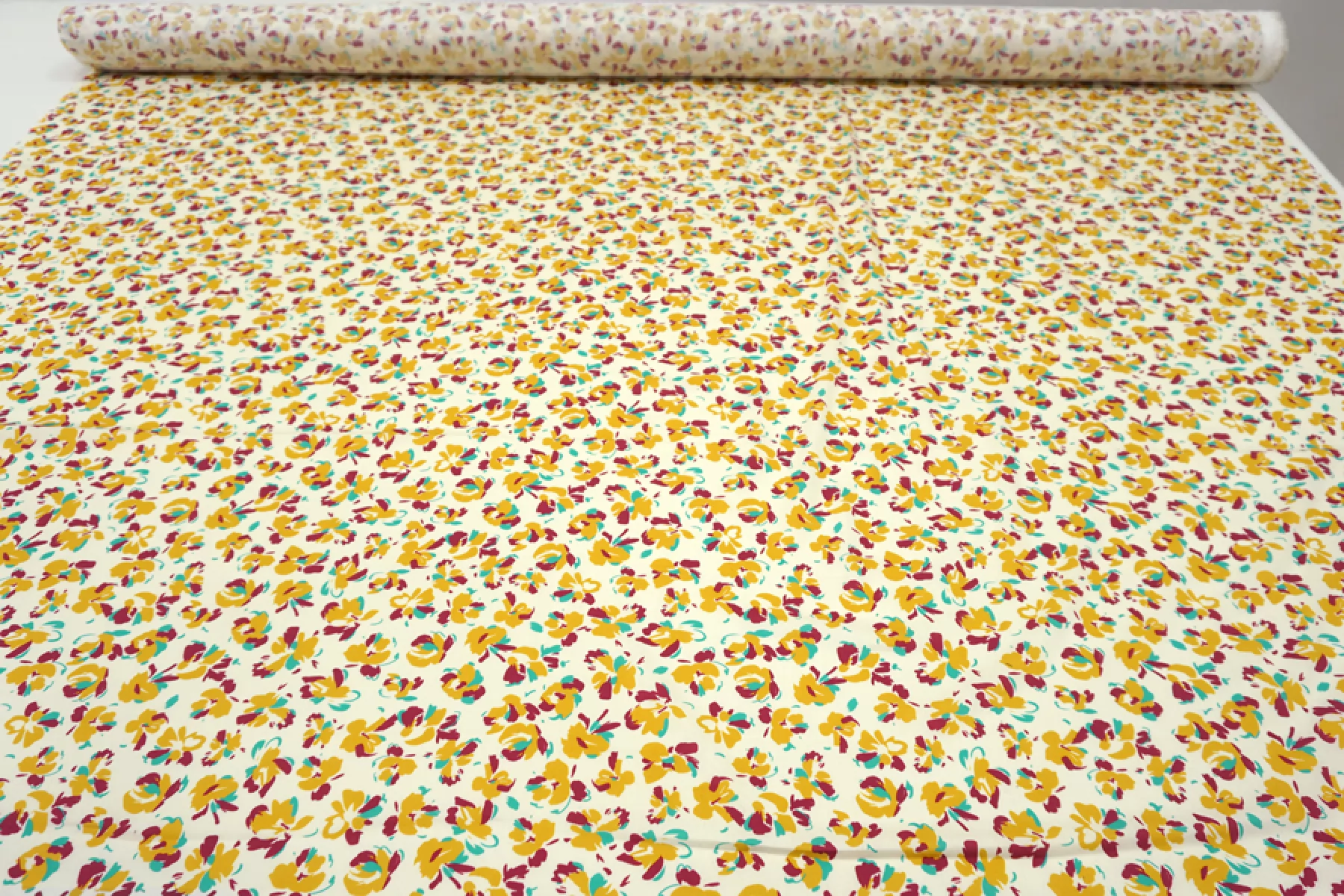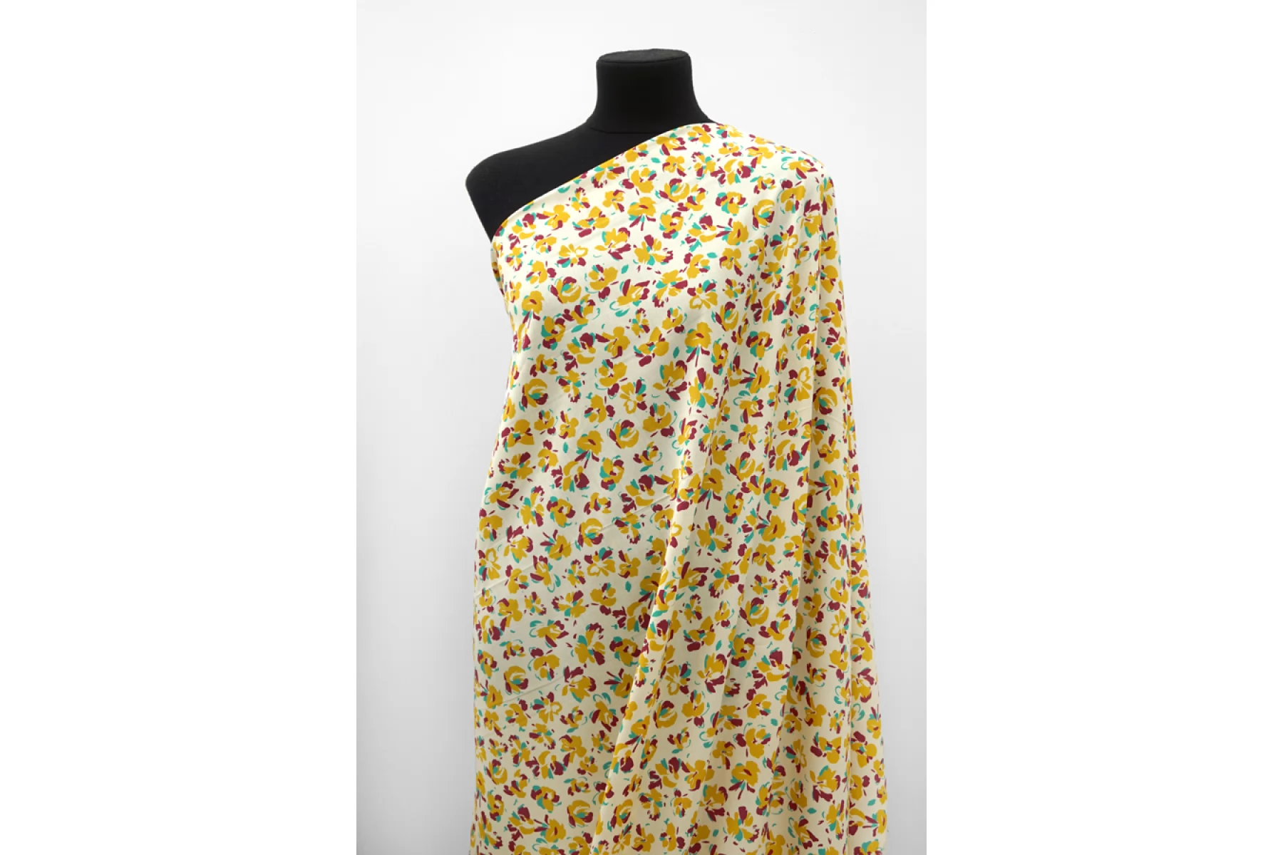 Тонкий сатин с принтом из абстрактных цветов, в стильной цветовой гамме (ягодный, бирюзово-зеленый и золотистый) на молочном фоне. Тонкий, пластичный, легкий. Подойдет для пошива платья, рубашки, юбки.