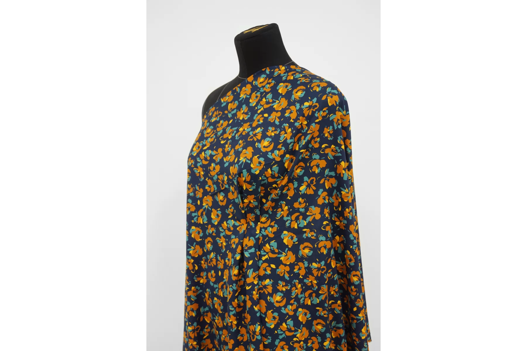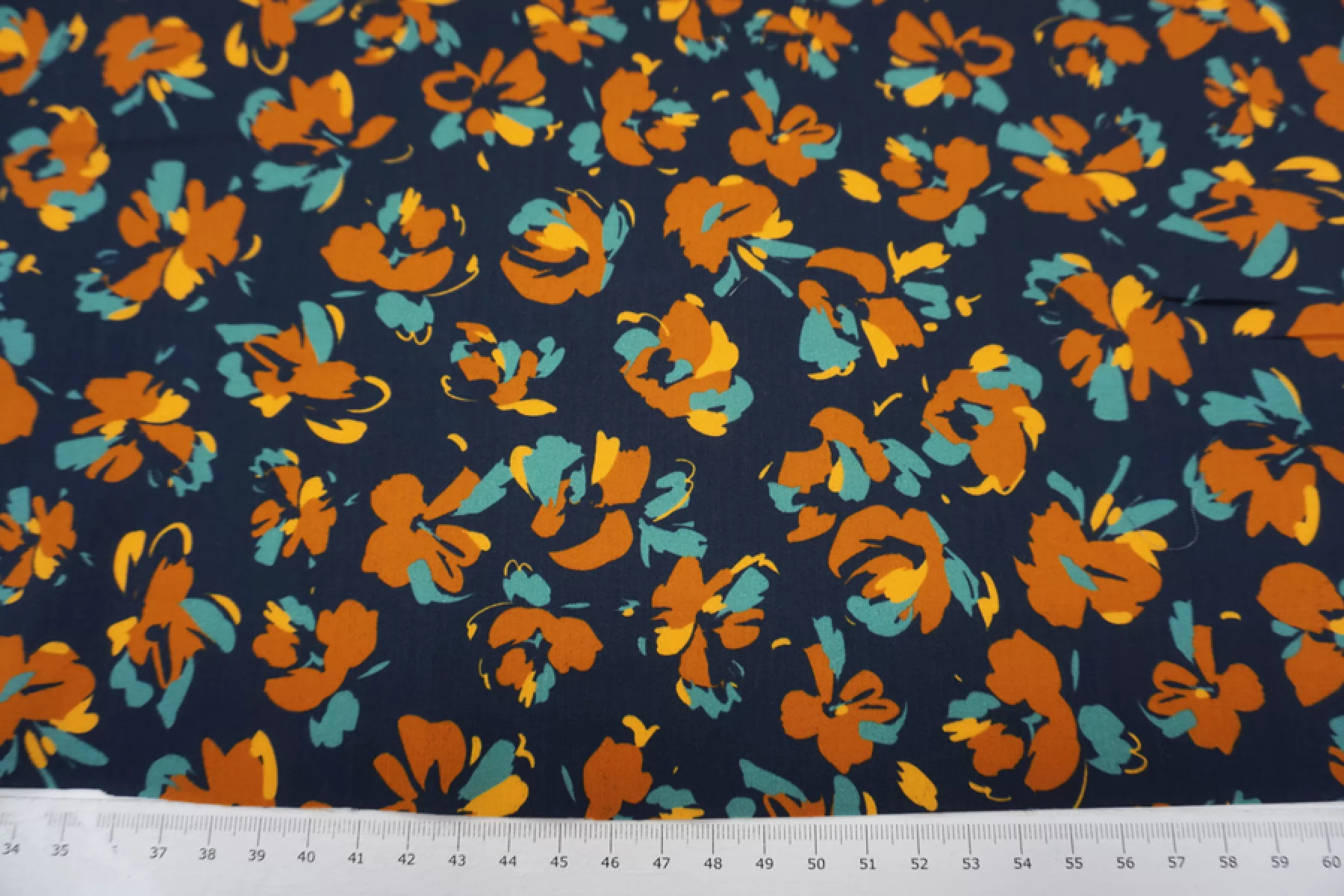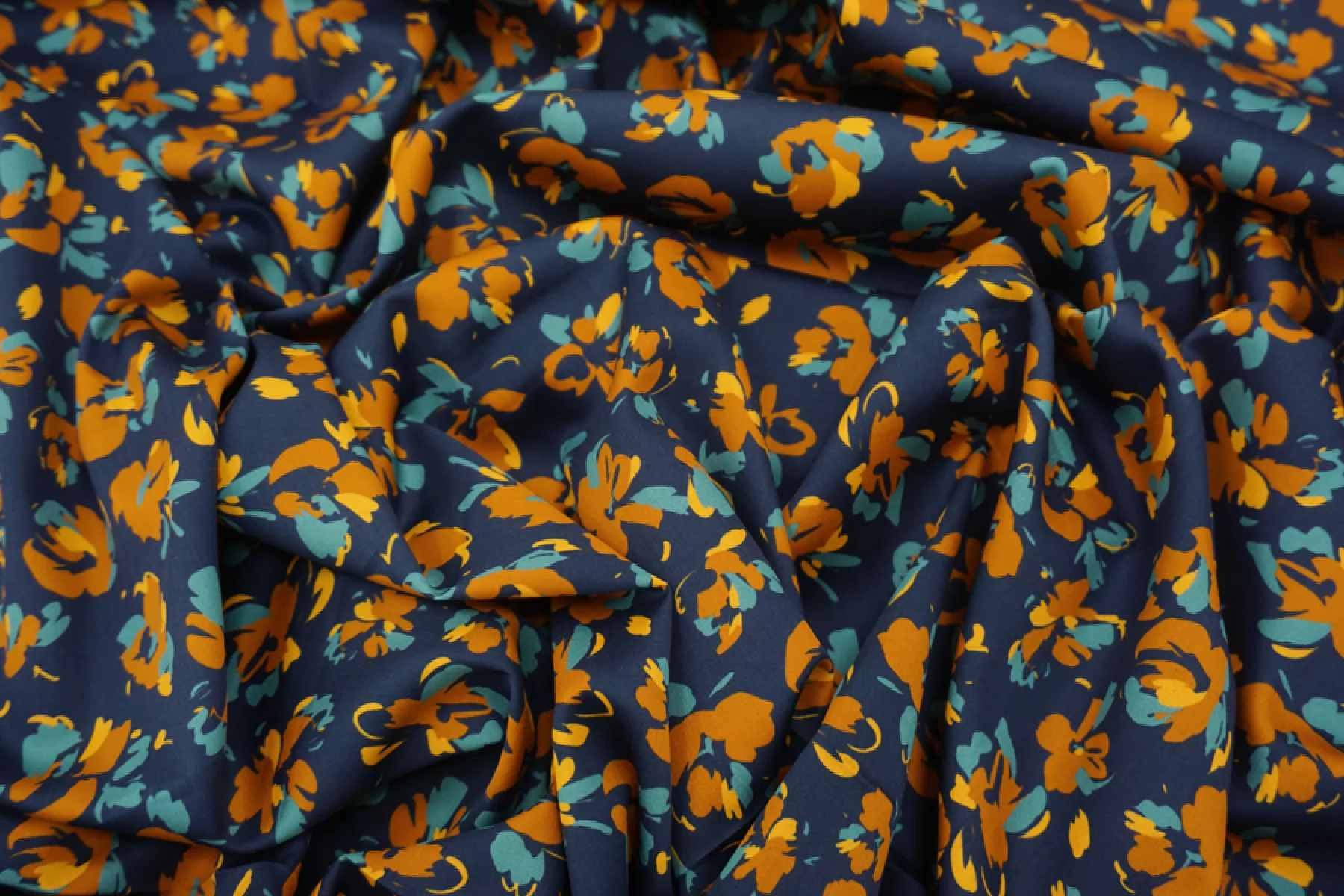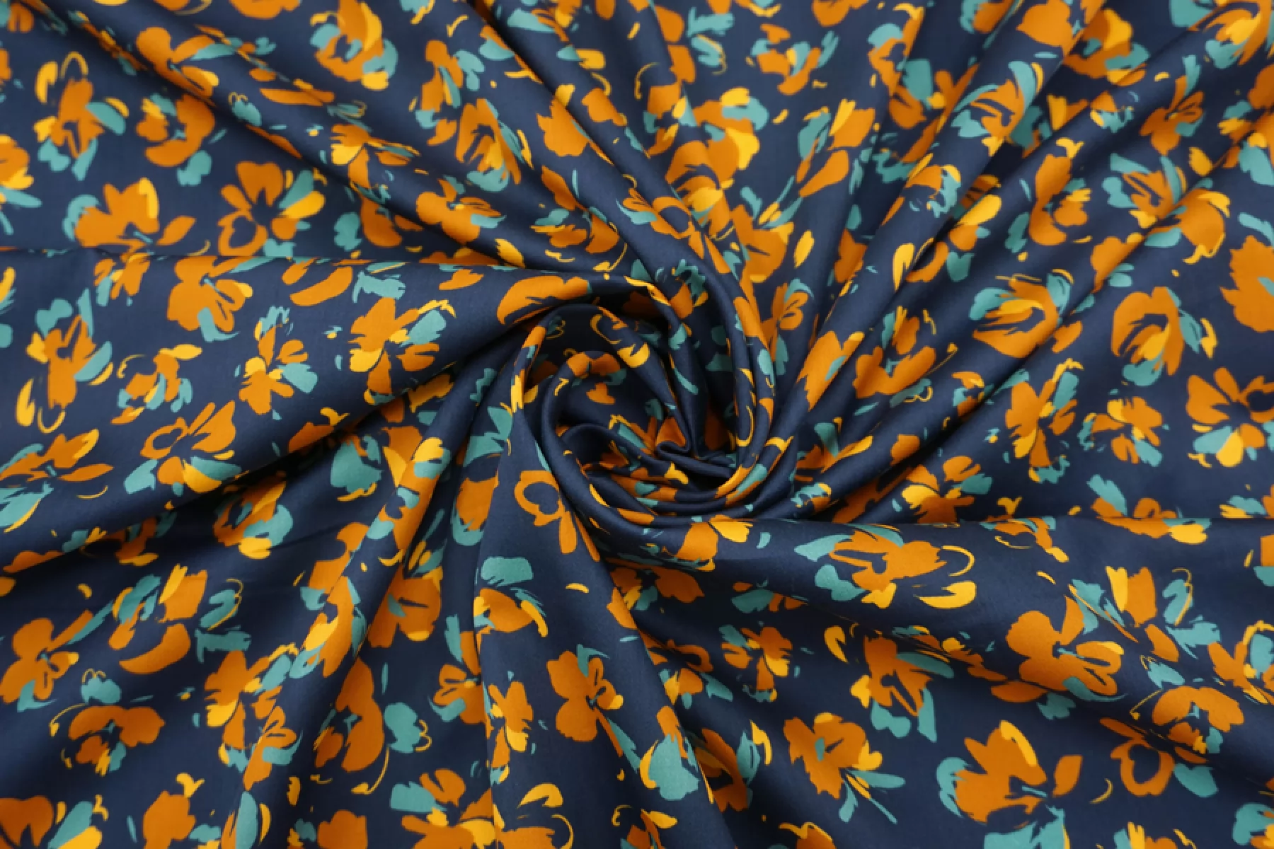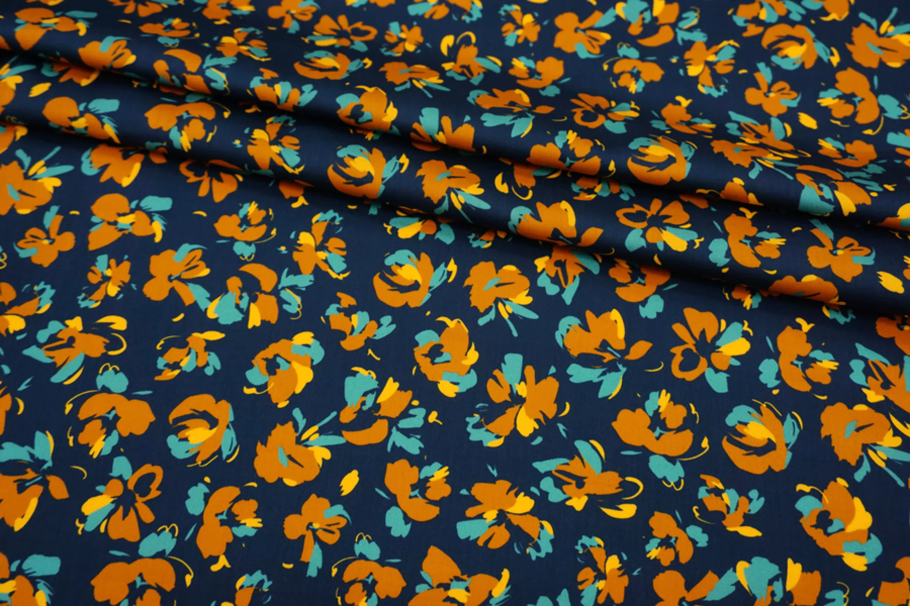 Тонкий сатин с принтом из абстрактных цветов, в стильной цветовой гамме (бирюзовый, желто-оранжевый, желто-коричневый) на темно-синем фоне. Тонкий, пластичный, легкий. Подойдет для пошива платья, рубашки, юбки.