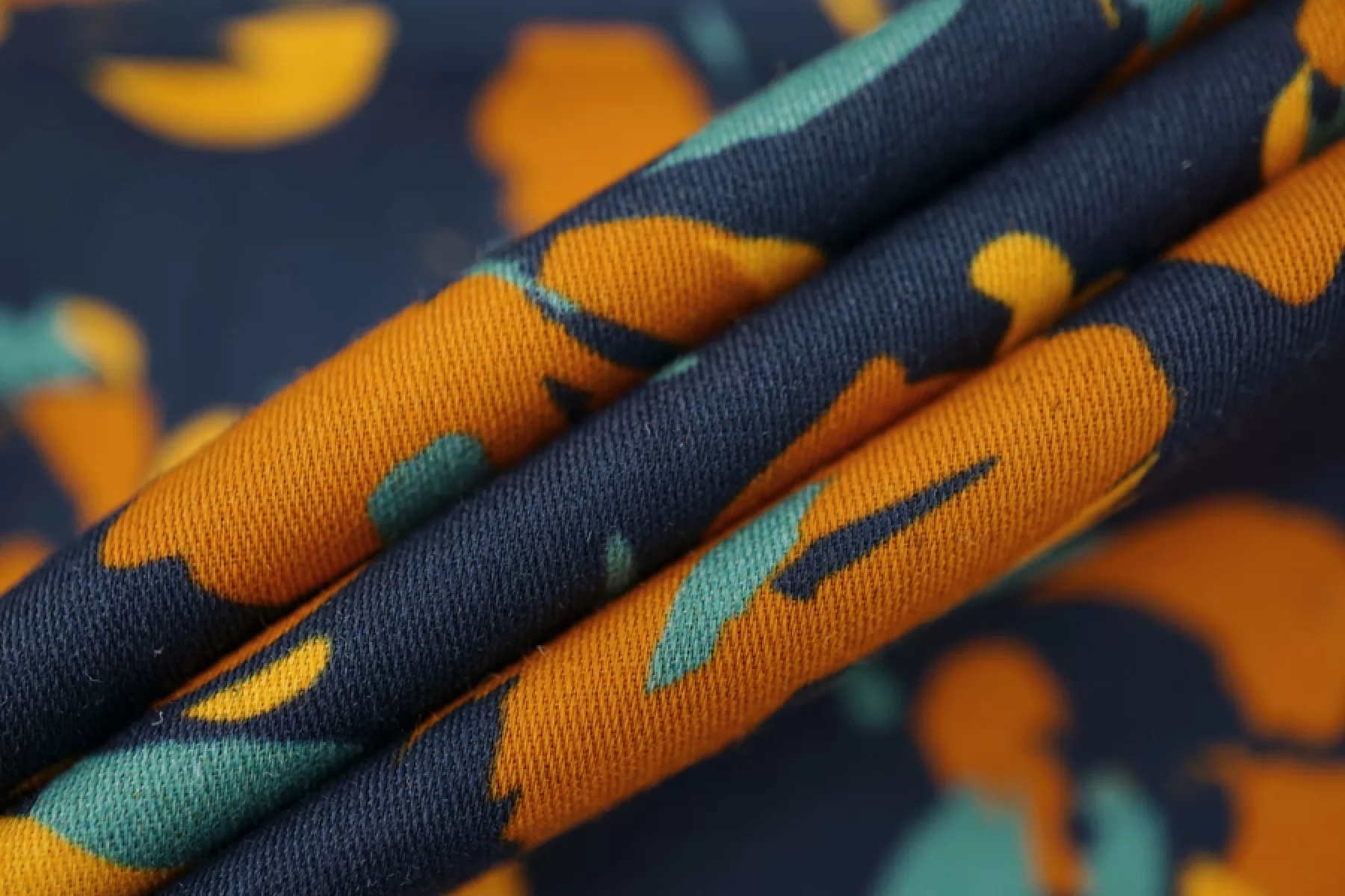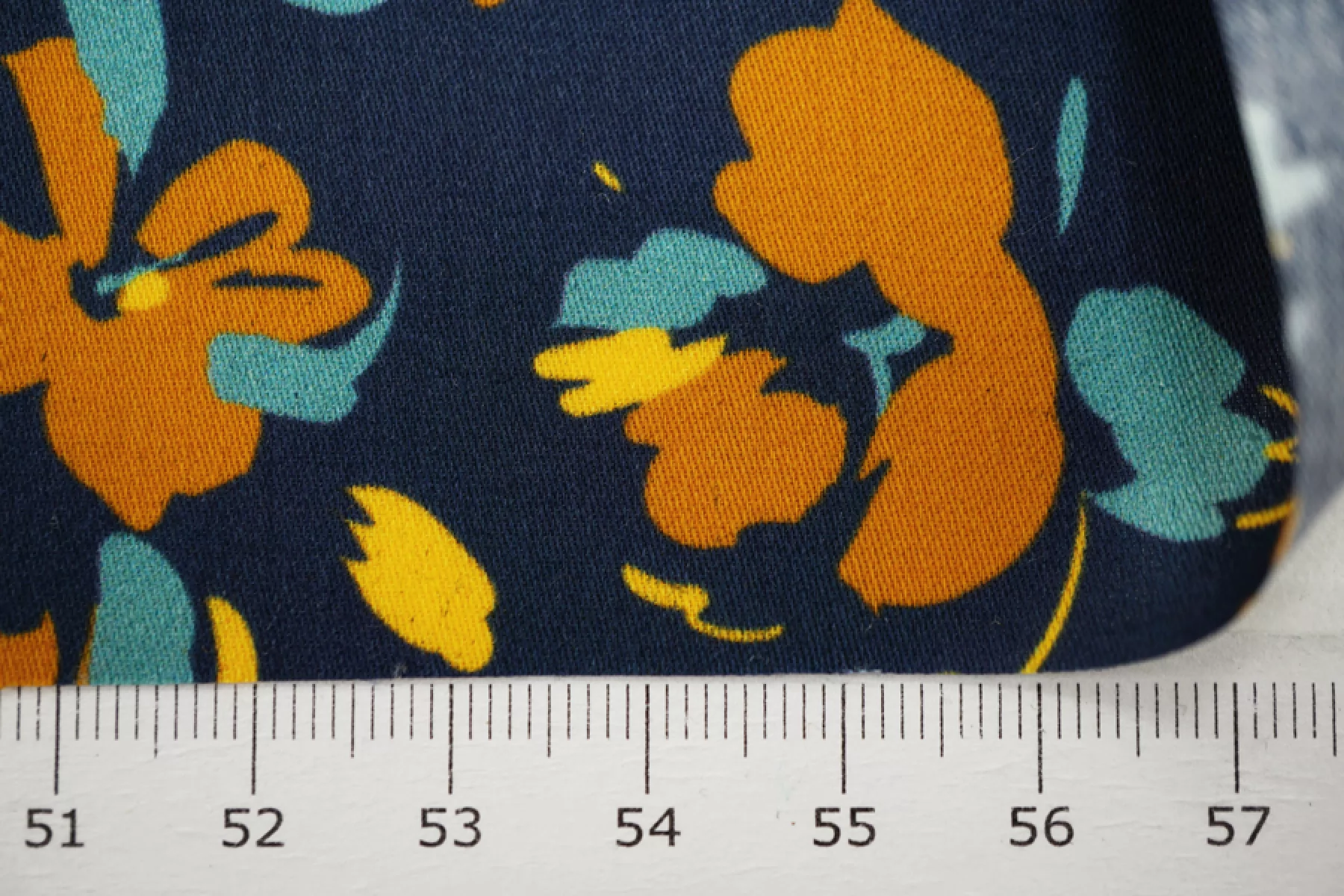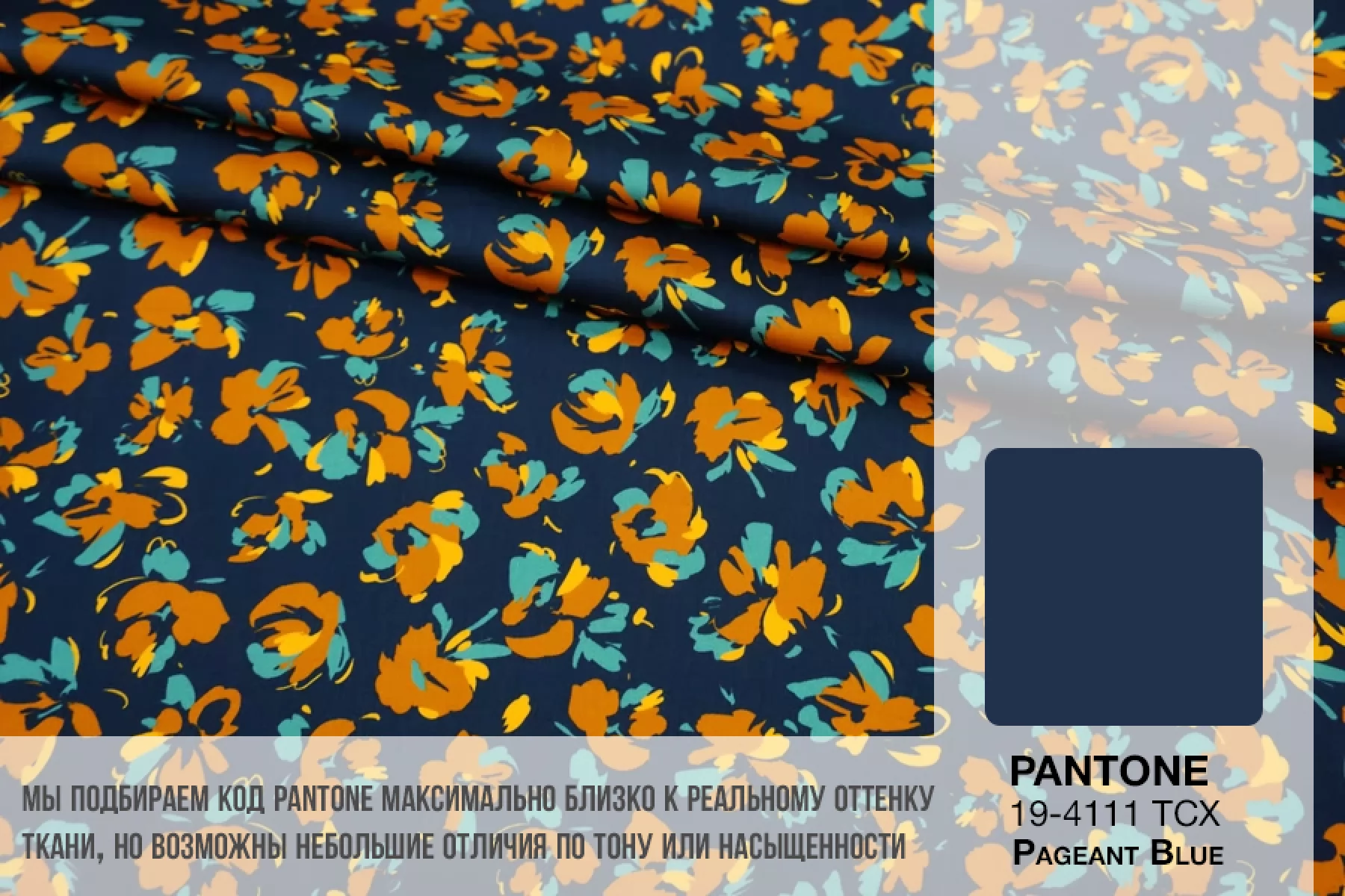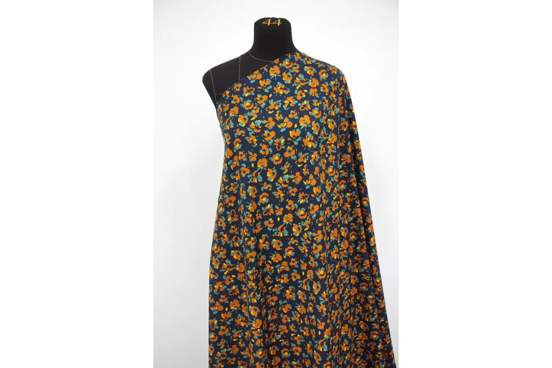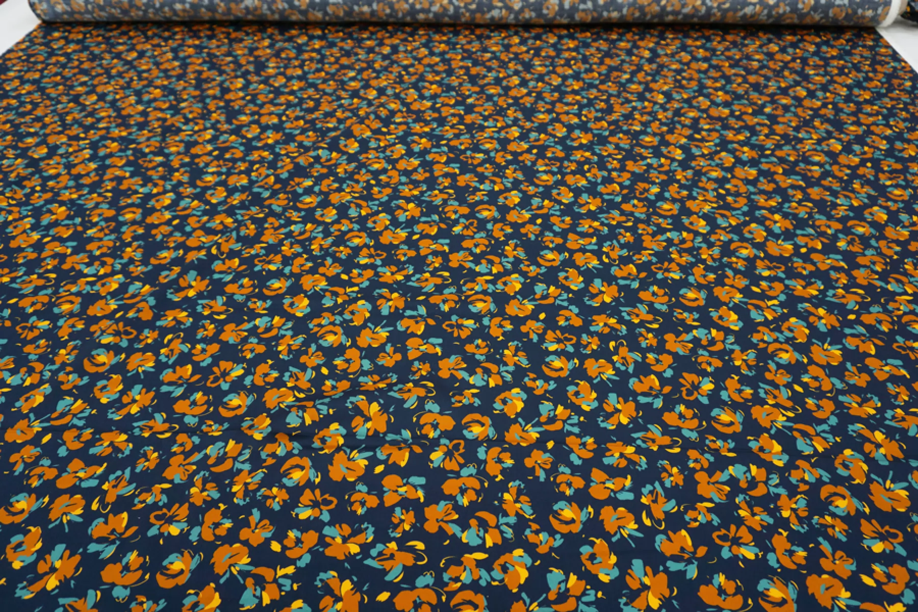 Тонкий сатин с принтом из абстрактных цветов, в стильной цветовой гамме (бирюзовый, желто-оранжевый, желто-коричневый) на темно-синем фоне. Тонкий, пластичный, легкий. Подойдет для пошива платья, рубашки, юбки.