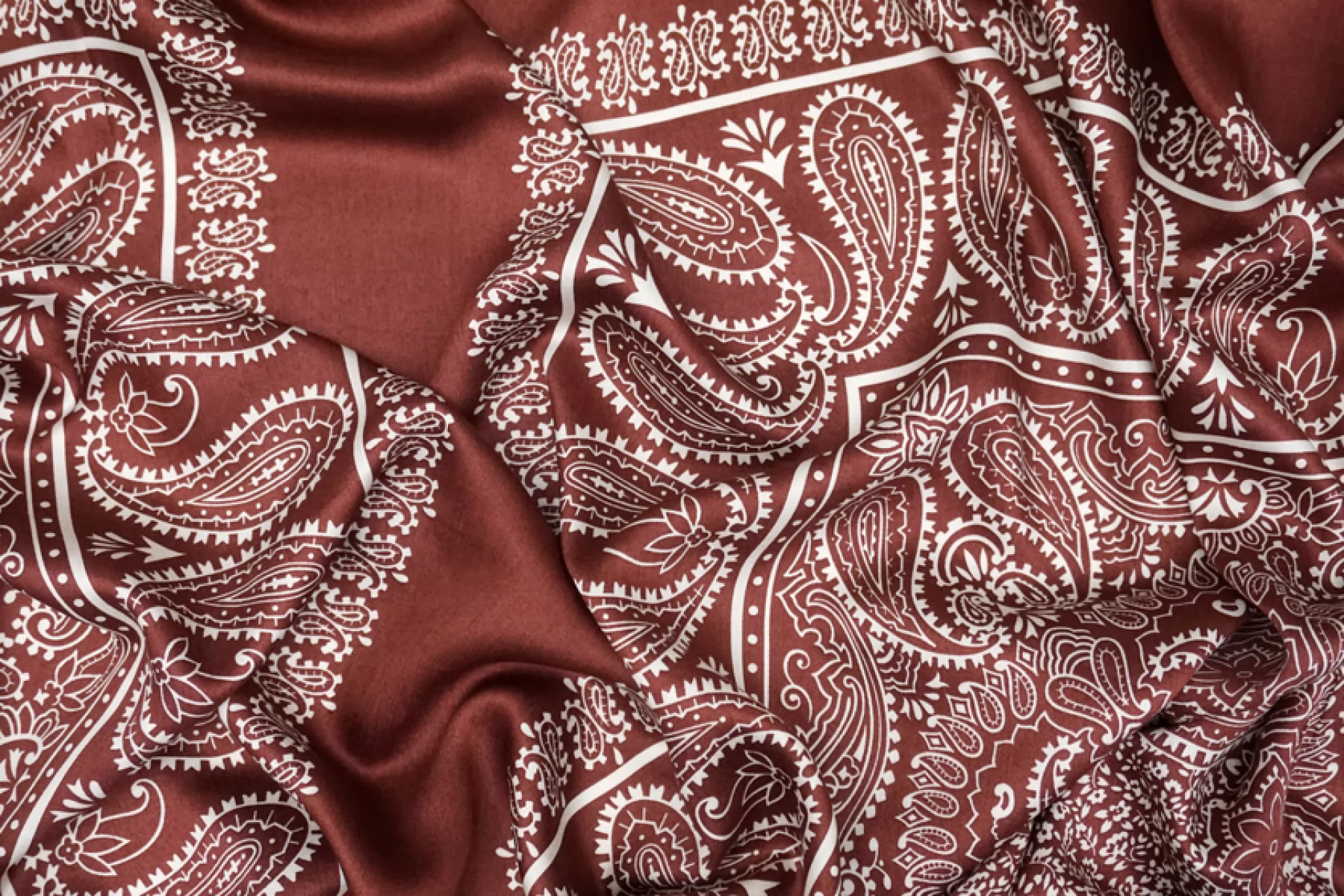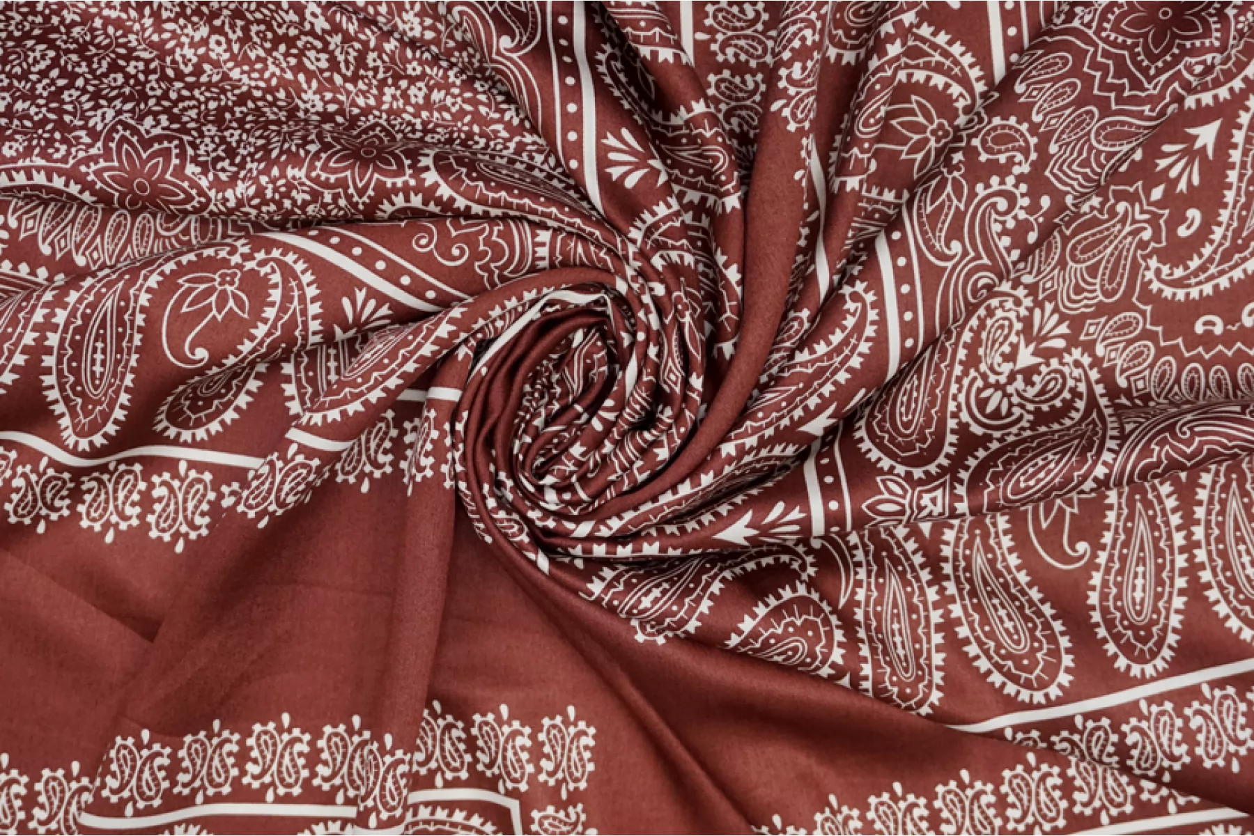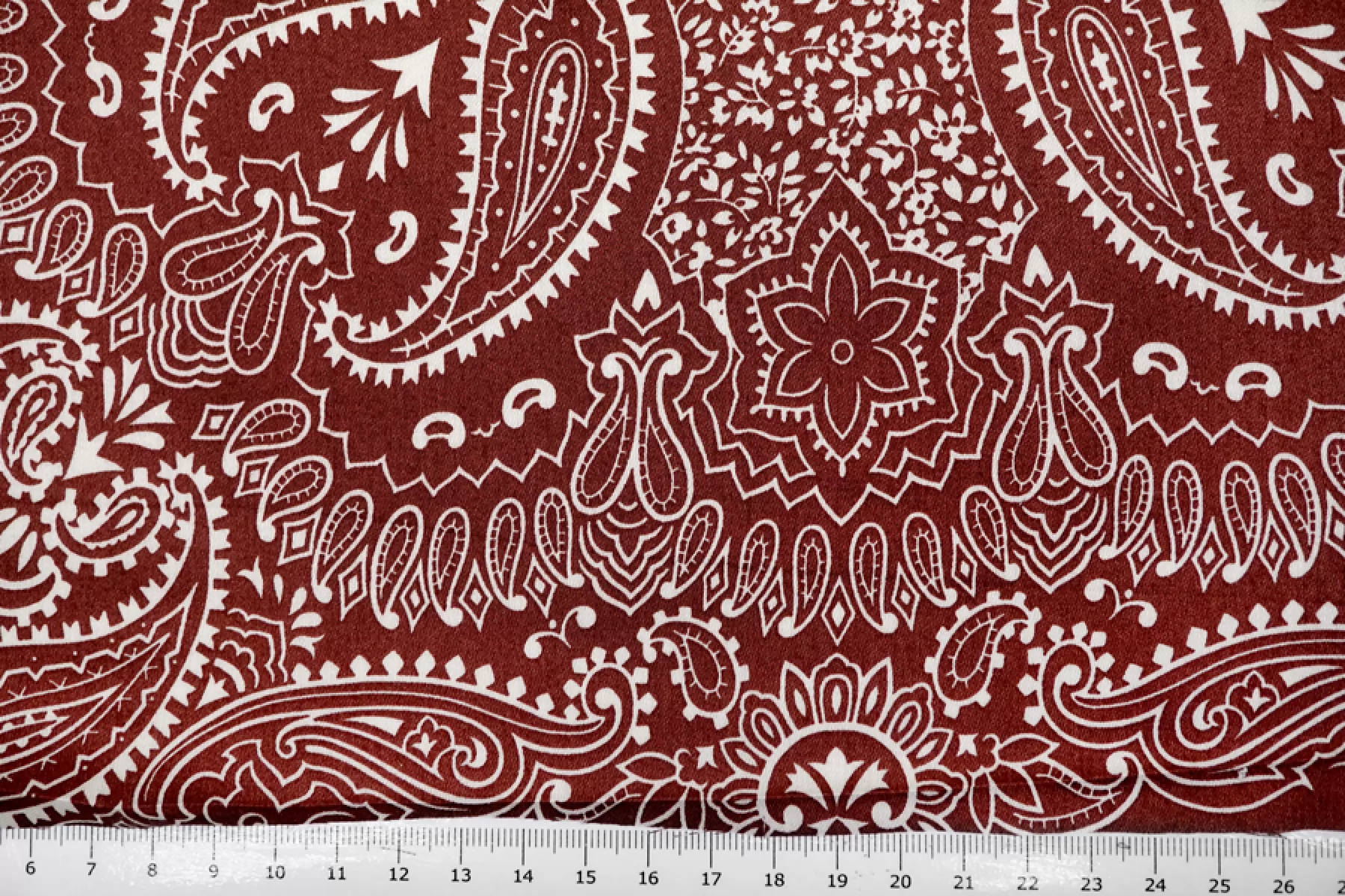 ВНИМАНИЕ! Ткань купонная, длина купона 87 см, цена за купон - 1296 руб. Вискозный сатин оттенка молочного шоколада с бордовым подтоном и с платочным принтом молочного цвета в виде орнамента. Ширина рапорта 70 см. Тактильно материал тонкий, но плотненький, гладкий и мягкий, пластичный. Виден силуэт на просвет. Не тянется. С красивым лоском на лицевой стороне. Подойдет как для создания изделий в платочном стиле - платья, сарафаны, топы, так и для пошива платков. При работе с этой тканью советуем использовать тонкие иглы и нитки. Обязательно учитывайте усадку 5-10%.