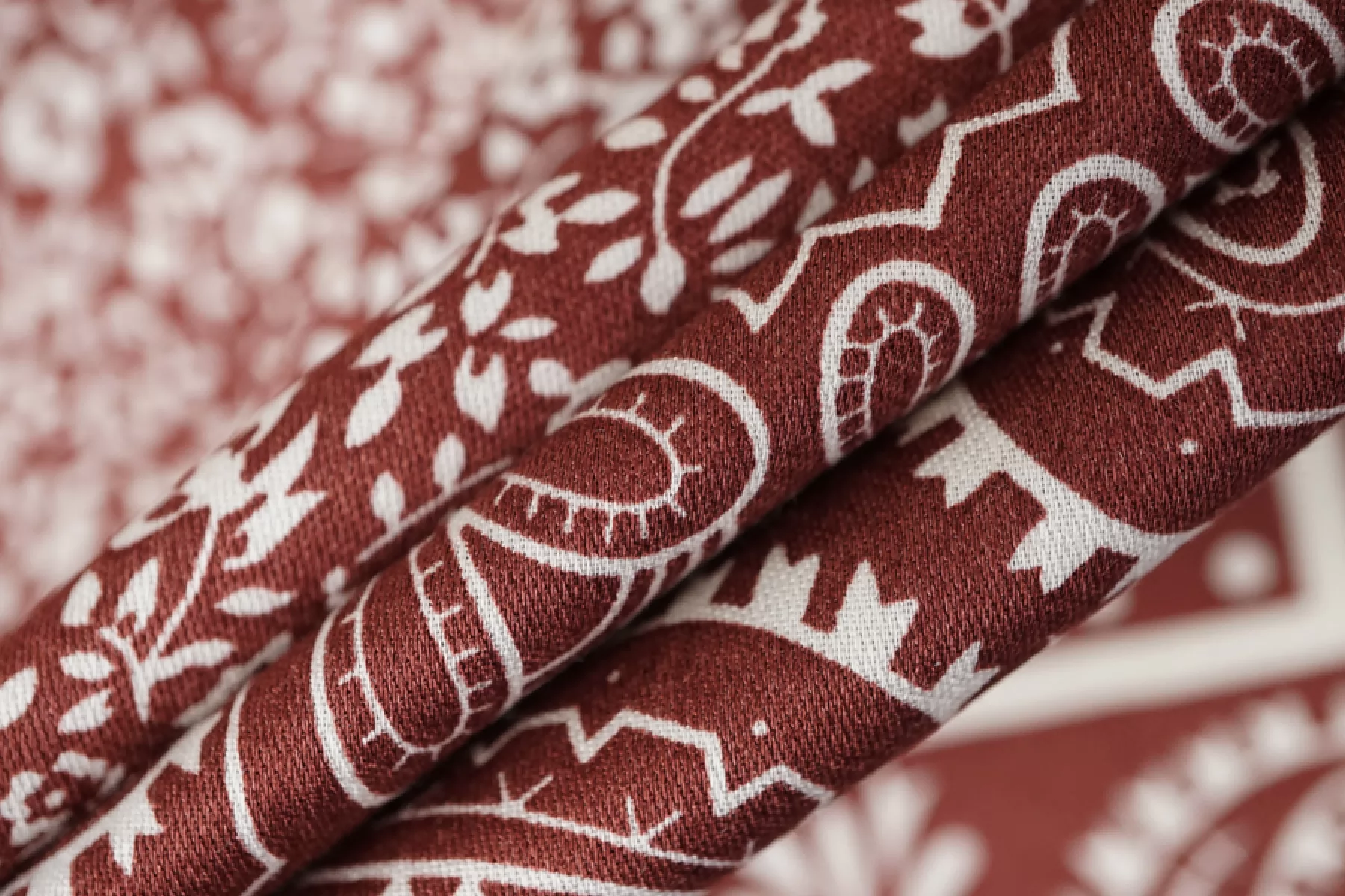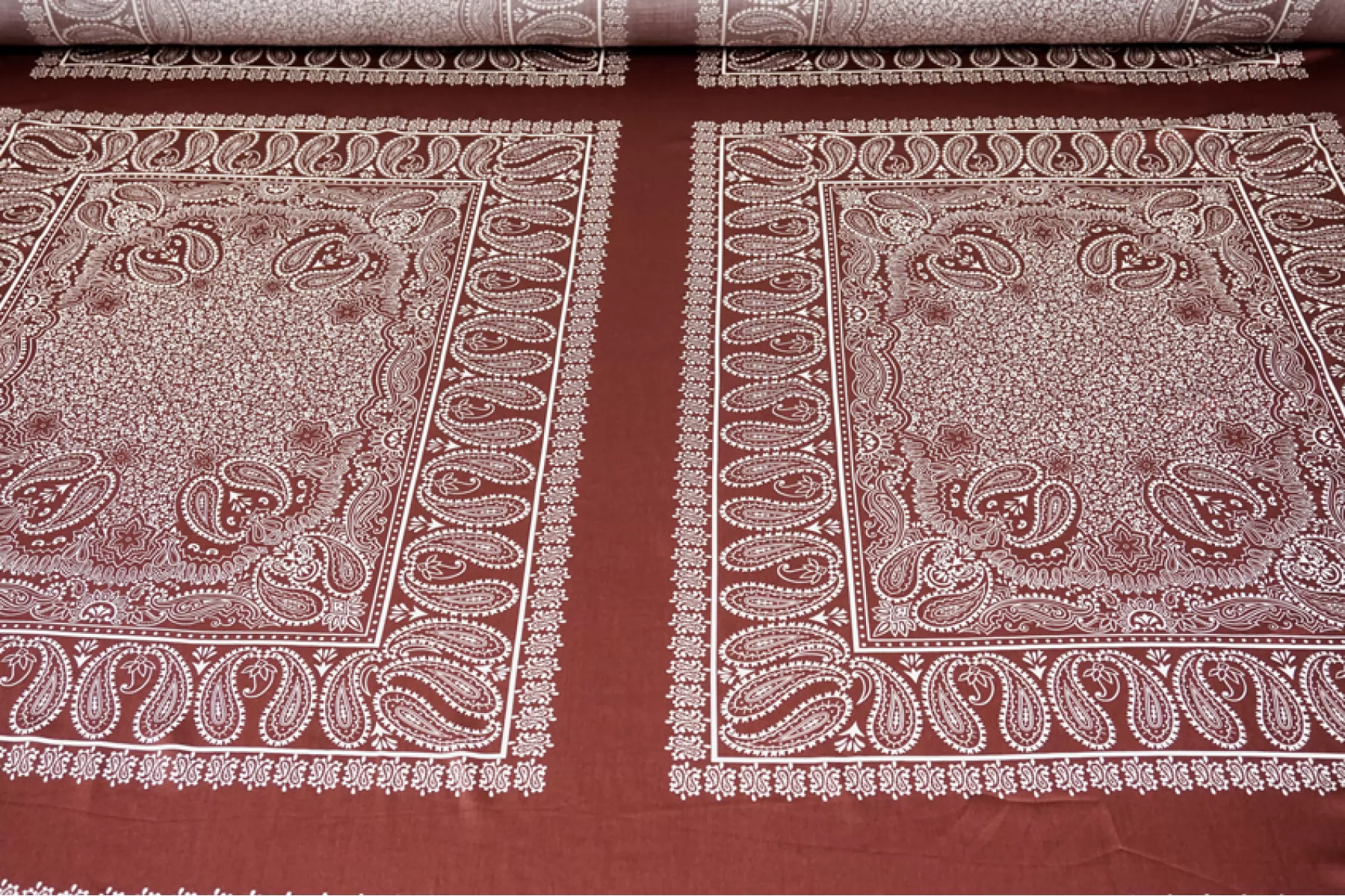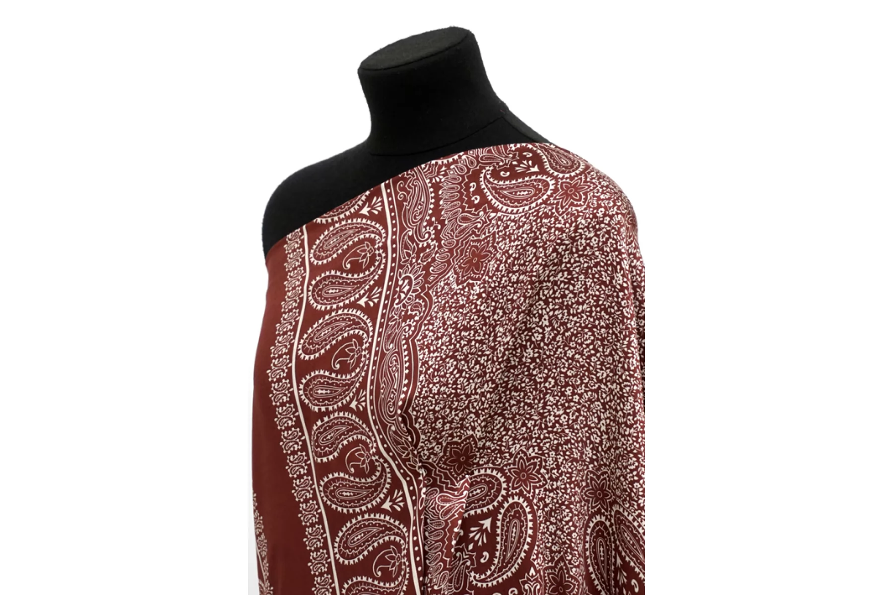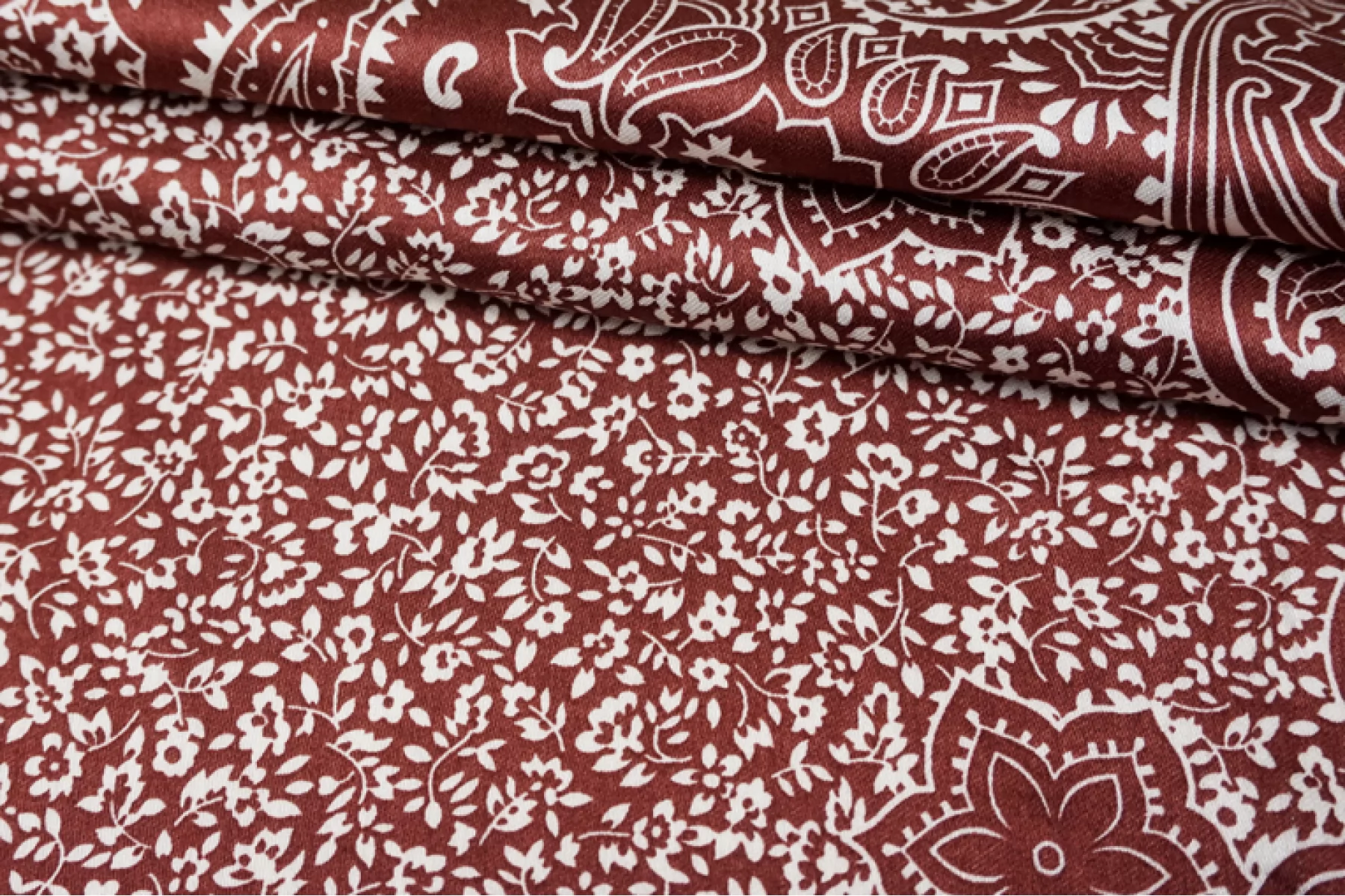 ВНИМАНИЕ! Ткань купонная, длина купона 87 см, цена за купон - 1296 руб. Вискозный сатин оттенка молочного шоколада с бордовым подтоном и с платочным принтом молочного цвета в виде орнамента. Ширина рапорта 70 см. Тактильно материал тонкий, но плотненький, гладкий и мягкий, пластичный. Виден силуэт на просвет. Не тянется. С красивым лоском на лицевой стороне. Подойдет как для создания изделий в платочном стиле - платья, сарафаны, топы, так и для пошива платков. При работе с этой тканью советуем использовать тонкие иглы и нитки. Обязательно учитывайте усадку 5-10%.