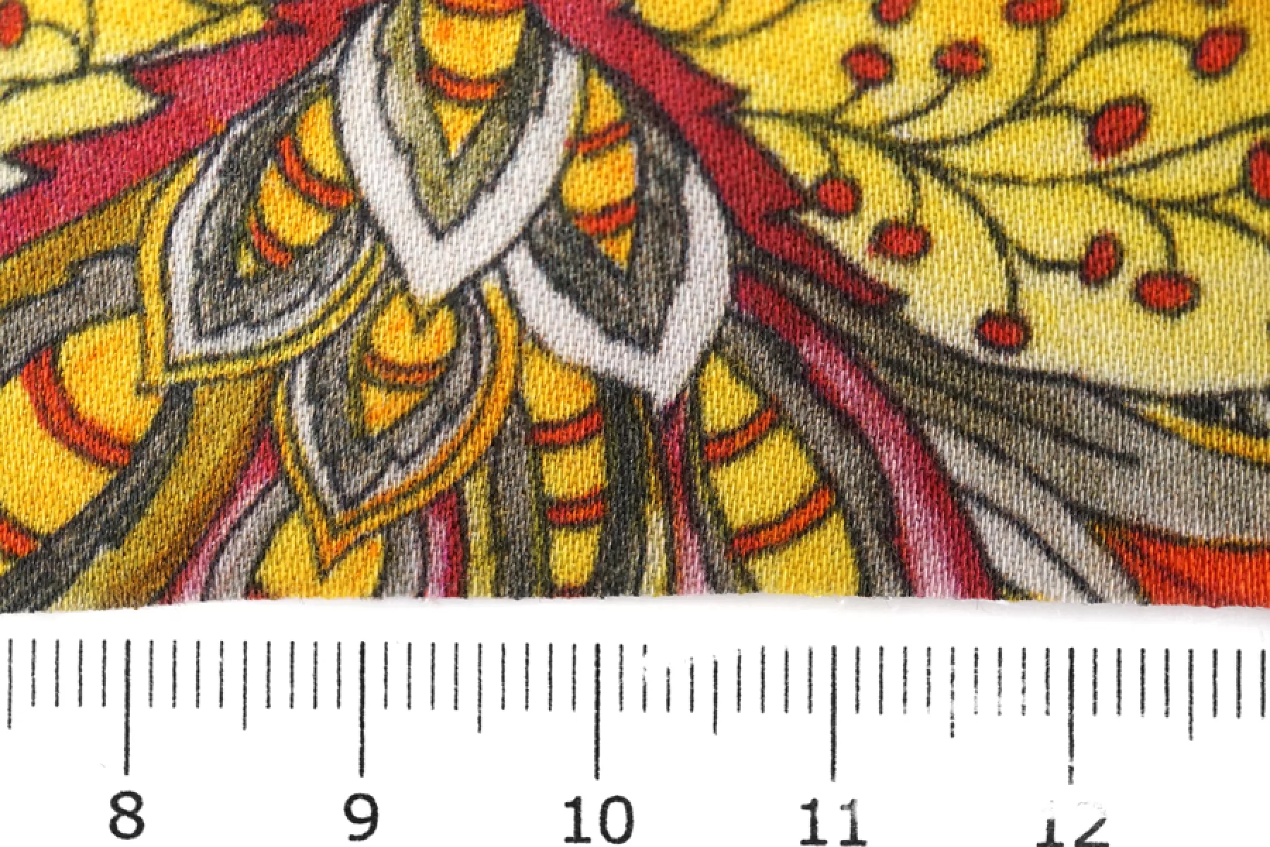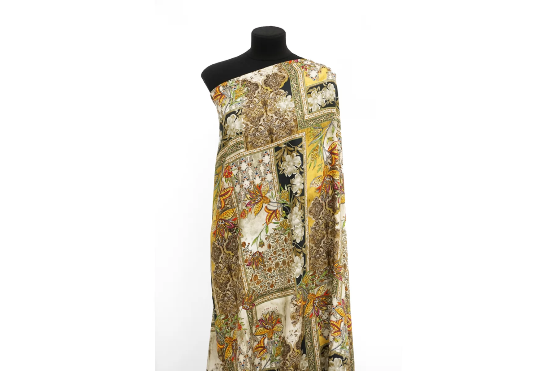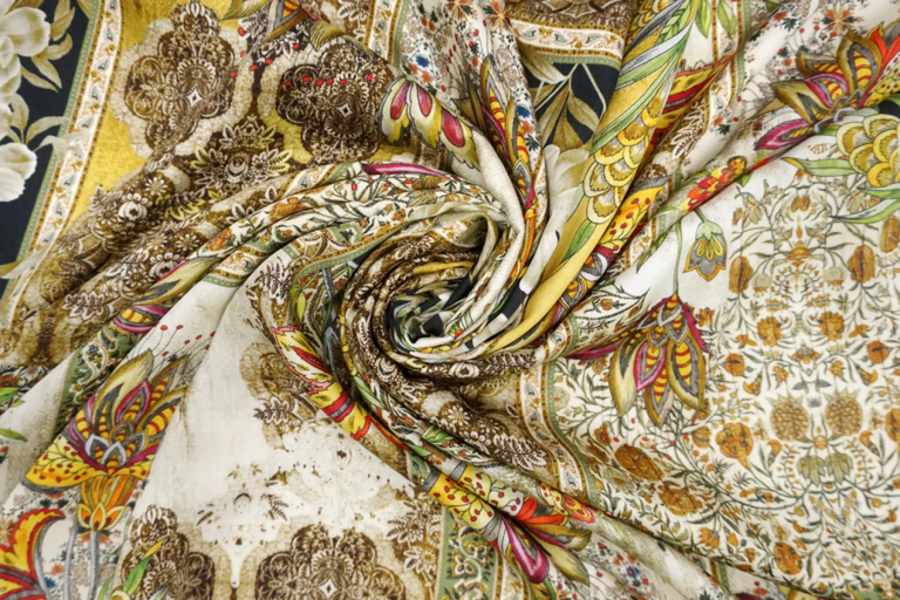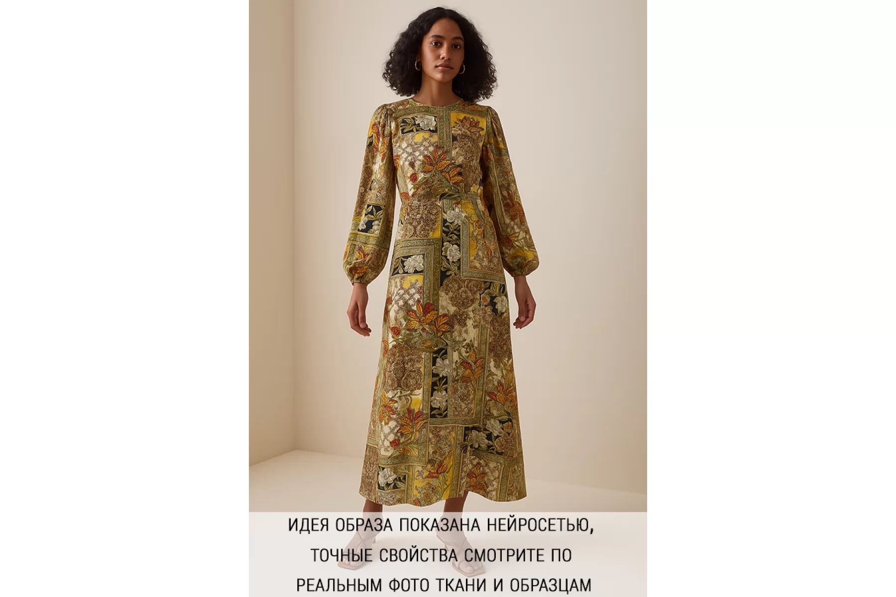 Необычная и прекрасная позиция - блузочная вискоза, сатин с очень оригинальным и достаточно крупным, по типу платочного, принтом в желто-зелено-коричневой цветовой гамме . Тактильно очень приятная, гладкая и очень мягкая. Смотрится очень красиво! Не тянется и не мнется. Легкая и струящаяся. Еле-еле просвечивает силуэт на просвет. Подойдет на платье, халат, кимоно, блузку или юбку. Обязательно учитывайте усадку 5-10%. Шить изделия из данного материала рекомендуем тонкой иглой.