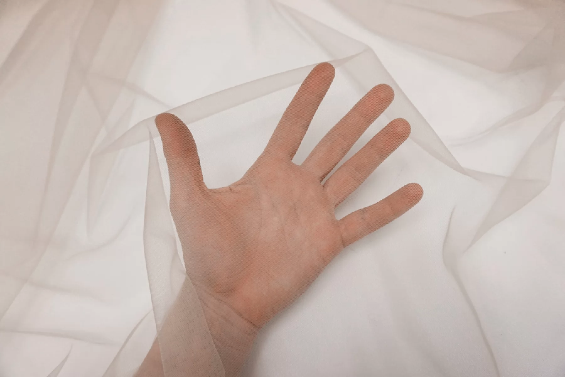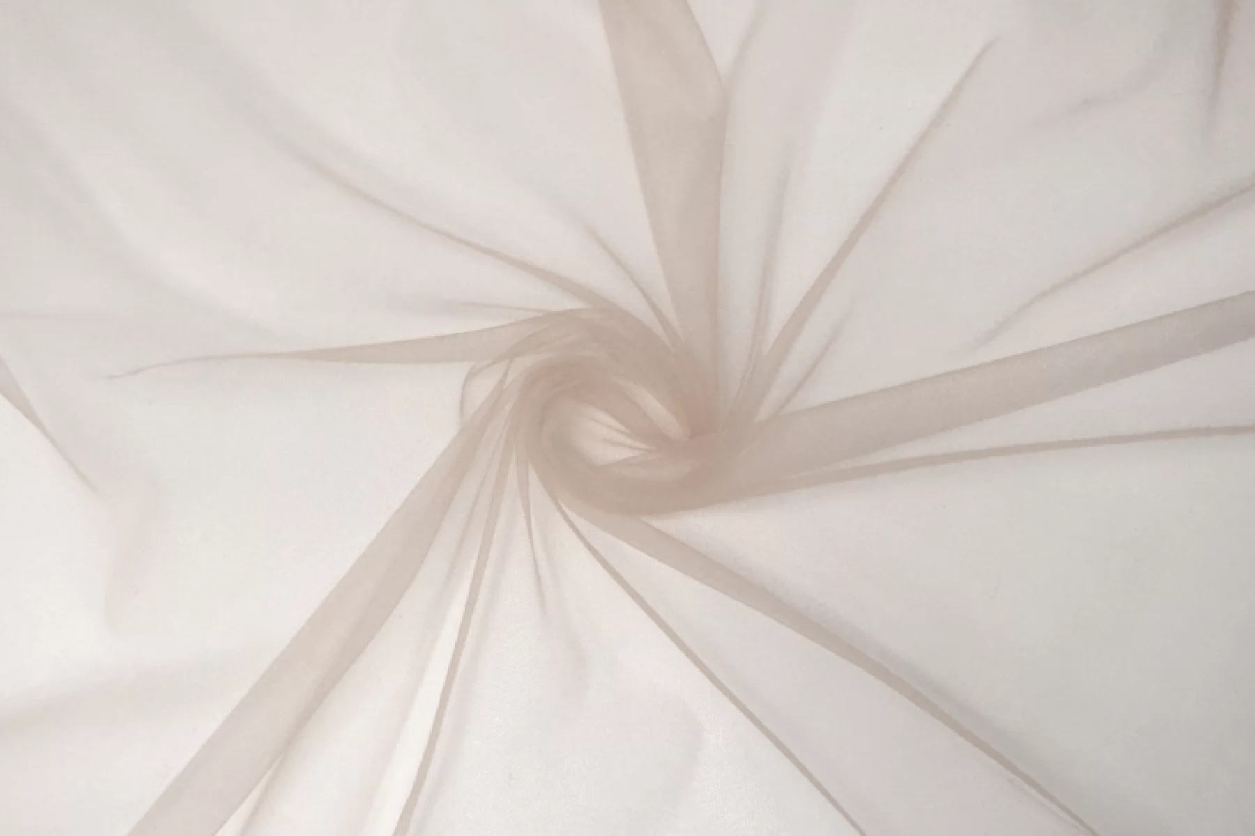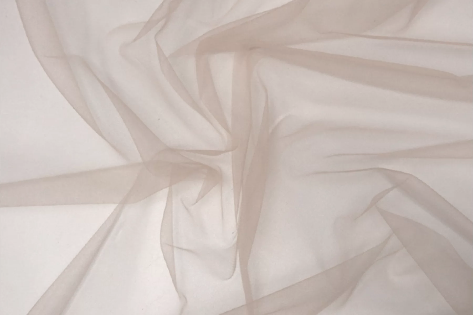 Французская фатиновая сетка в серо-бежевом оттенке. Тонкая, пластичная, хорошо тянется, слегка жестковатая на ощупь. Немного держит форму. Полупрозрачная. Идеально подойдет для пошива нарядной одежды, а также для декора белья или отдельных элементов изделий. Отличная ширина!