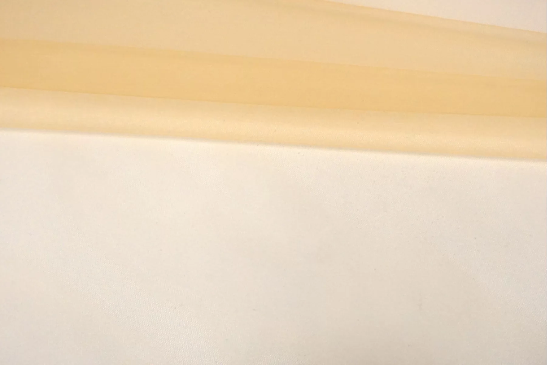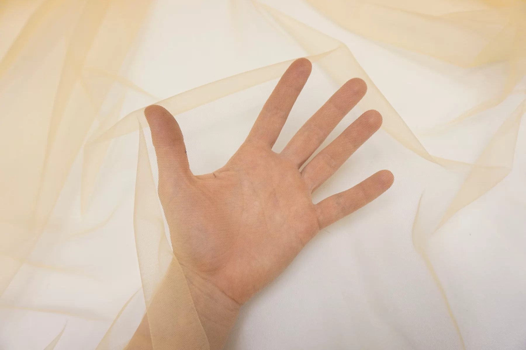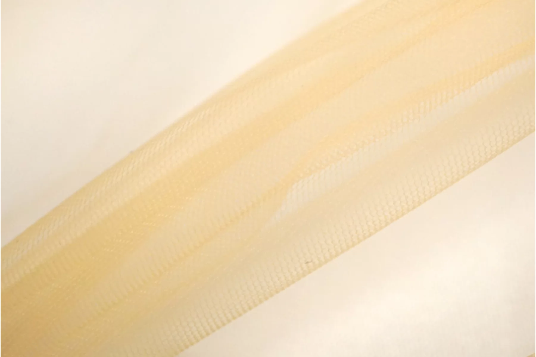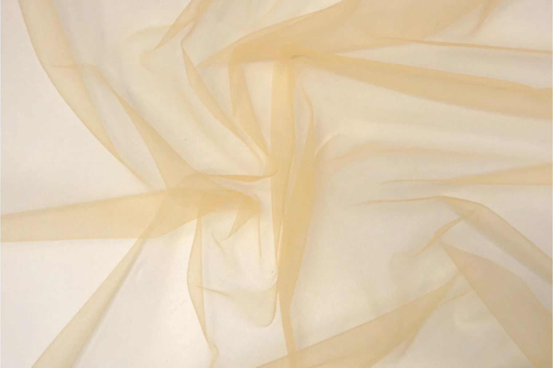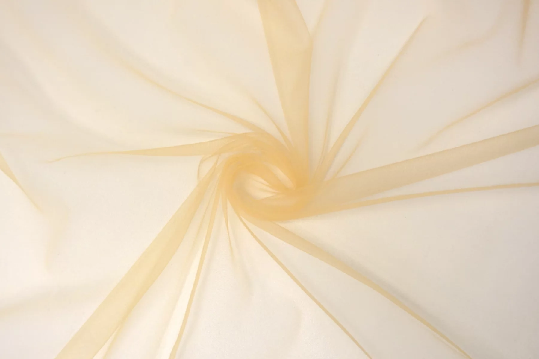 Французская фатиновая сетка в оттенке светлое золото. Тонкая, пластичная, хорошо тянется, слегка жестковатая на ощупь. Немного держит форму. Полупрозрачная. Идеально подойдет для пошива нарядной одежды, а также для декора белья или отдельных элементов изделий. Отличная ширина!