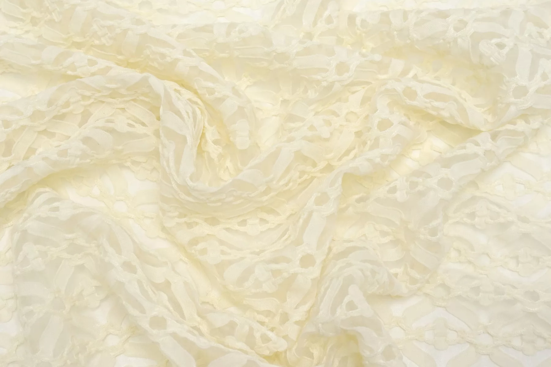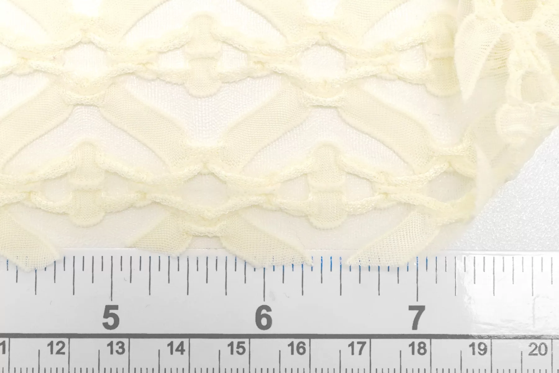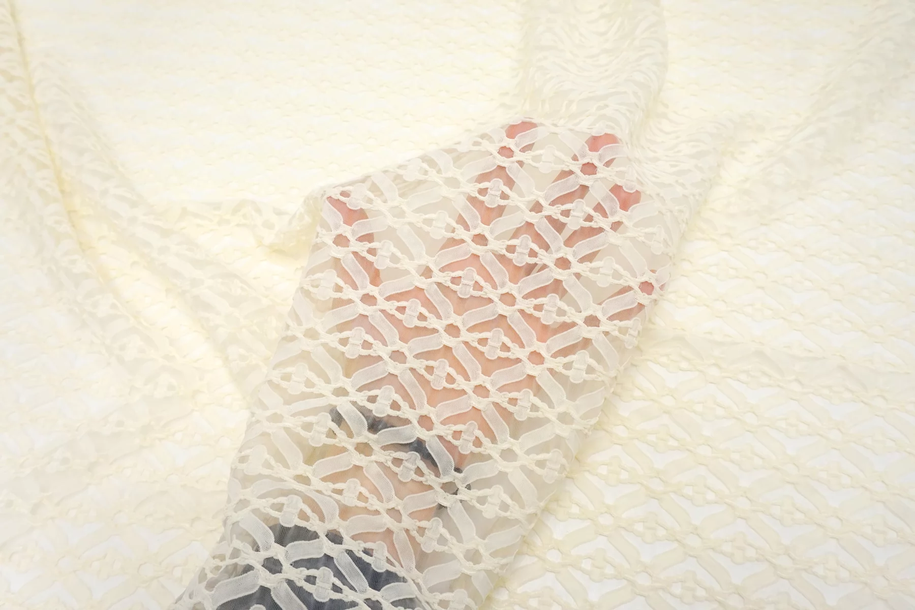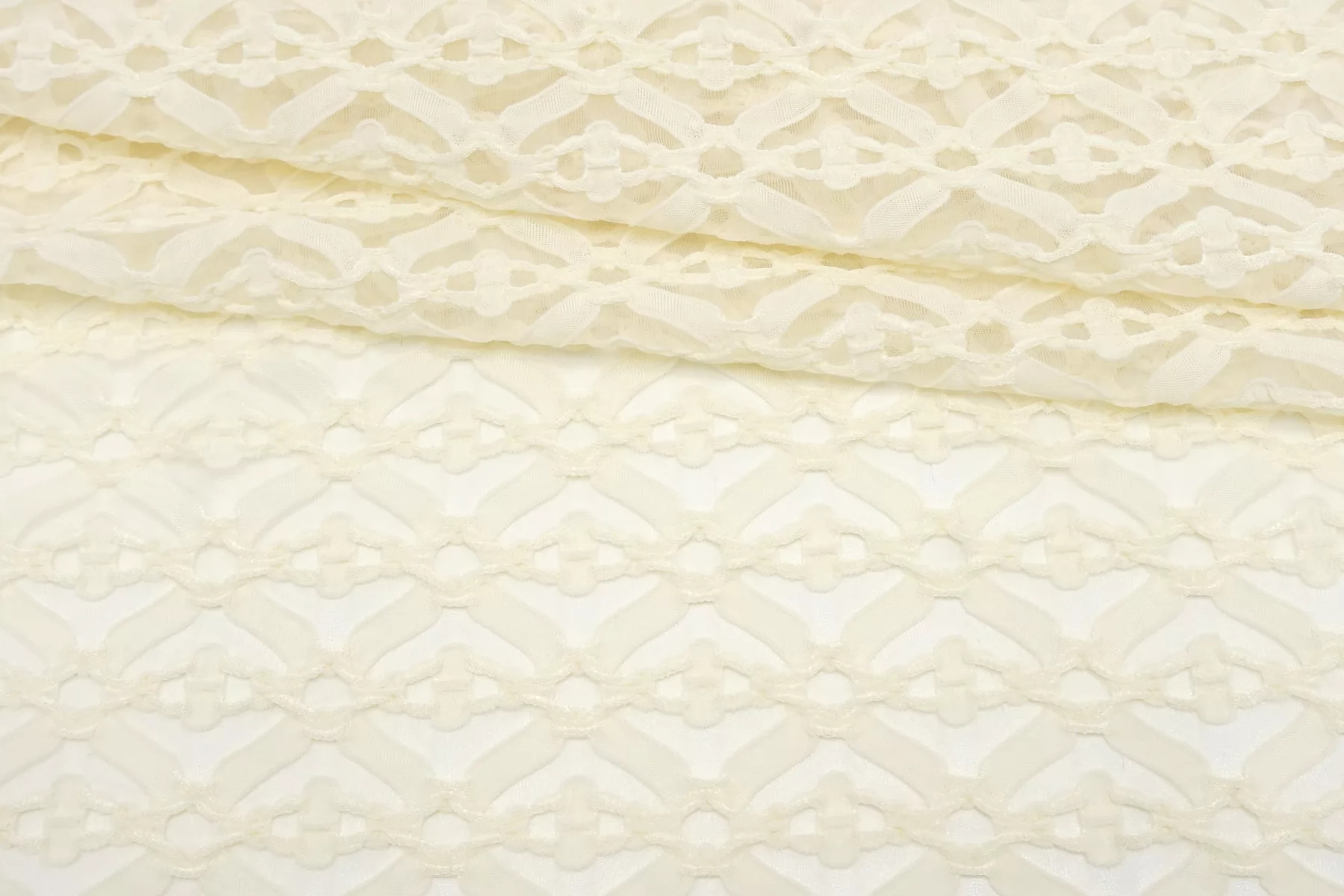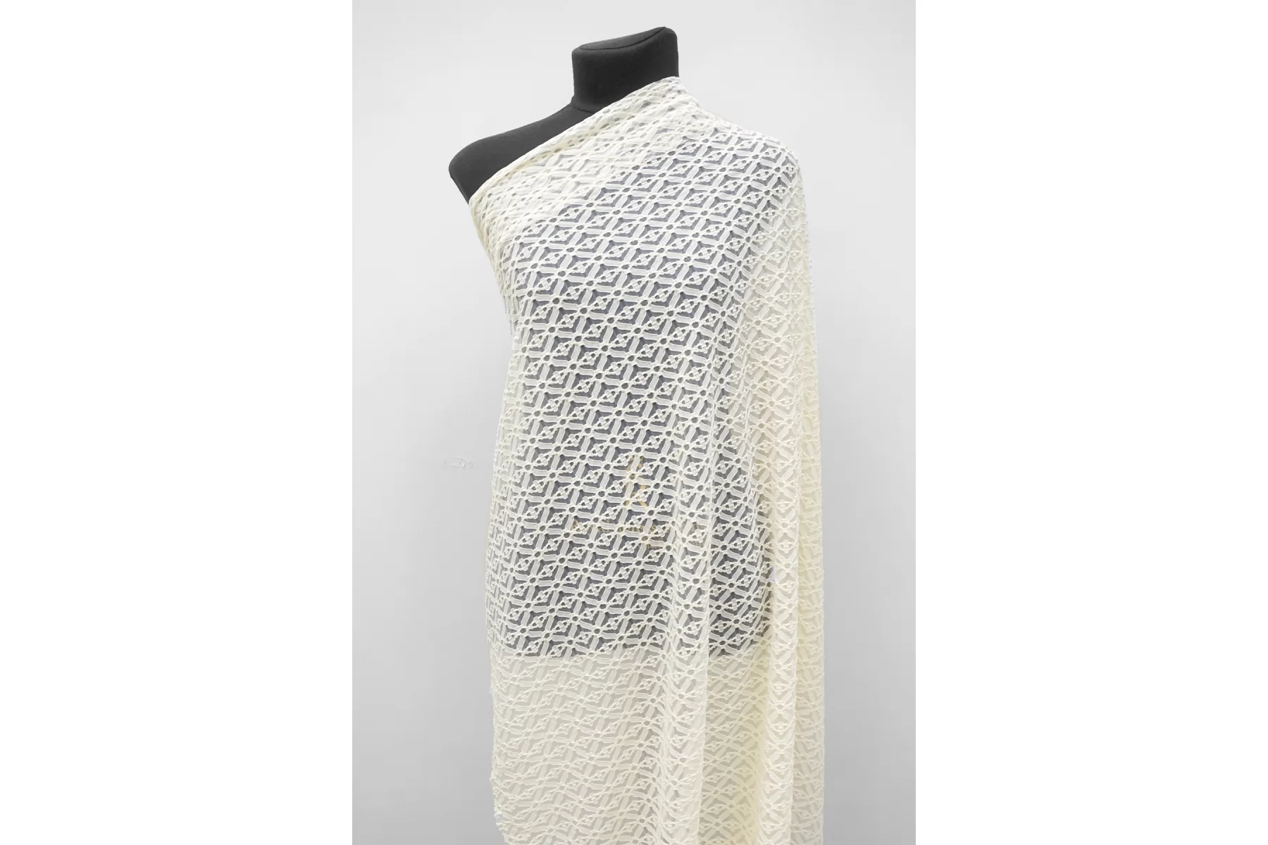 Сетка от бренда Max Mara, молочно-белого цвета, сетка сплетена с участками из тонкого трикотажа, которые образовывают фактурный узор. Сетка пластичная, некрупная. Тактильно мягкая, без грубости. Эластичная. Отличный вариант как на самостоятельные изделия, так и для отделки отдельных элементов одежды. Будет интересно смотреться в виде лонгсливов, футболок.