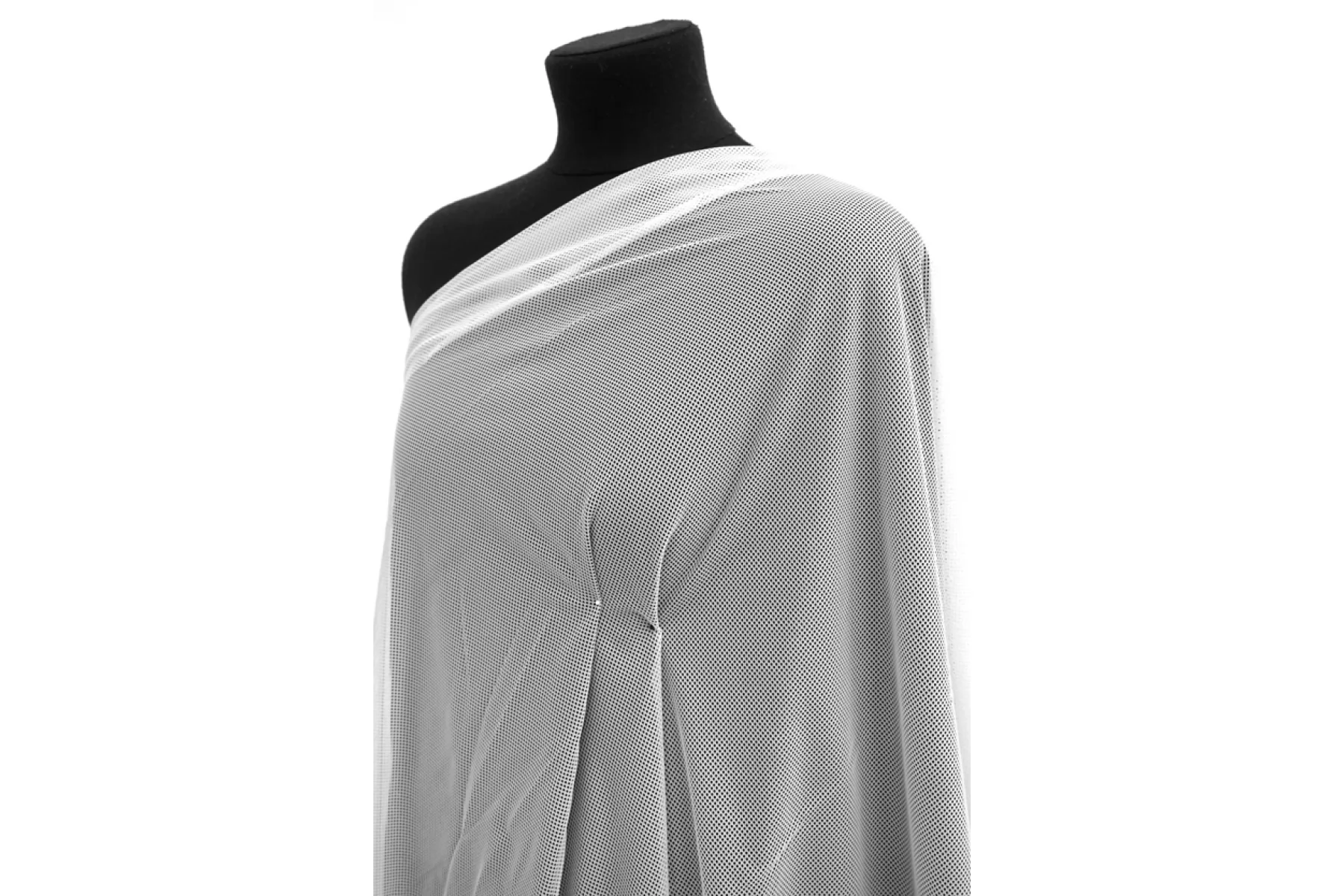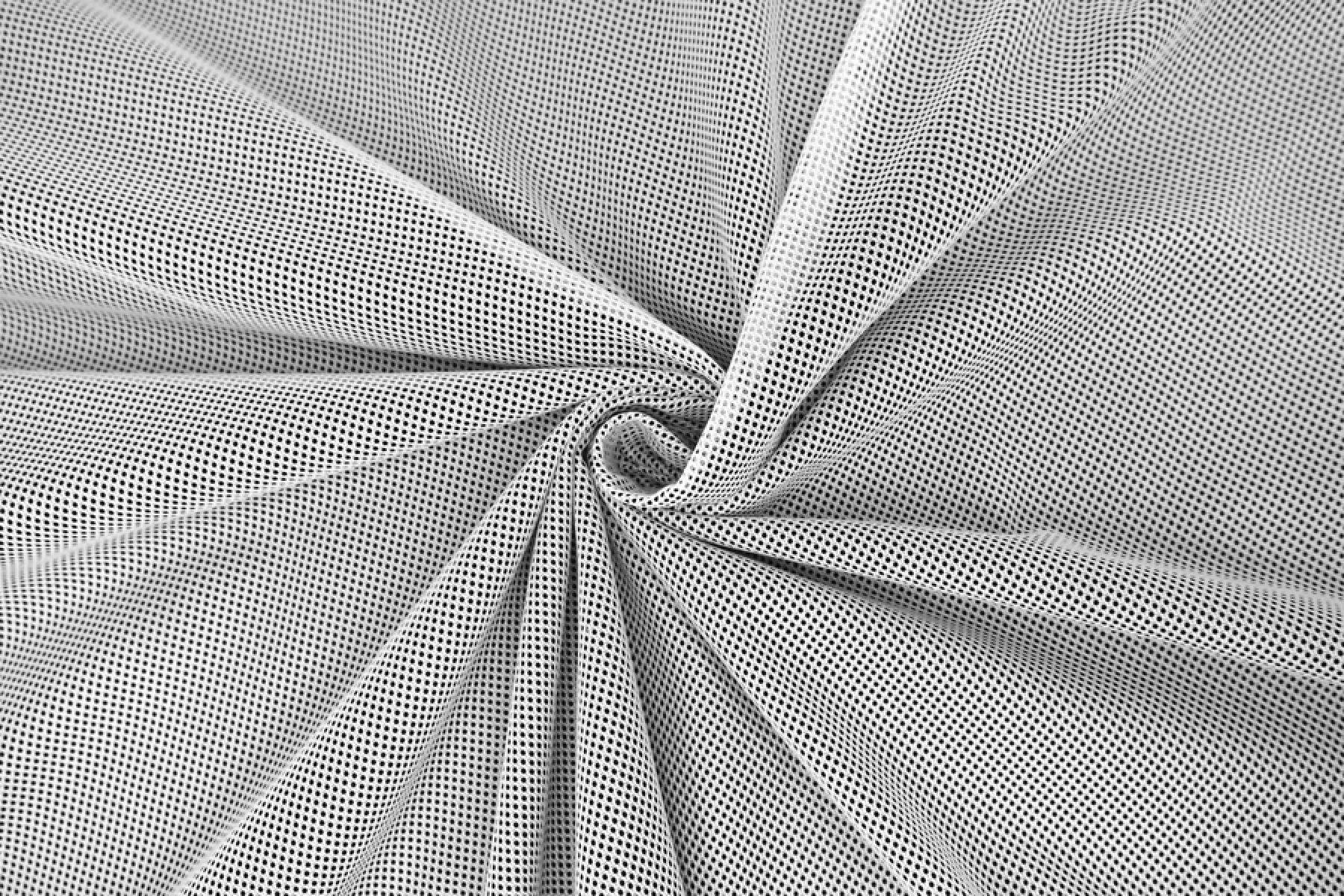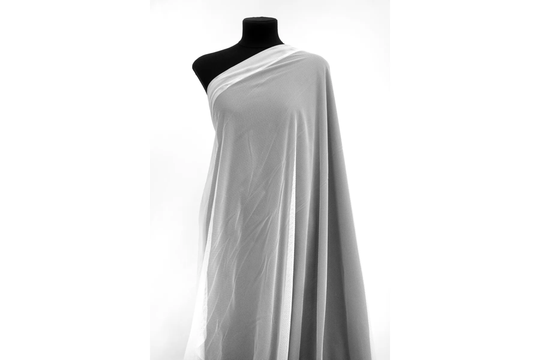 Сетка тонкая белого цвета, достаточно мелкая. Сетка тянется за счет плетения, но не сильно. Тактильно приятная, слегка жестковатая. Красиво смотрится в складке. Отличный вариант как на самостоятельные изделия, так и для отделки отдельных элементов одежды. Будет интересно смотреться в варианте спортивных маек, футболок и не только.