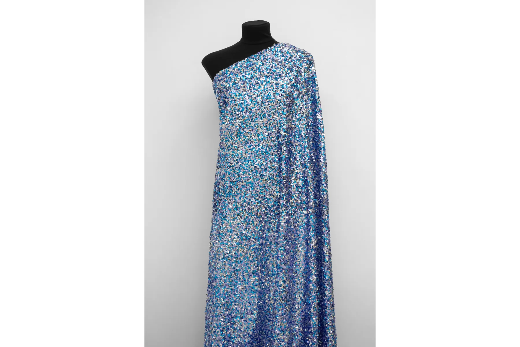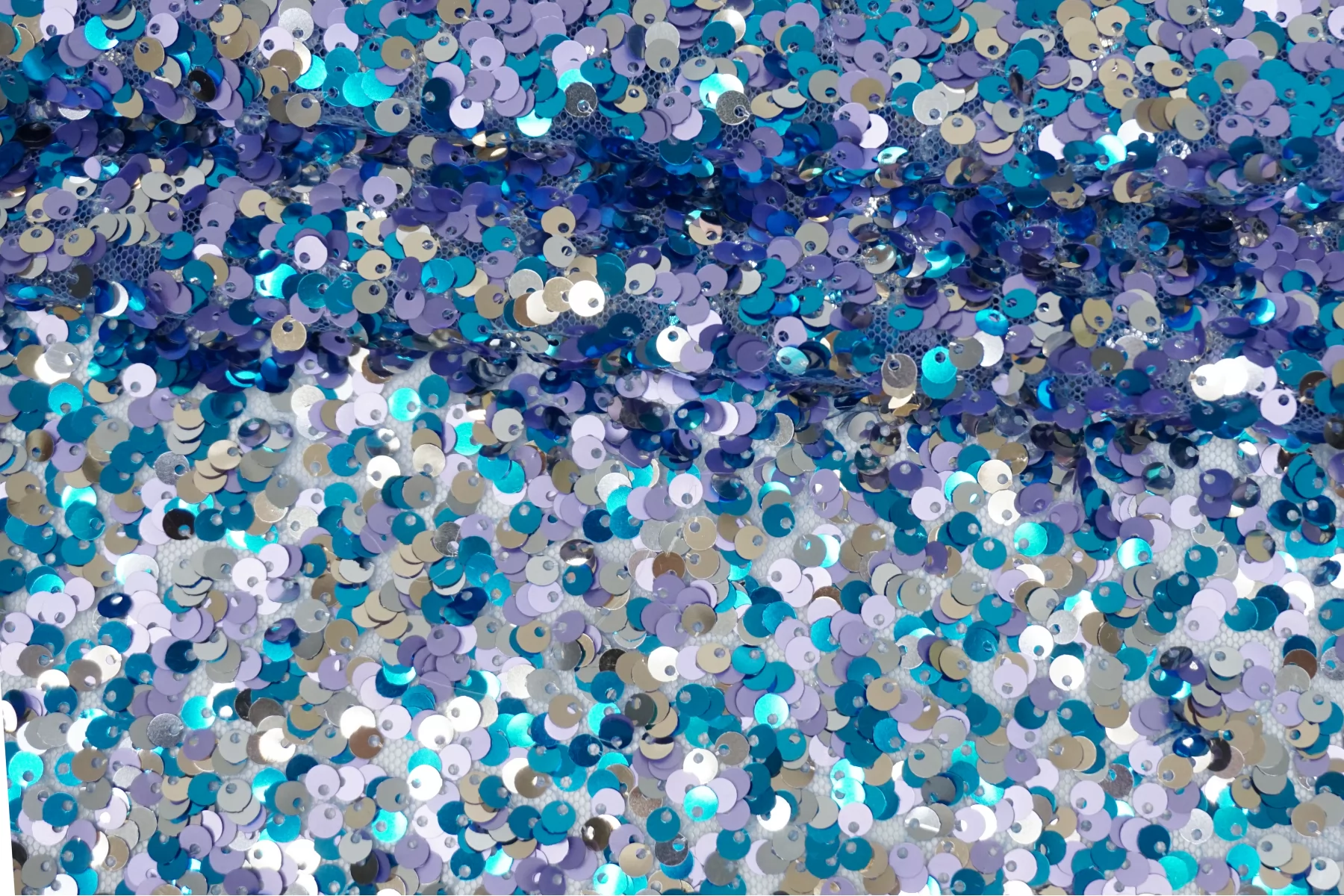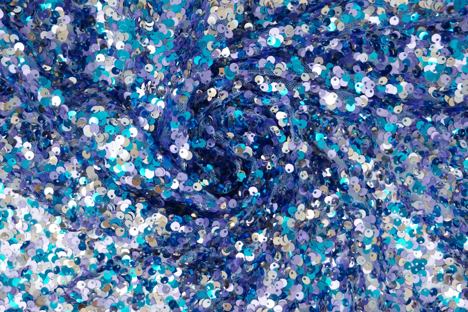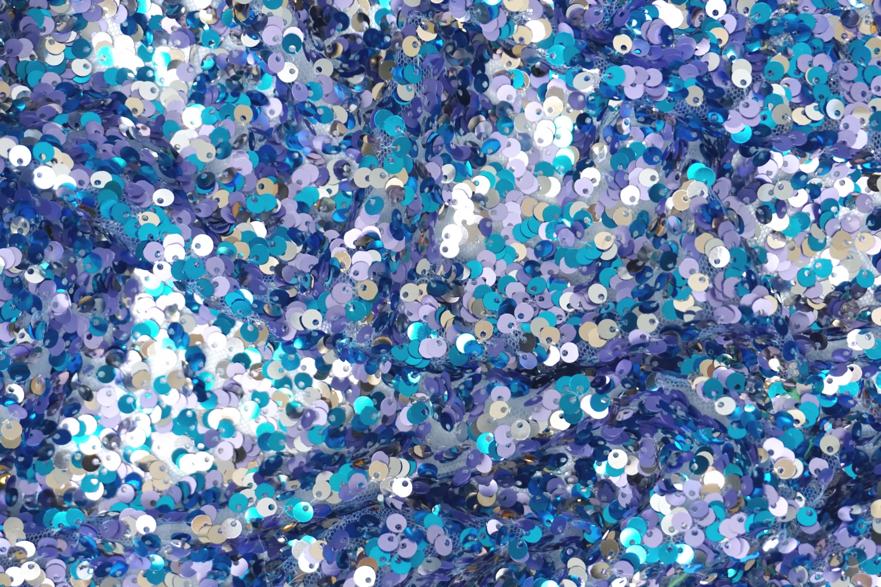 Красивая сетка с пайетками ярко голубого, лилового и серебряного цвета от Carolina Herrera. Ширина пайеток 137 см. В основе мягкая мелкая сетка в голубом цвете. Просвечивает. Тактильно жестковатая за счет пайеток, но пластичная. Отлично тянется. Красива в складках. Прекрасно подойдет для пошива нарядного платья, юбки или костюма. При необходимости используйте подкладочный материал.