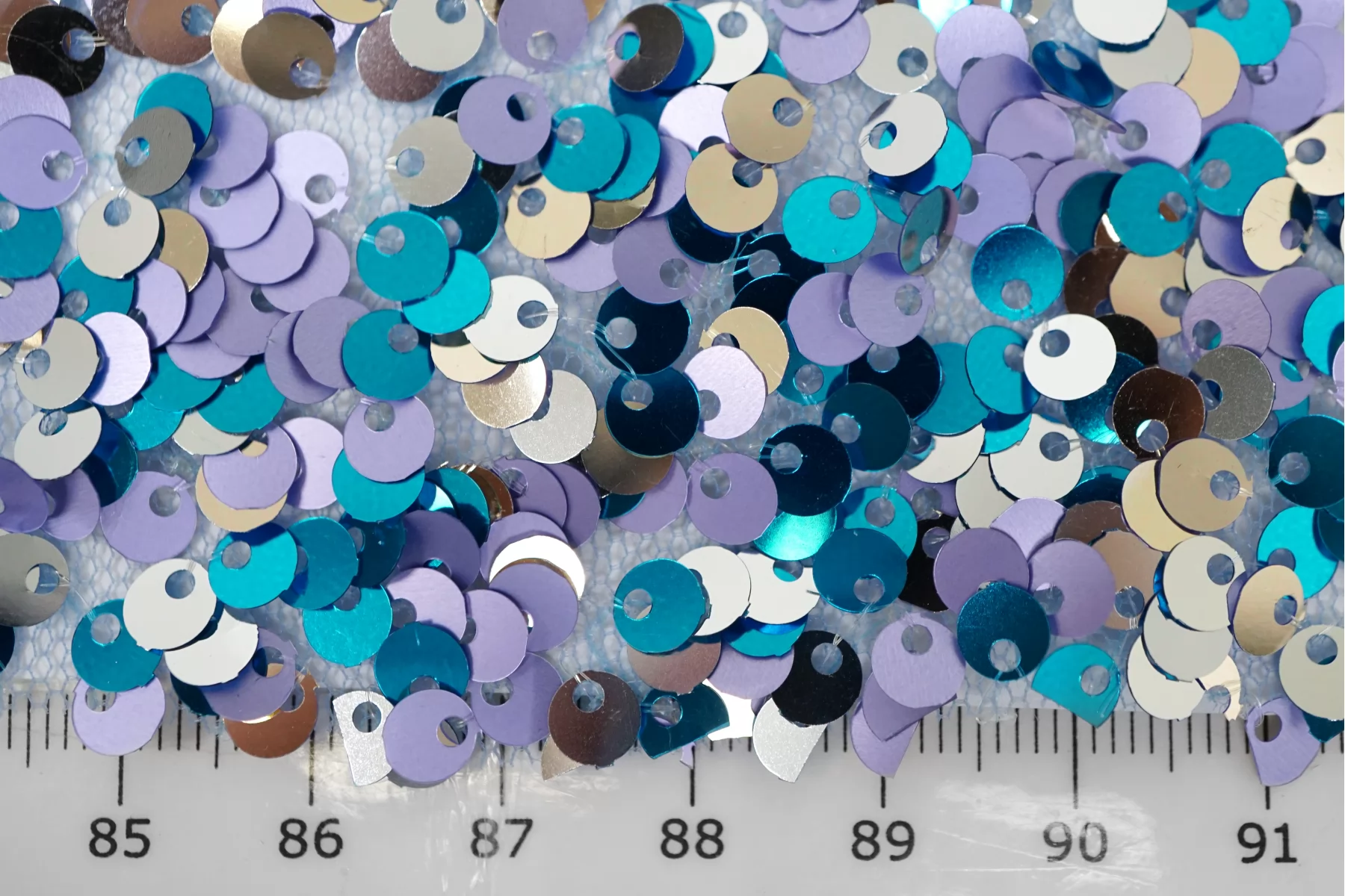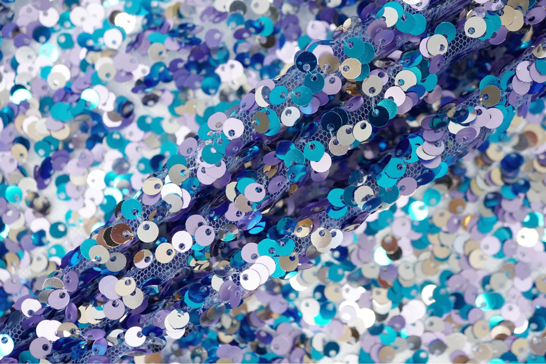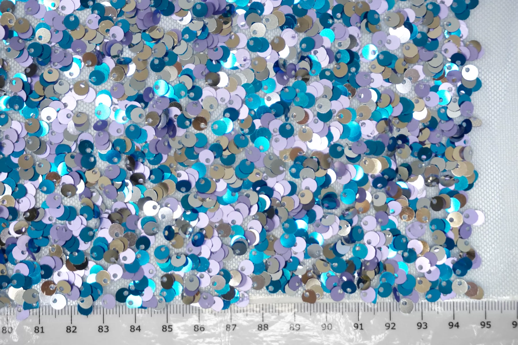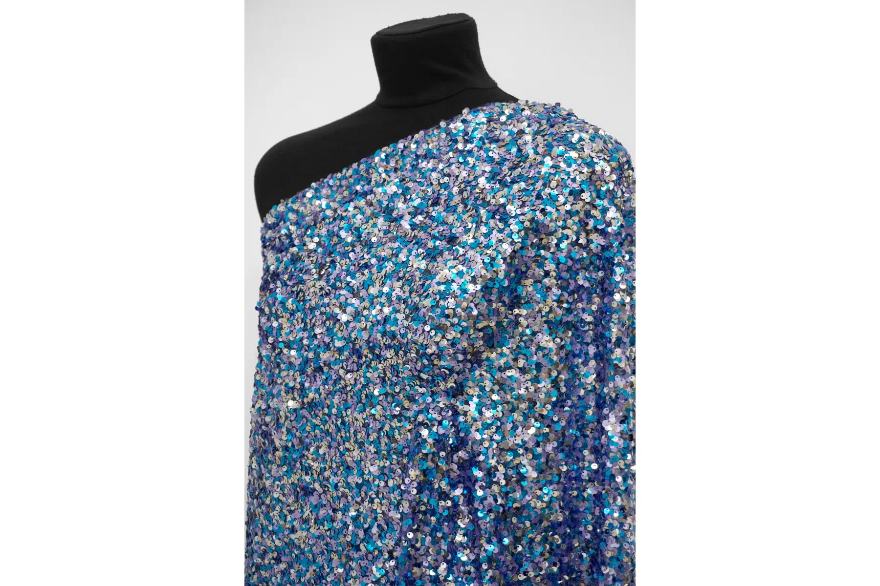 Красивая сетка с пайетками ярко голубого, лилового и серебряного цвета от Carolina Herrera. Ширина пайеток 137 см. В основе мягкая мелкая сетка в голубом цвете. Просвечивает. Тактильно жестковатая за счет пайеток, но пластичная. Отлично тянется. Красива в складках. Прекрасно подойдет для пошива нарядного платья, юбки или костюма. При необходимости используйте подкладочный материал.